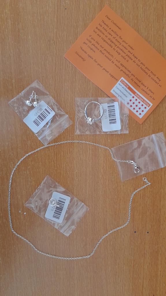 Every piece came in different tiny plastic bag and are very beautiful 🩷 the ring have a size control bellow it, i uploaded a photo to see what i mean