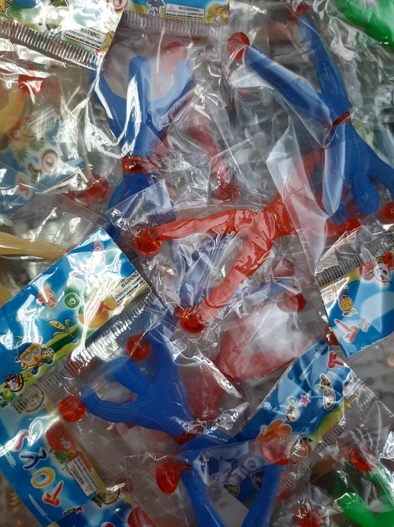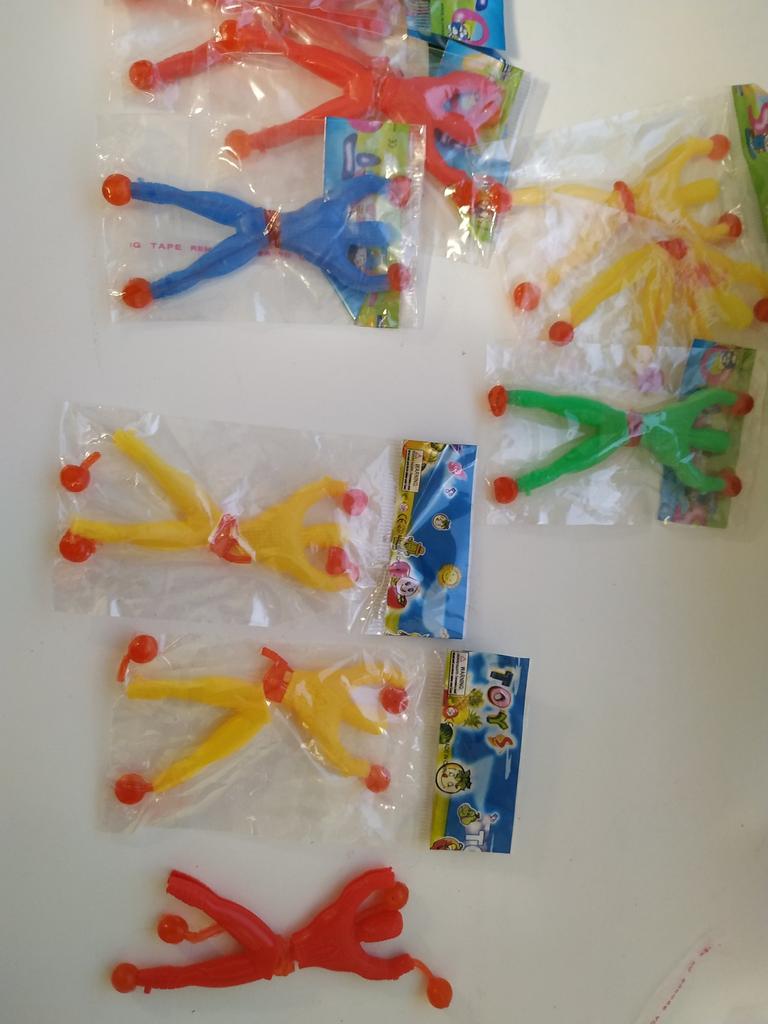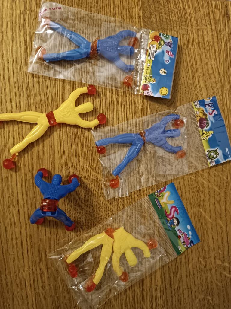 The set contains 3 blue and 2 yellow toys. A little poorly put together. Velcro does not come off. There is no smell.