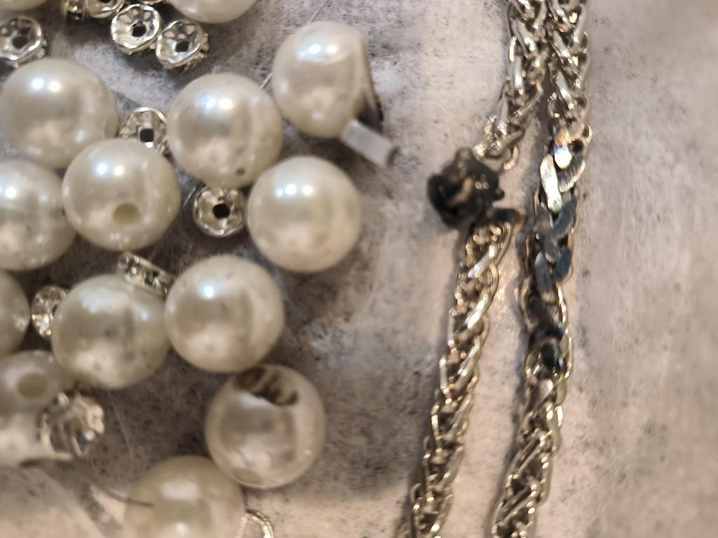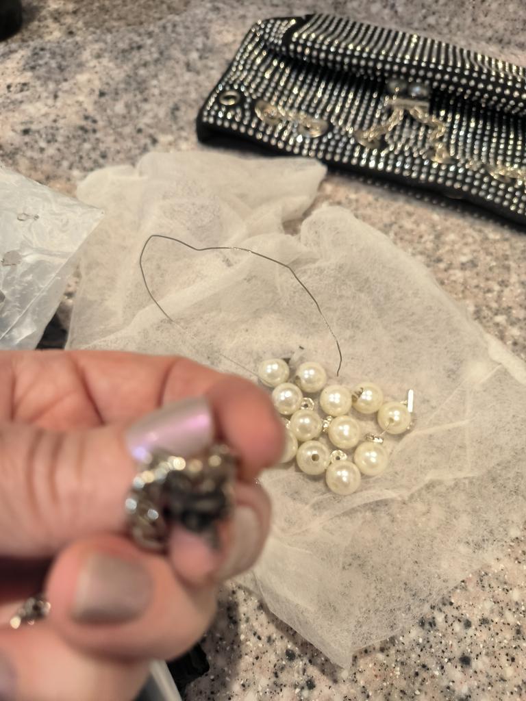 The handbag is not like in the picture. There should be two holes for the handle and chain in the front and two in the back, but there are only two, one on each side. Because of this, the pearl handle hangs crookedly and looks unsightly. One rhinestone is missing from the handle. There are no rhinestones along the seams at all, but in the picture they are all there.