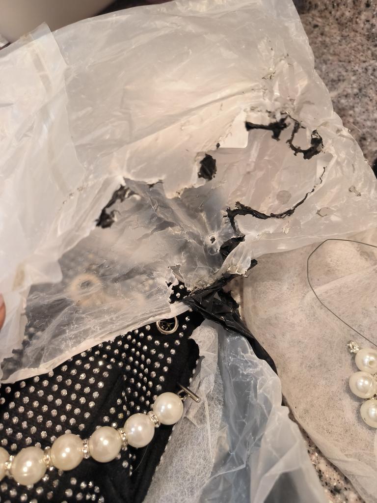 The color that arrived was not the one I ordered, the sides are without rhinestones, there is a scratch near the handle opening, but otherwise it's a very cute little bag
