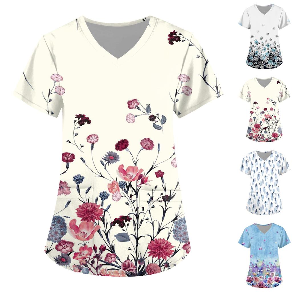 Women's Floral Printing Short Sleeve V-neck Tops Working Uniform Pocket Blouse