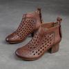 Johnature Hollow Out Boots Round Toe Breathable Back Zipper Genuine Leather Sandals Retro Mid Heel Women's Shoes