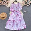 Celebrity Style Bubble Short Sleeve Loose Style Long A-line Printed Ruffle Edge Dress Summer