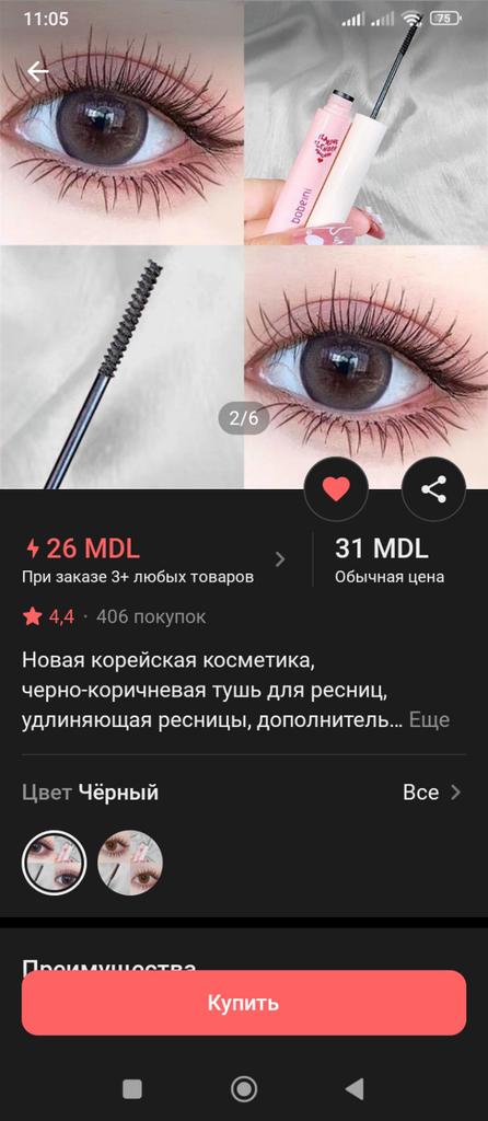 The color is very natural, lengthens, dries slower than regular black mascaras, does not clump and is easy to wash off with water, thanks to the creamy texture it does not stick the eyelashes together much and it is easy to make rays with a brush, I will order more) for light makeup it’s perfect