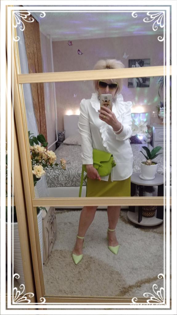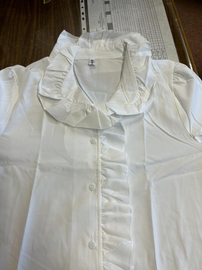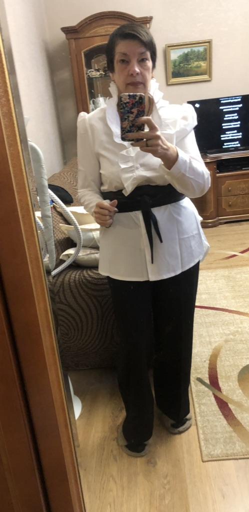 In the photo the blouse is snow-white. It arrived yellowish, as if it was sewn from old, old fabric that had been lying somewhere in a warehouse for many years. And the blouse's size is very large and narrow.