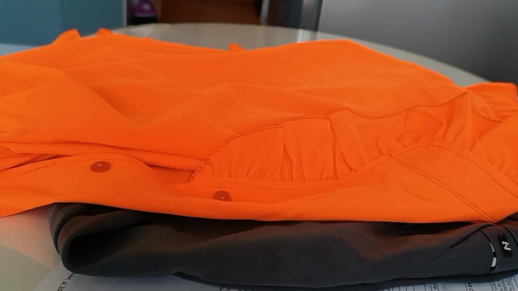 The blouse is great. The orange color is gorgeous, the fabric is pleasant, moderately thin. The sleeves are long, but I always roll up all the sleeves, so no problem. Very pleased!