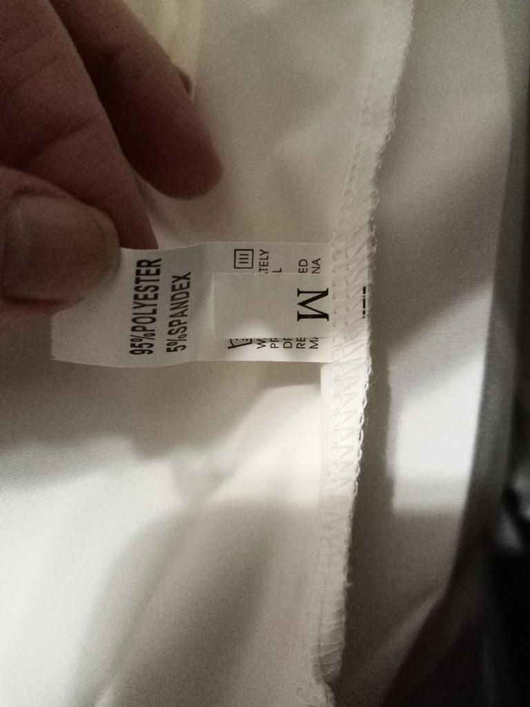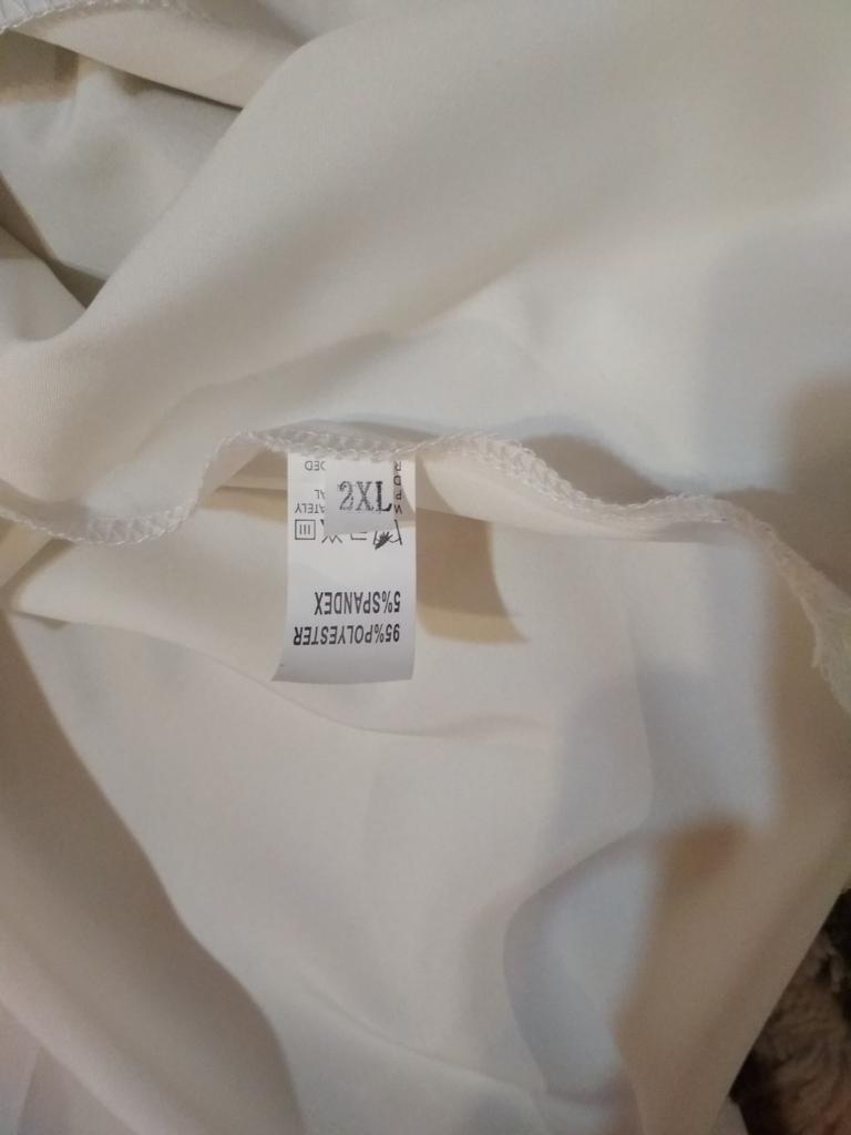 The shirt fits size 44-46. Not quite white, as in the photo. And the fabric is not what it seemed, not cotton