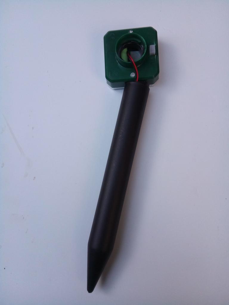 Squeals a lot. It does not scare away cats, birds too. So far there are no moles