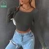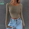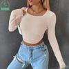 My Wardrobe Authorization Women Long Sleeve Knitted Solid Crop Top Square Neck Fitted Asymmetrical Hem Cropped Tee Shirts