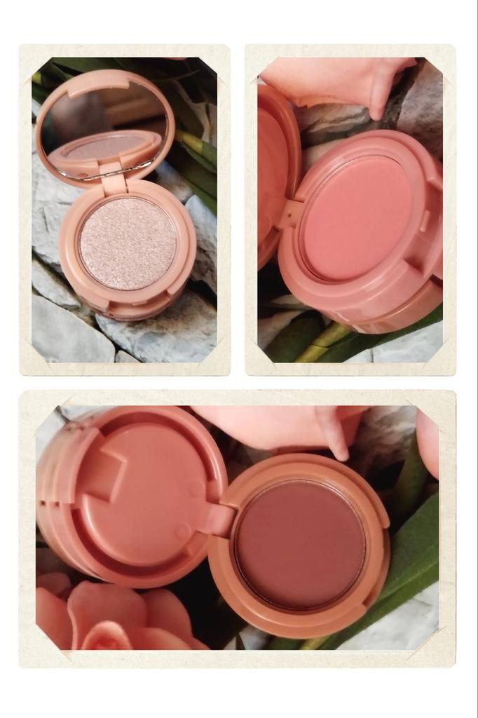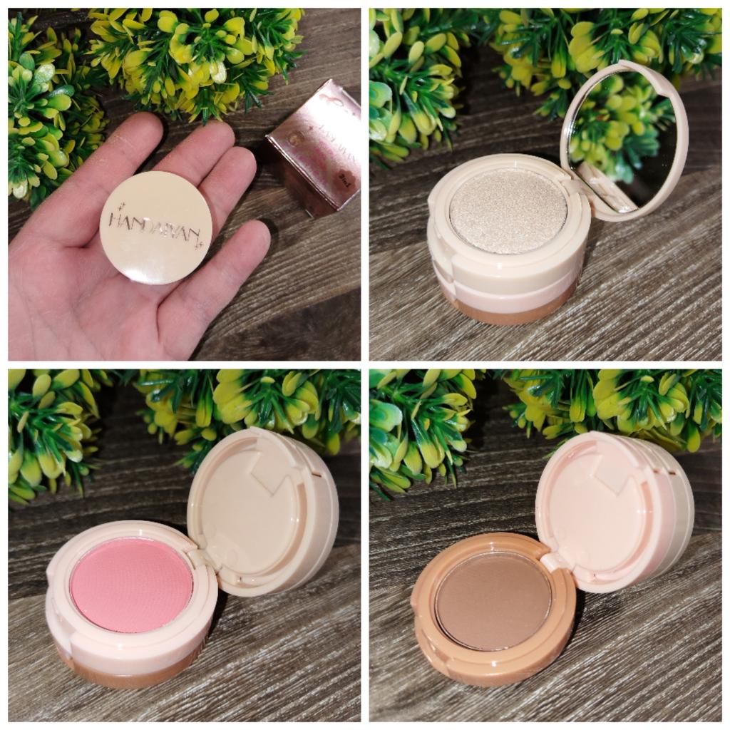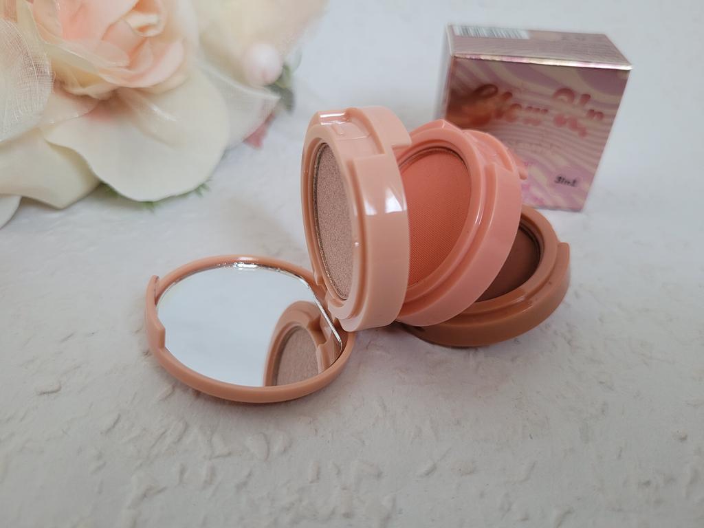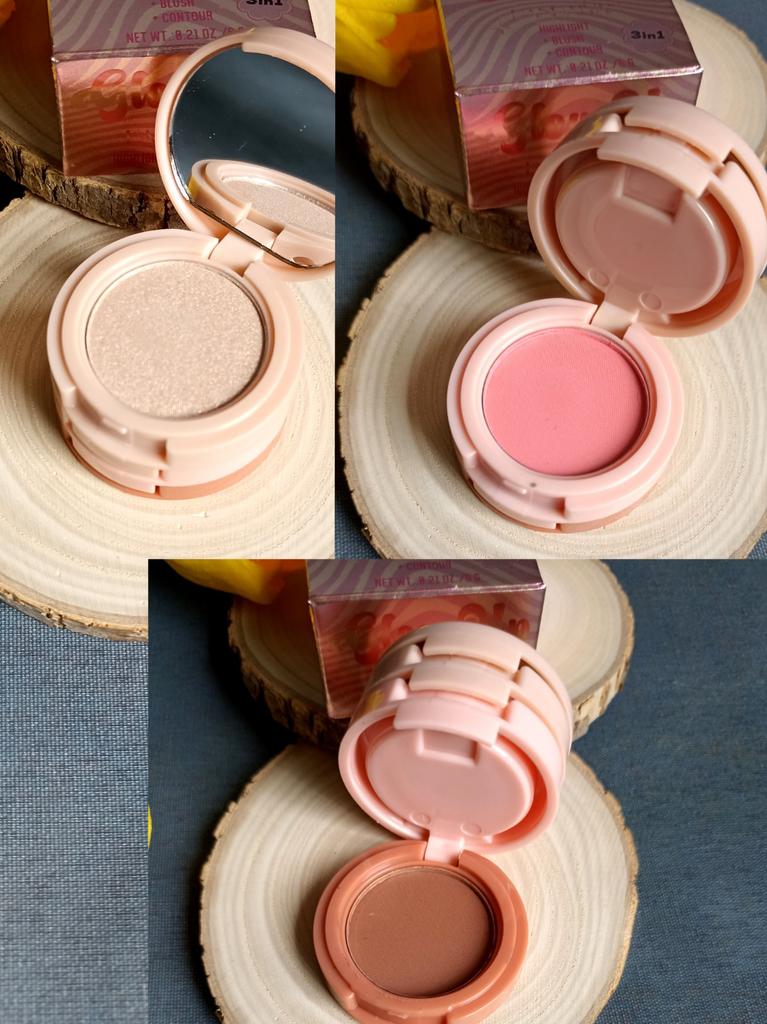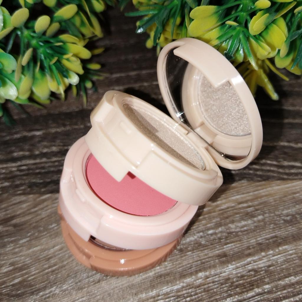 3๏ธโฃ to 1๏ธโฃ โ Highlighter โ Blush โ Bronzer A small round box containing 3 different tools. The box is plastic, miniature. Very convenient to carry in a clutch. There is a mirror. My box is number 1 and I really like the shades. The price is very nice, and the quality is top notch โฅ๏ธ