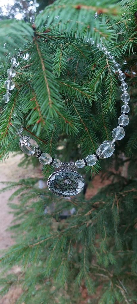 The mineral is called "Mohammed's Beard", quartz with veins of schorl tourmaline. The pendant is unexpectedly large, but very impressive. Thanks to the manufacturer. I am very pleased with the purchase.