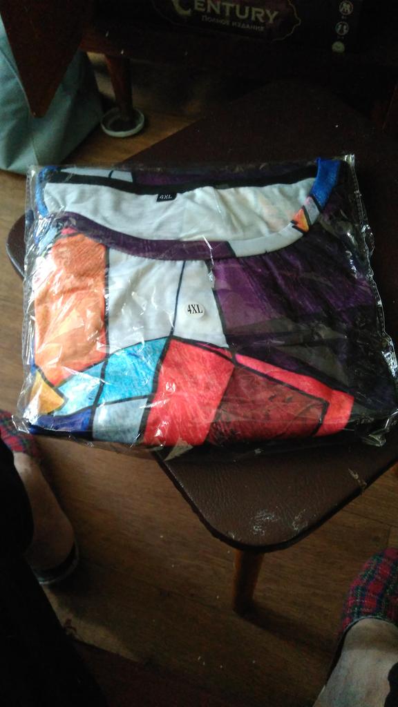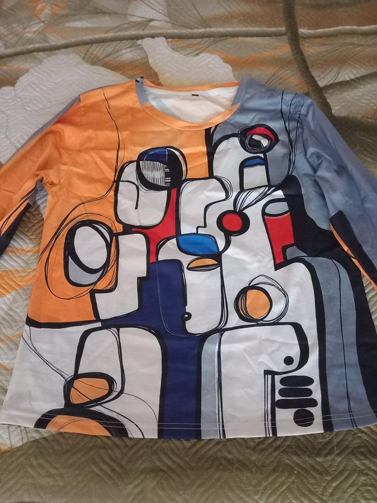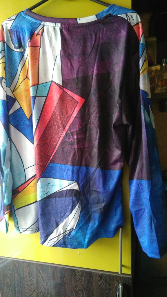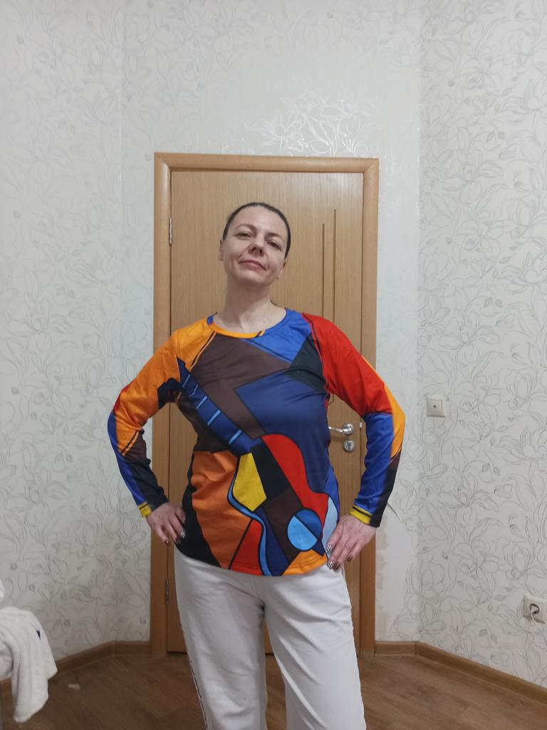 An interesting T-shirt or blouse. But the size is too much. For my circumference 100-85-110 I needed 2XL, it would have been better. Well, that’s not bad. Full length sleeves, simple cut. Everything is as in the description.