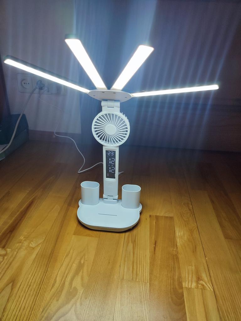 The order arrived in a crumpled box, but everything is intact. The lamp shines weakly, the capacity for pencils with too low walls is impractical. It has three light positions.
