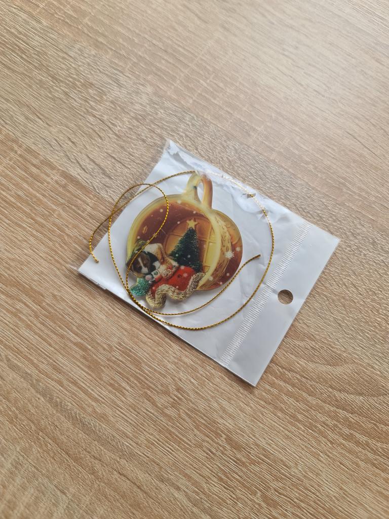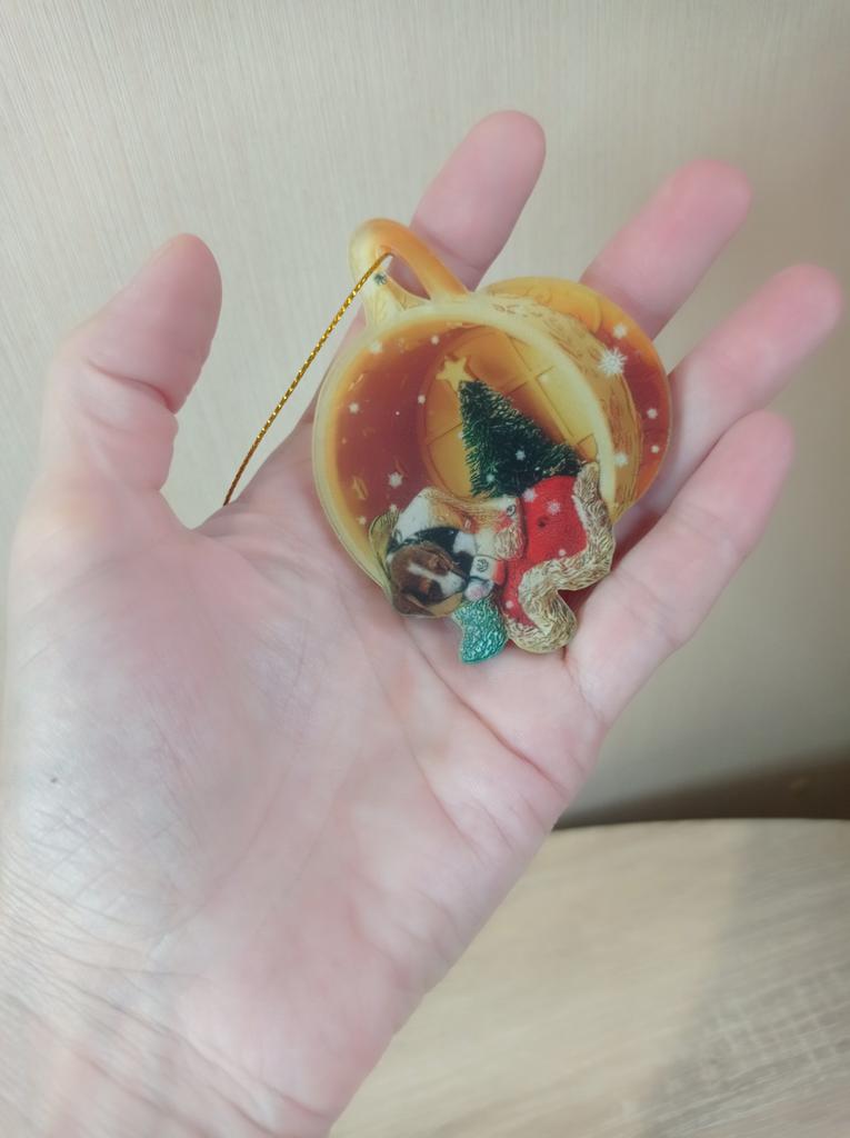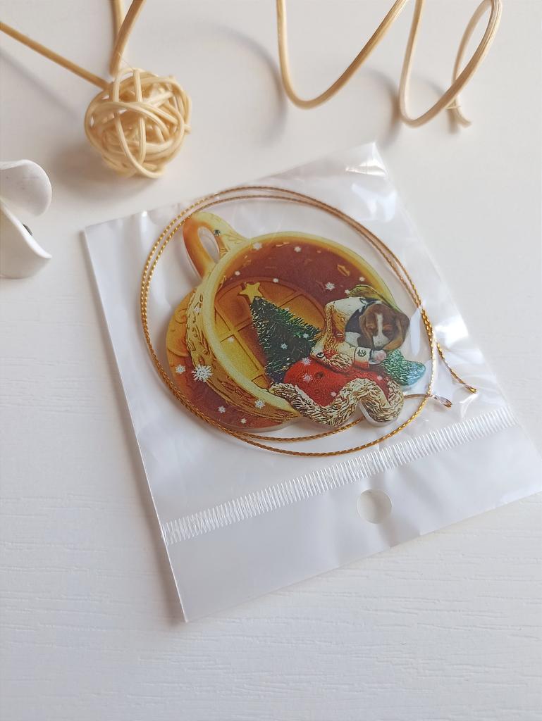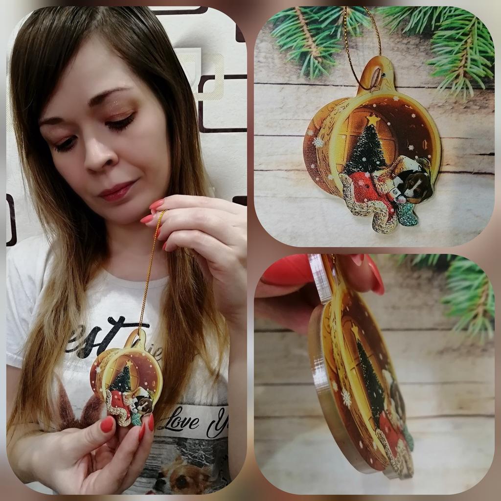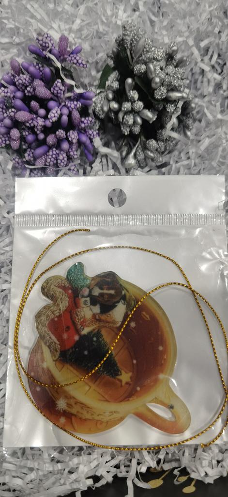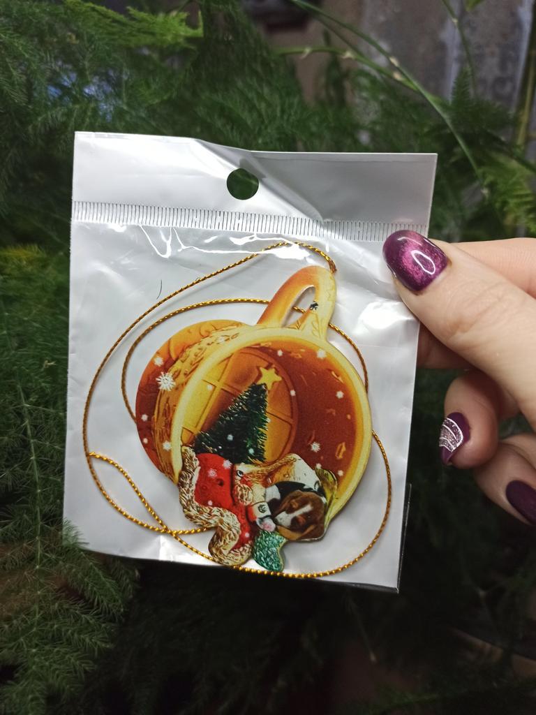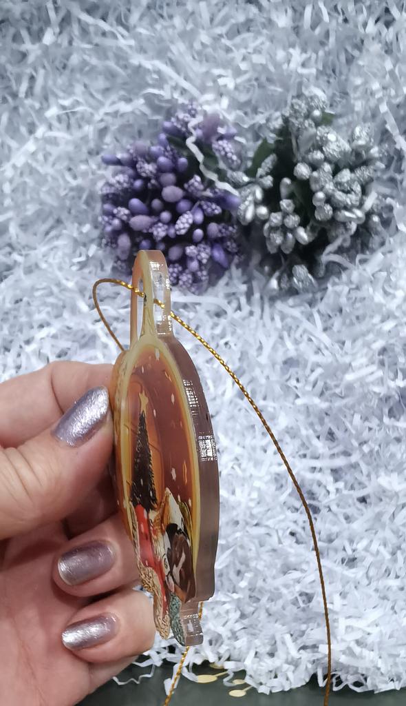 Christmas toy. I thought the toy was three-dimensional, but it is flat.))) Toy size 6*7 cm Double-sided pattern. Includes gold rope. The drawing is clear and beautiful. The toy is made of acrylic. There will be a New Year's decoration on the tree