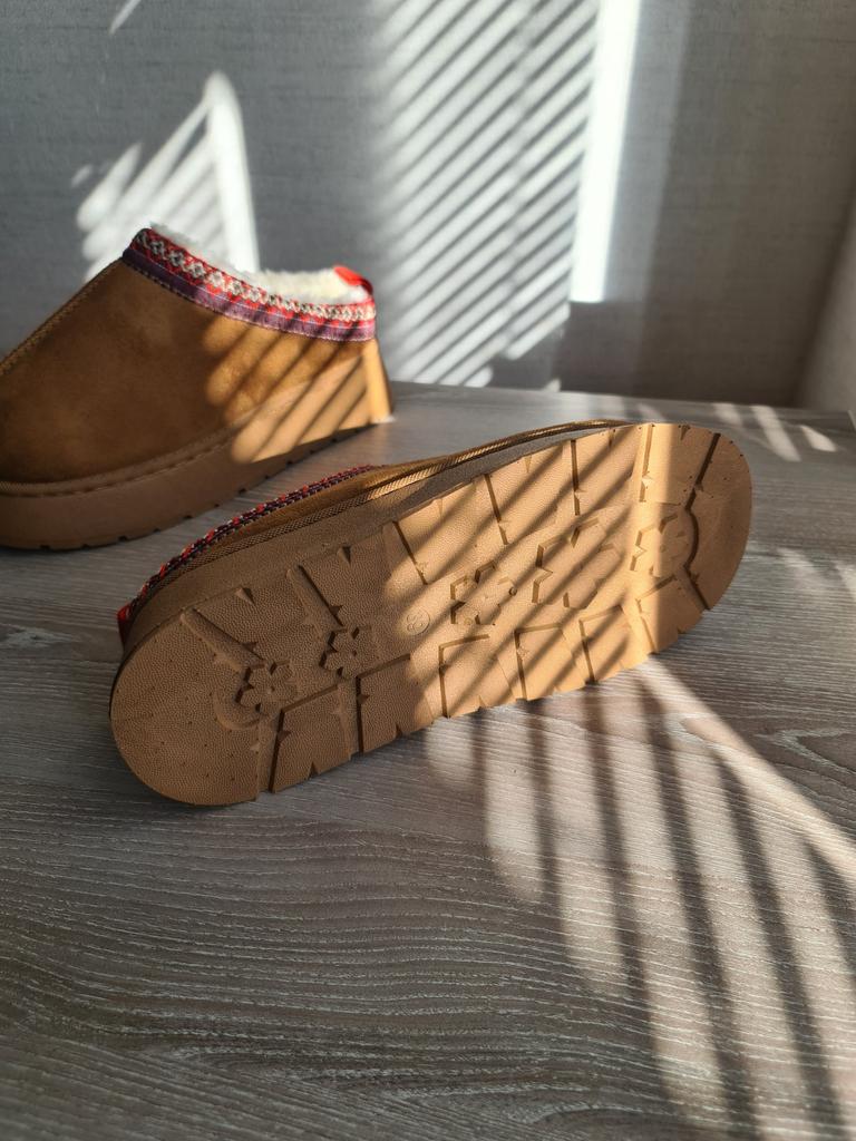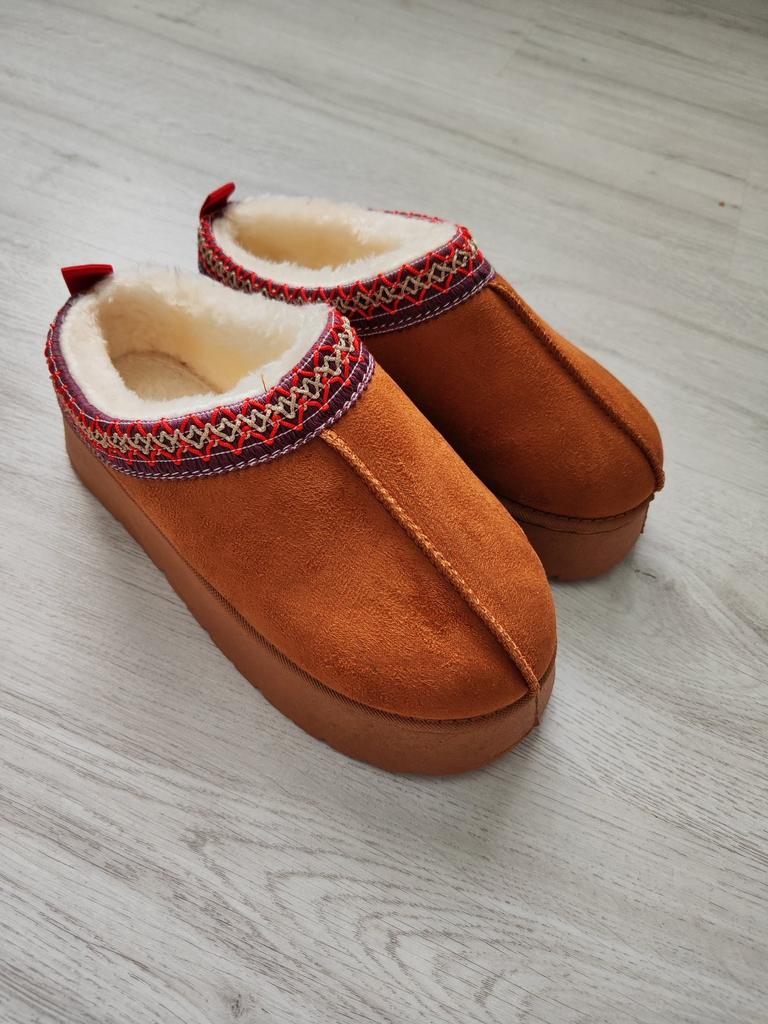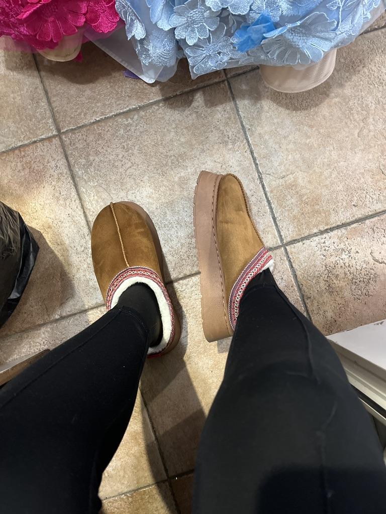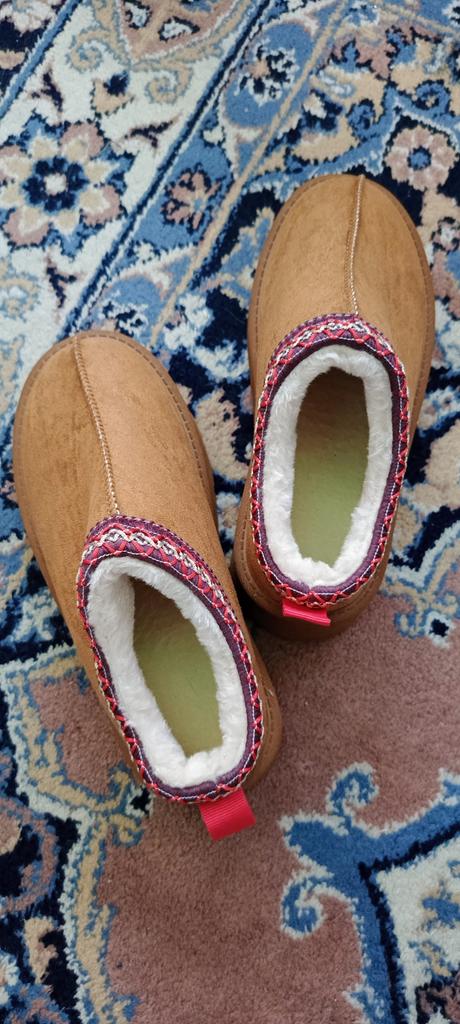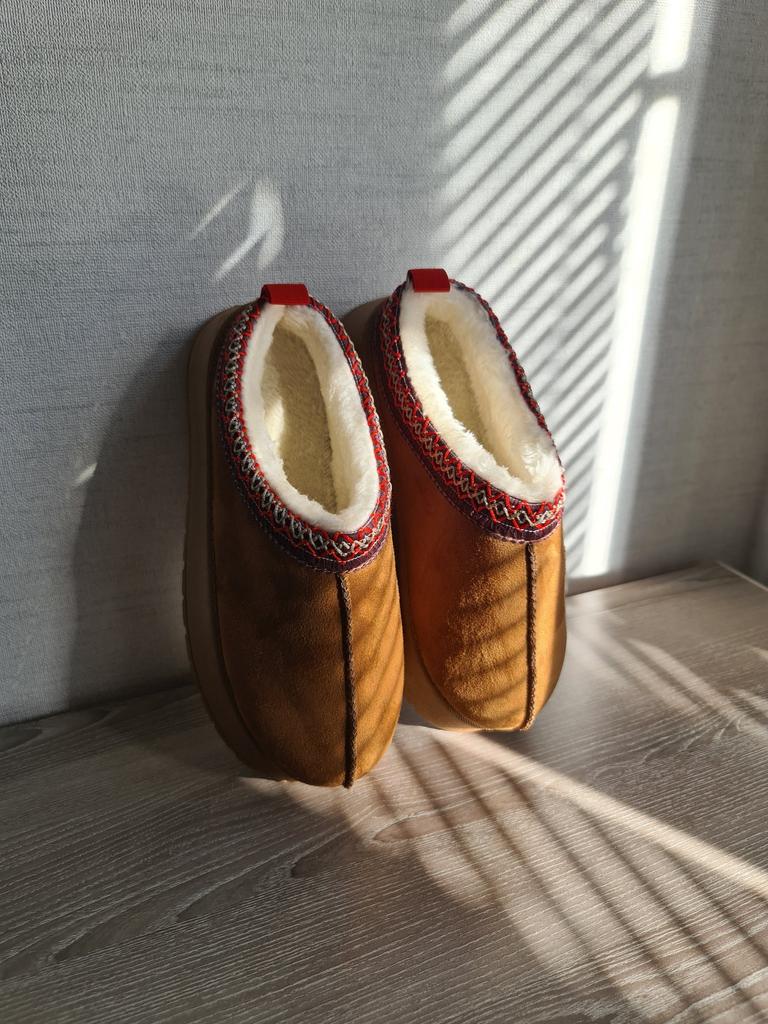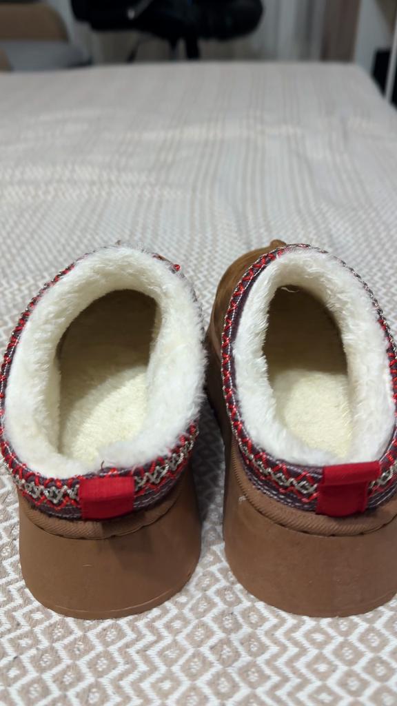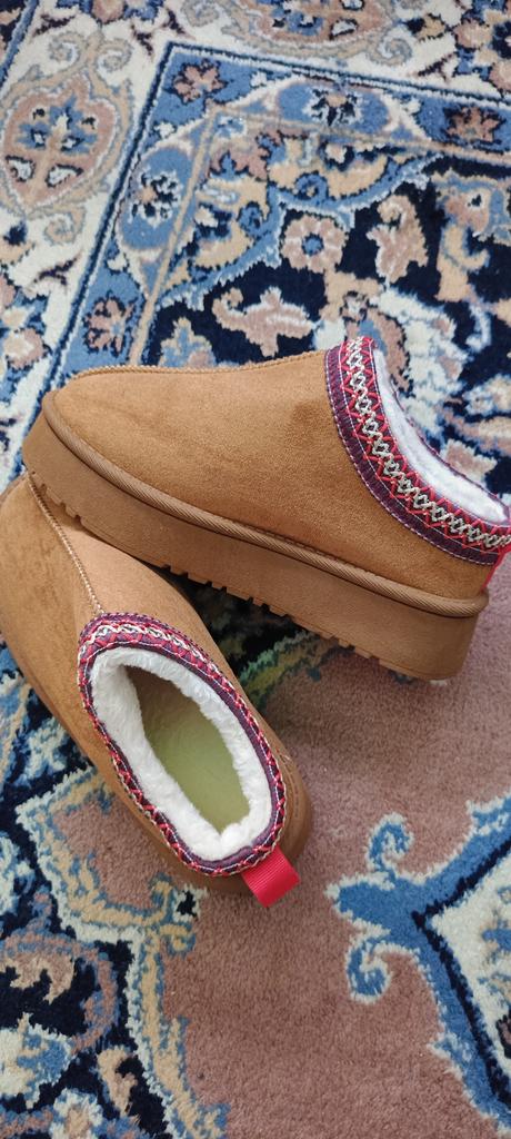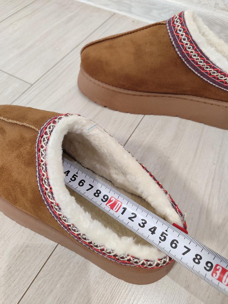 * Platform slippers with teddy fur in UGG - STYLE* 💥𝗟𝗶𝗲𝗳𝗲𝗿𝘇𝗲𝗶𝘁 15 DAYS to Germany 💥𝗟𝗶𝗲𝗳𝗲𝗿𝘂𝗺𝗳𝗮𝗻𝗴 The delivery includes 1 pair of shoes in the corresponding color and size. The shoes are available in three different colors (khaki, black and brown) in sizes 35 to 42. I ordered the shoes in size 41 in brown. I normally wear a size 40, but these shoes run a little smaller... 💥𝗤𝘂𝗮𝗹𝗶𝘁ä𝘁 I was impressed by the quality of the shoes... there are no threads sticking out or any glue residue sticking out. The shoes are really well made. There is also teddy fur on the inside. From the outside there is a beautiful decorative border in indie - hippie style. They remind you a little of the classic ugg boots. I would only wear these shoes as slippers. They are really an eye-catcher and are very comfortable. I particularly like the platform sole and the cuddly soft teddy fur. For material composition : Unknown It could be that the upper material is made of suede. 💥𝗙𝗮𝘇𝗶𝘁 Mega beautiful platform boots with teddy fur. They are really well made, but I recommend ordering 1 size larger!