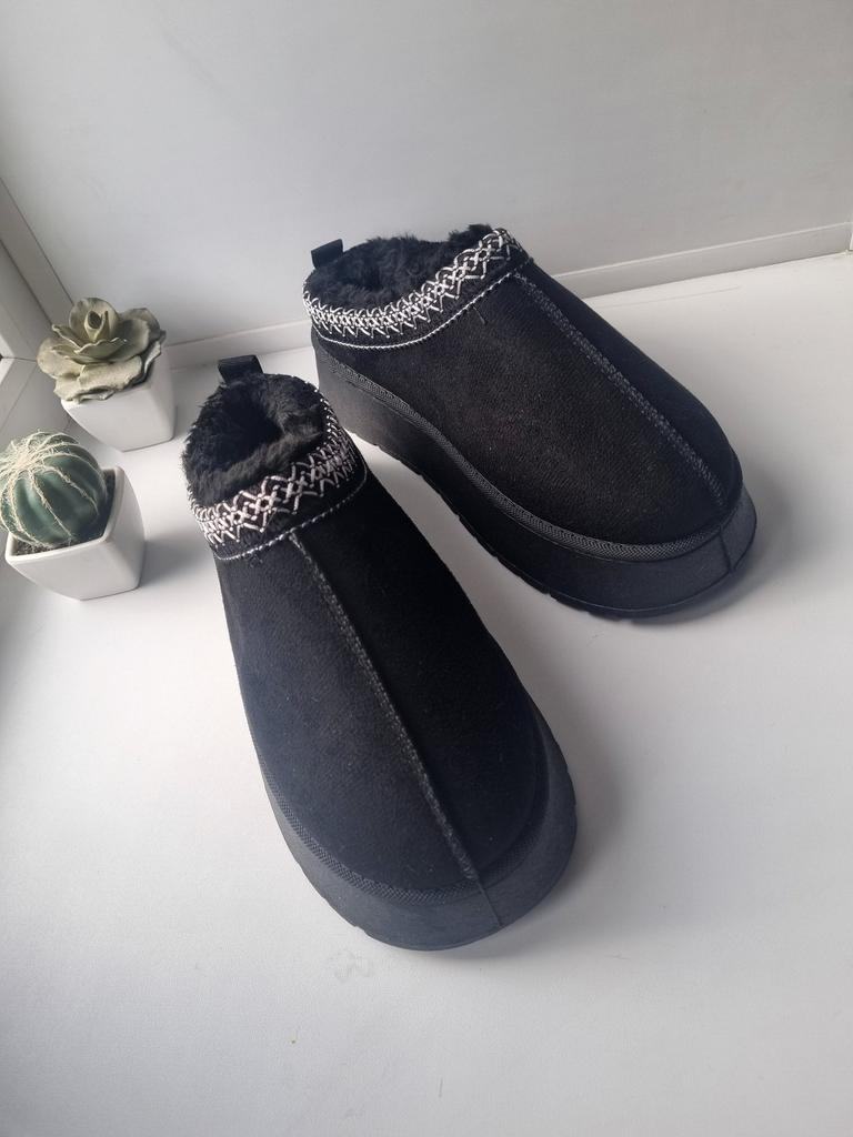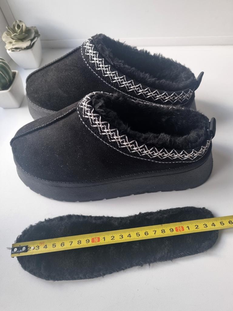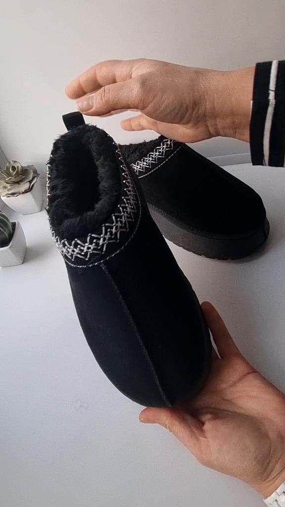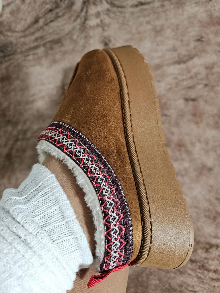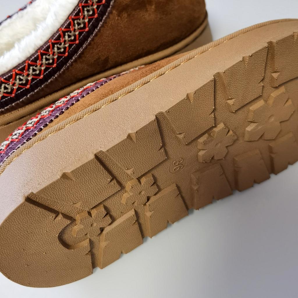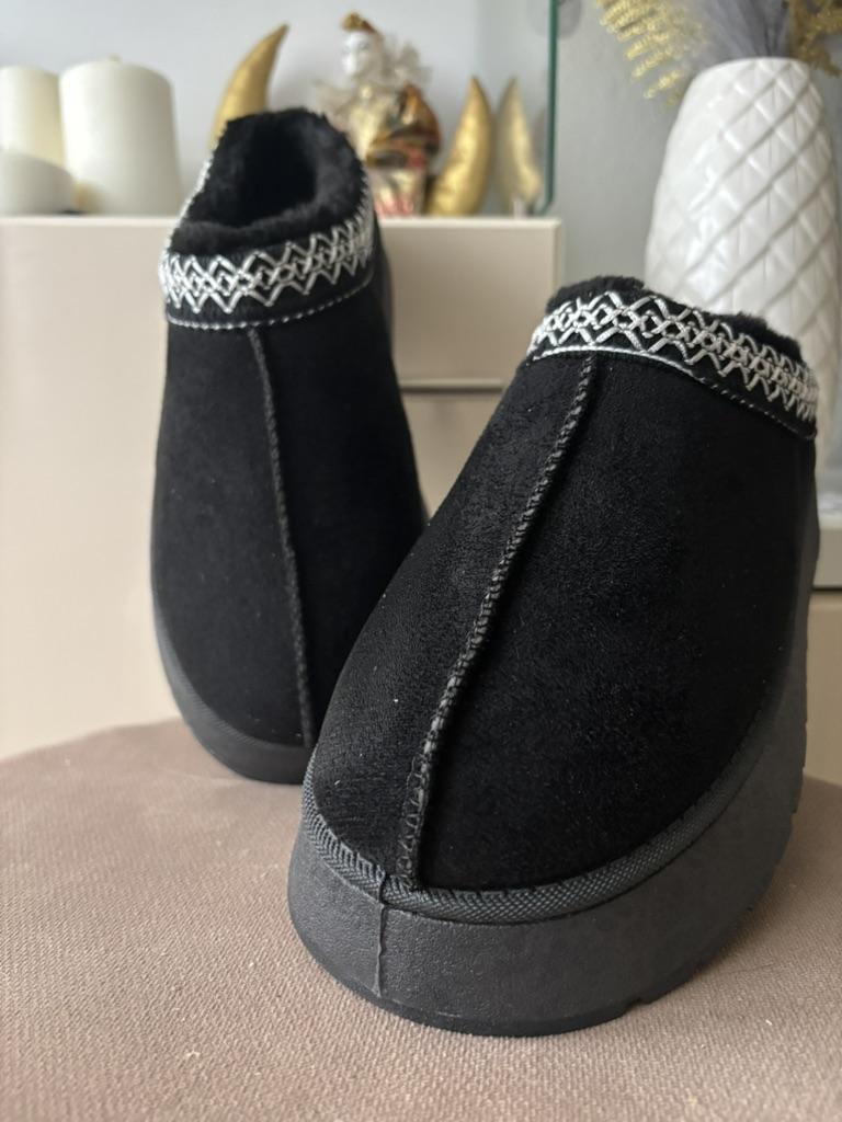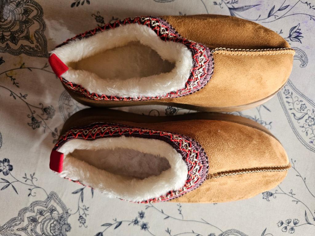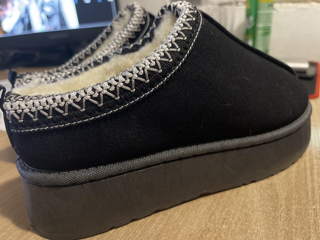 * Platform slippers with teddy fur in UGG - STYLE* 💥𝗟𝗶𝗲𝗳𝗲𝗿𝘇𝗲𝗶𝘁 15 DAYS to Germany 💥𝗟𝗶𝗲𝗳𝗲𝗿𝘂𝗺𝗳𝗮𝗻𝗴 The delivery includes 1 pair of shoes in the corresponding color and size. The shoes are available in three different colors (khaki, black and brown) in sizes 35 to 42. I ordered the shoes in size 41 in brown. I normally wear a size 40, but these shoes run a little smaller... 💥𝗤𝘂𝗮𝗹𝗶𝘁ä𝘁 I was impressed by the quality of the shoes... there are no threads sticking out or any glue residue sticking out. The shoes are really well made. There is also teddy fur on the inside. From the outside there is a beautiful decorative border in indie - hippie style. They remind you a little of the classic ugg boots. I would only wear these shoes as slippers. They are really an eye-catcher and are very comfortable. I particularly like the platform sole and the cuddly soft teddy fur. For material composition : Unknown It could be that the upper material is made of suede. 💥𝗙𝗮𝘇𝗶𝘁 Mega beautiful platform boots with teddy fur. They are really well made, but I recommend ordering 1 size larger!