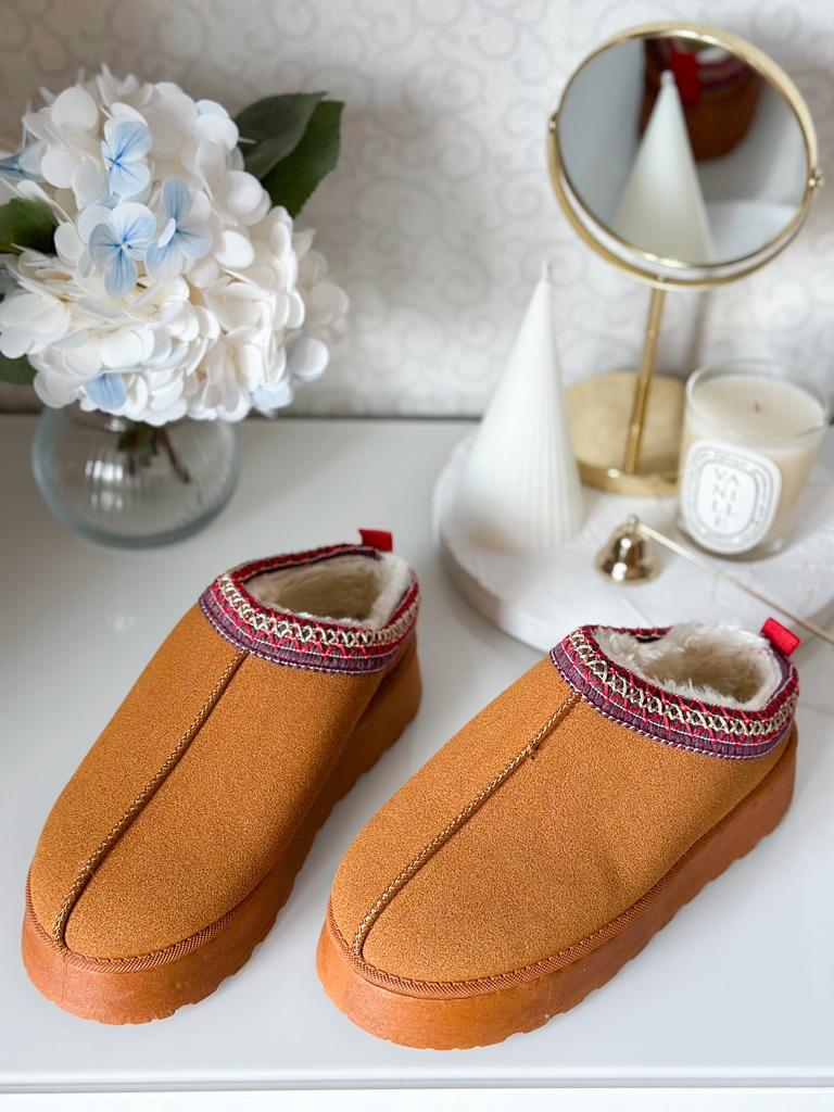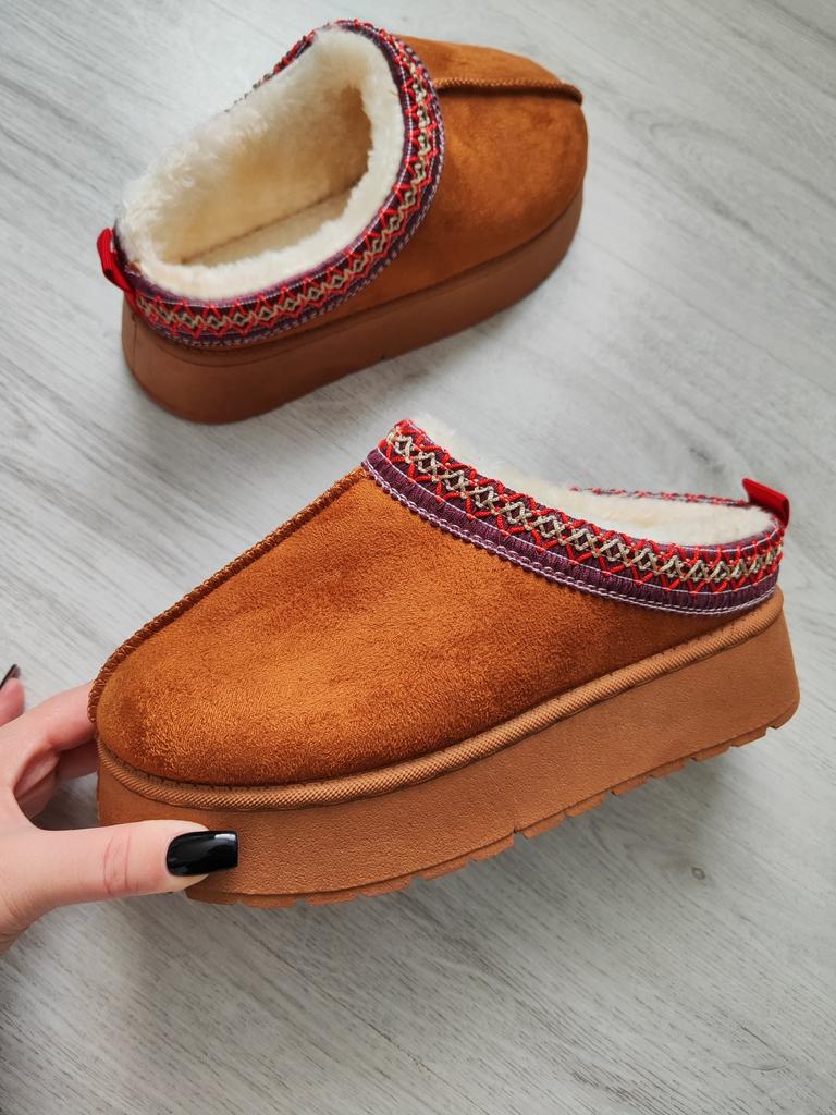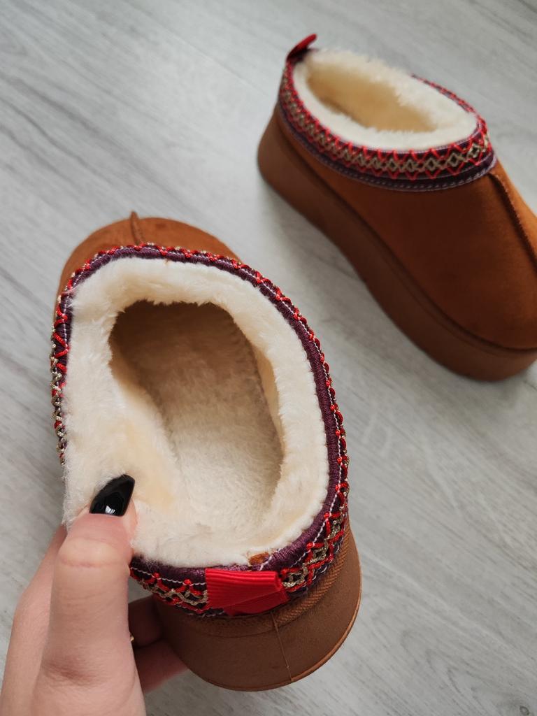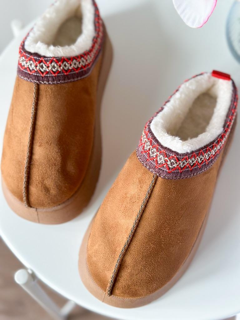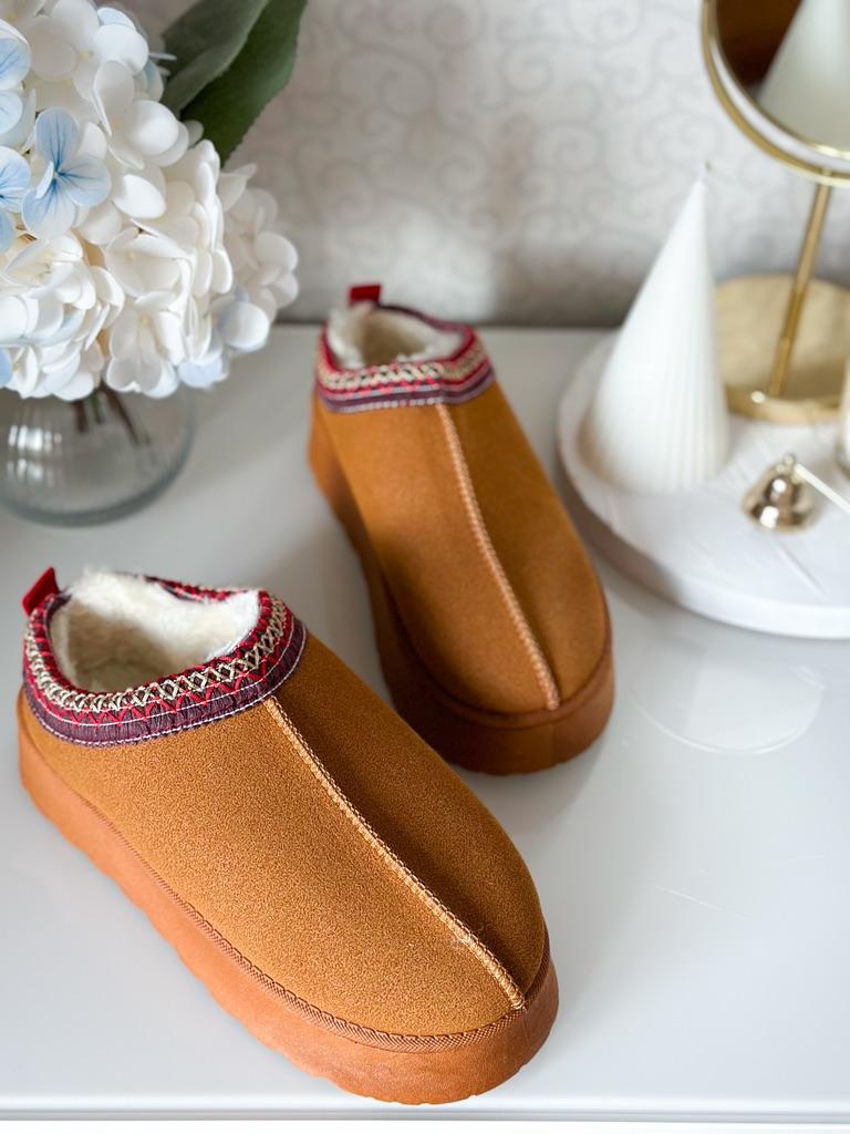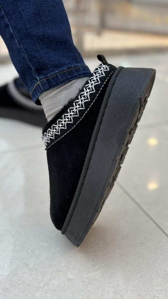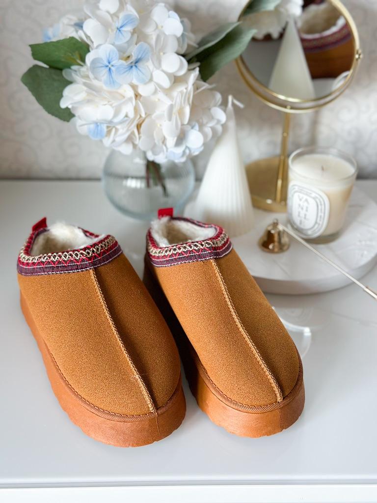* Platform slippers with teddy fur in UGG - STYLE* 💥𝗟𝗶𝗲𝗳𝗲𝗿𝘇𝗲𝗶𝘁 15 DAYS to Germany 💥𝗟𝗶𝗲𝗳𝗲𝗿𝘂𝗺𝗳𝗮𝗻𝗴 The delivery includes 1 pair of shoes in the corresponding color and size. The shoes are available in three different colors (khaki, black and brown) in sizes 35 to 42. I ordered the shoes in size 41 in brown. I normally wear a size 40, but these shoes run a little smaller... 💥𝗤𝘂𝗮𝗹𝗶𝘁ä𝘁 I was impressed by the quality of the shoes... there are no threads sticking out or any glue residue sticking out. The shoes are really well made. There is also teddy fur on the inside. From the outside there is a beautiful decorative border in indie - hippie style. They remind you a little of the classic ugg boots. I would only wear these shoes as slippers. They are really an eye-catcher and are very comfortable. I particularly like the platform sole and the cuddly soft teddy fur. For material composition : Unknown It could be that the upper material is made of suede. 💥𝗙𝗮𝘇𝗶𝘁 Mega beautiful platform boots with teddy fur. They are really well made, but I recommend ordering 1 size larger!