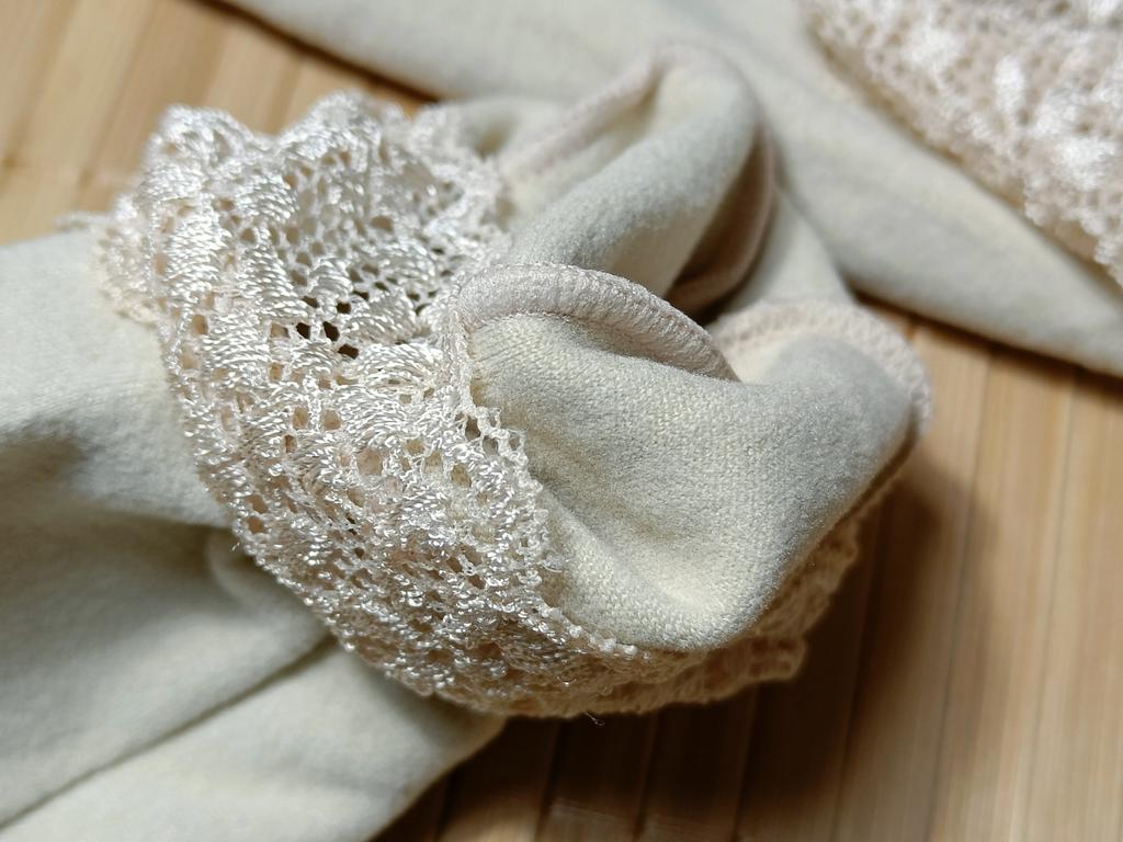 Tactile, thin fleece around the edge, lace is sewn on instead of elastic. Comfortable for full legs. Everything is high quality