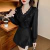 V-neck Long Sleeve Pleated Ruffled Lace Blouse 2023 Elegant Women Sweet Simple Chiffon Shirt Ladies Casual Loose Top Mujer 29723