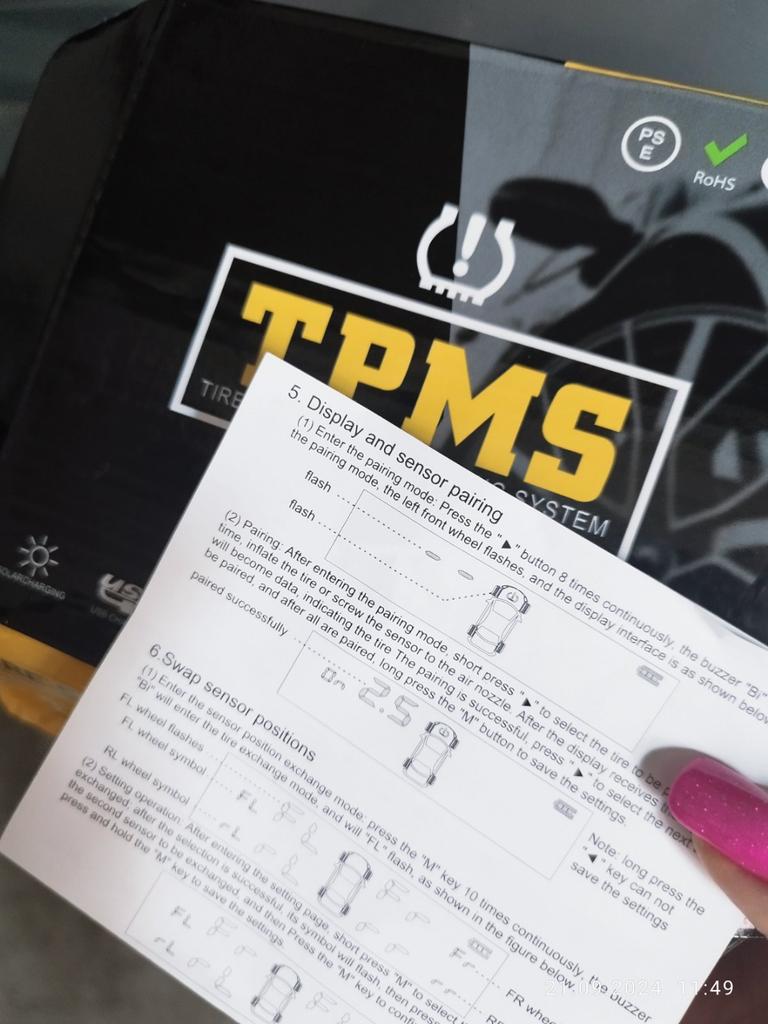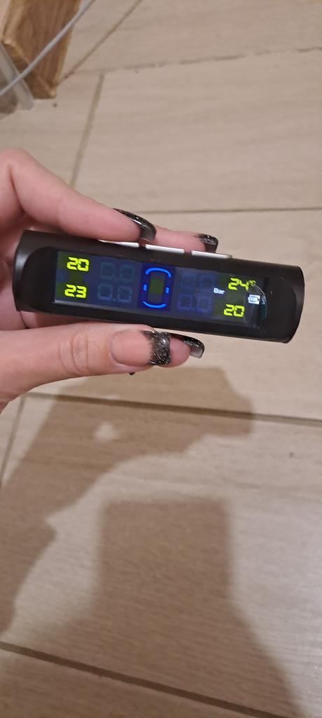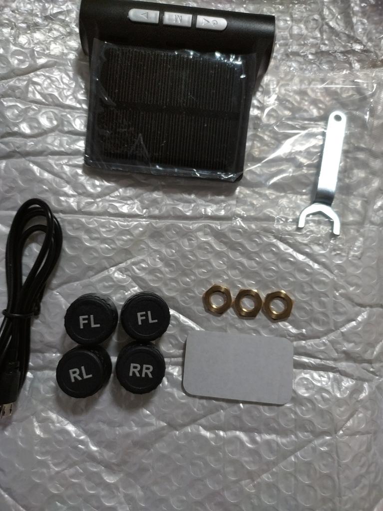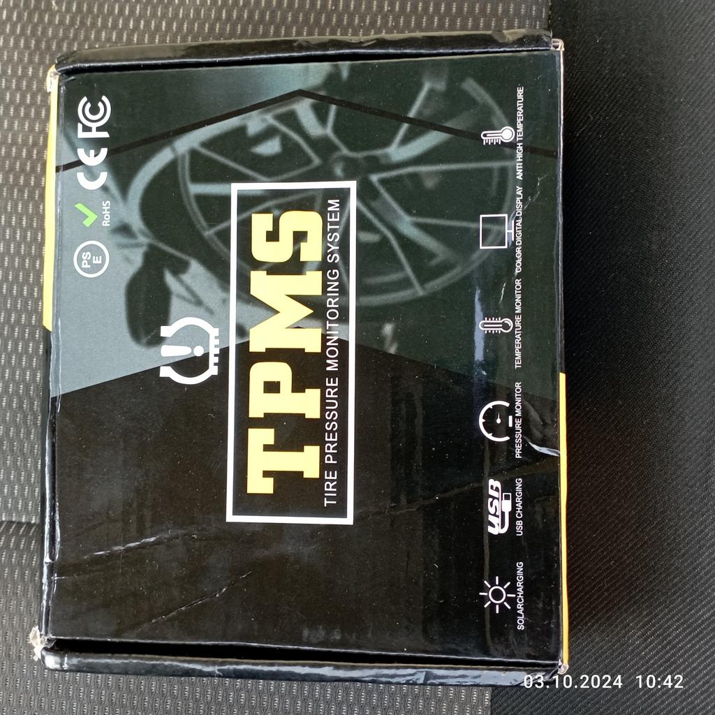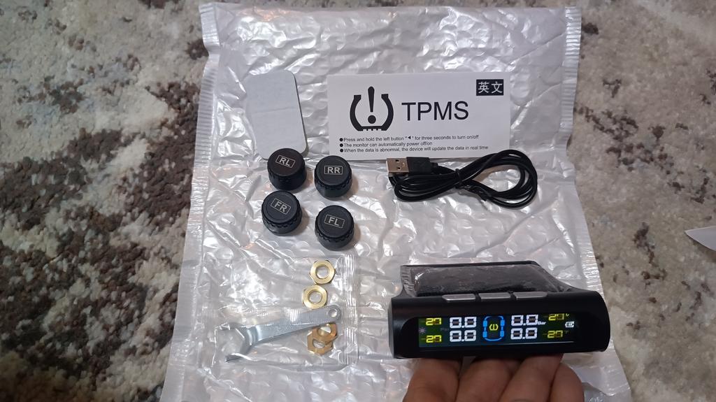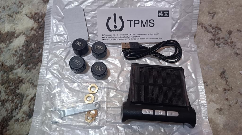 Tire pressure monitor, installed and connected everything works, instructions in English but simple settings. You can easily set the pressure min. max. and convert the temperature to Celsius. I checked the pressure sensors and they are not lying. Do not mix them up.