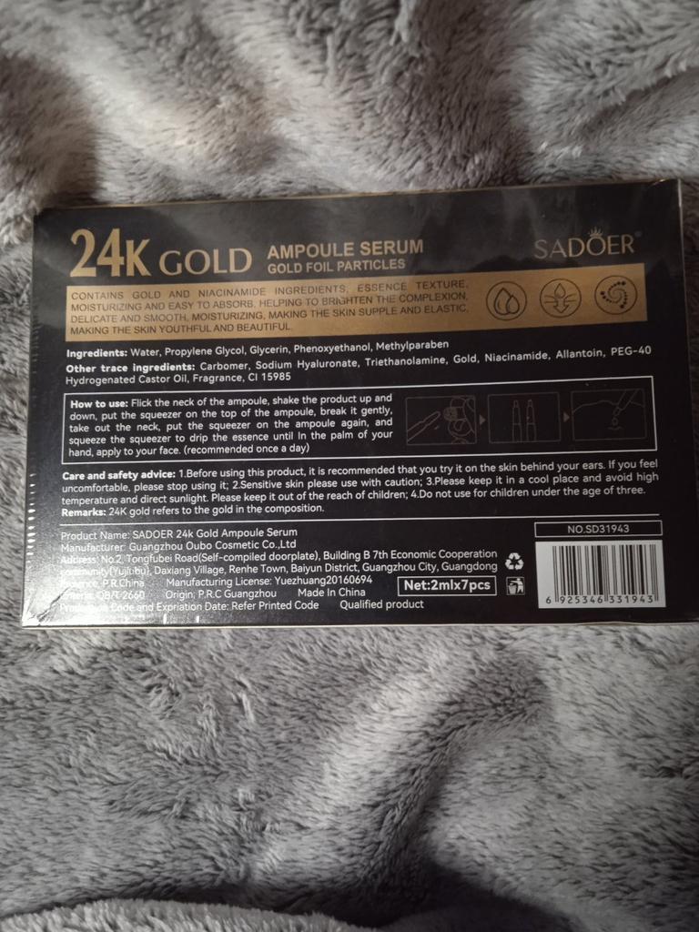 water,carbomer, sodium hyaluronate,gold, niacinamide, allantoin,vitamin c