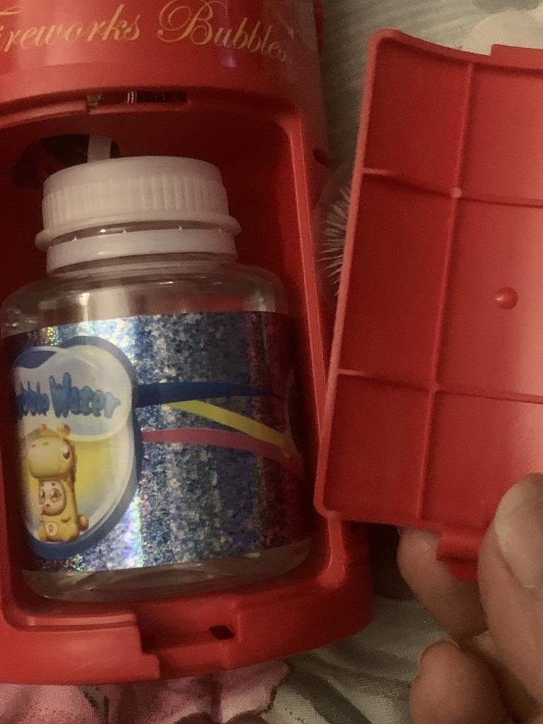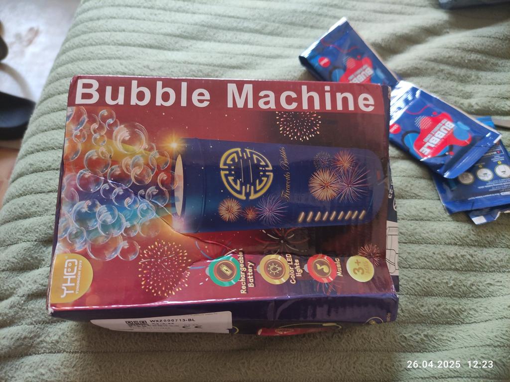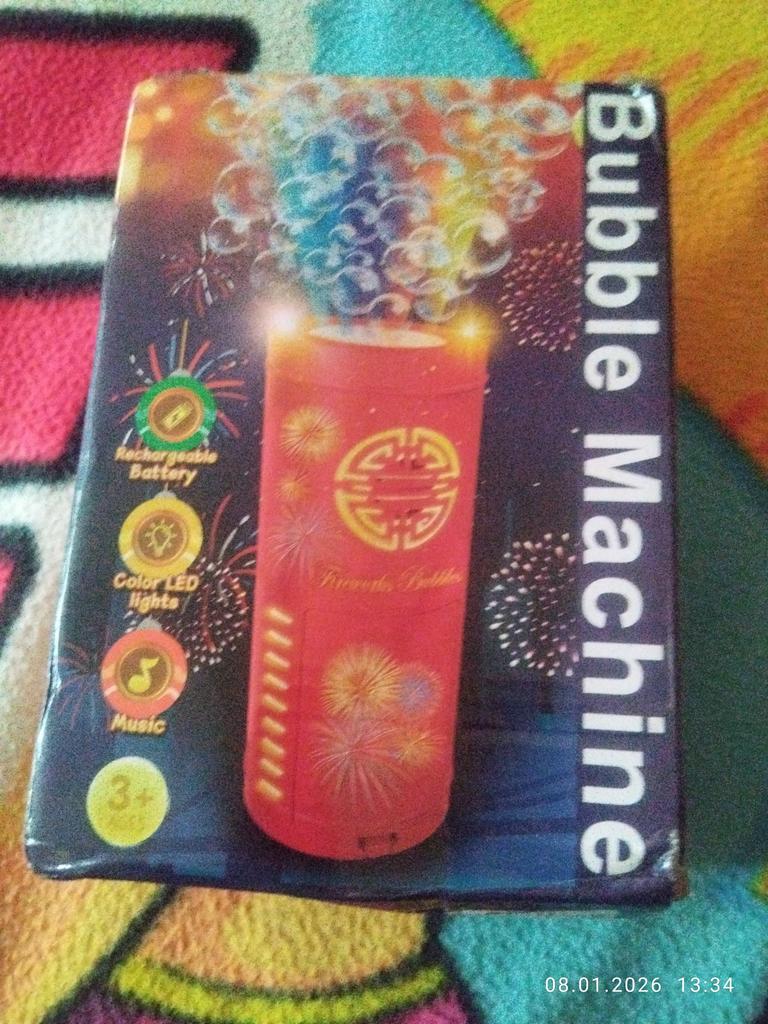 It's a very cool thing, the children are delighted, but the music is too loud and too loud, but still the bubbles fly out, you don't need to blow them especially for smaller children 1-3 years old, when even they pour the solution, then the problem is solved, they put a higher one and the children are happy to run They poured the usual solution, everything works, but the one that was in the kit needs to be diluted with water