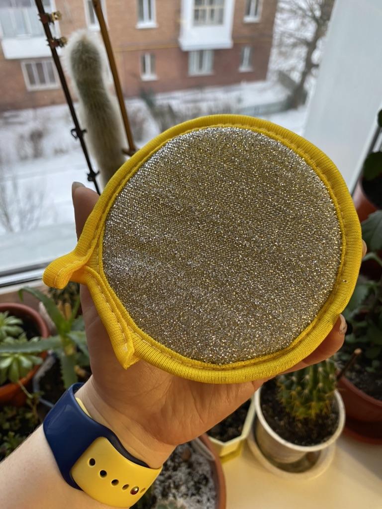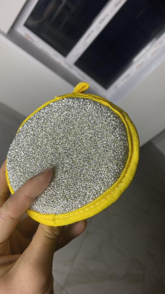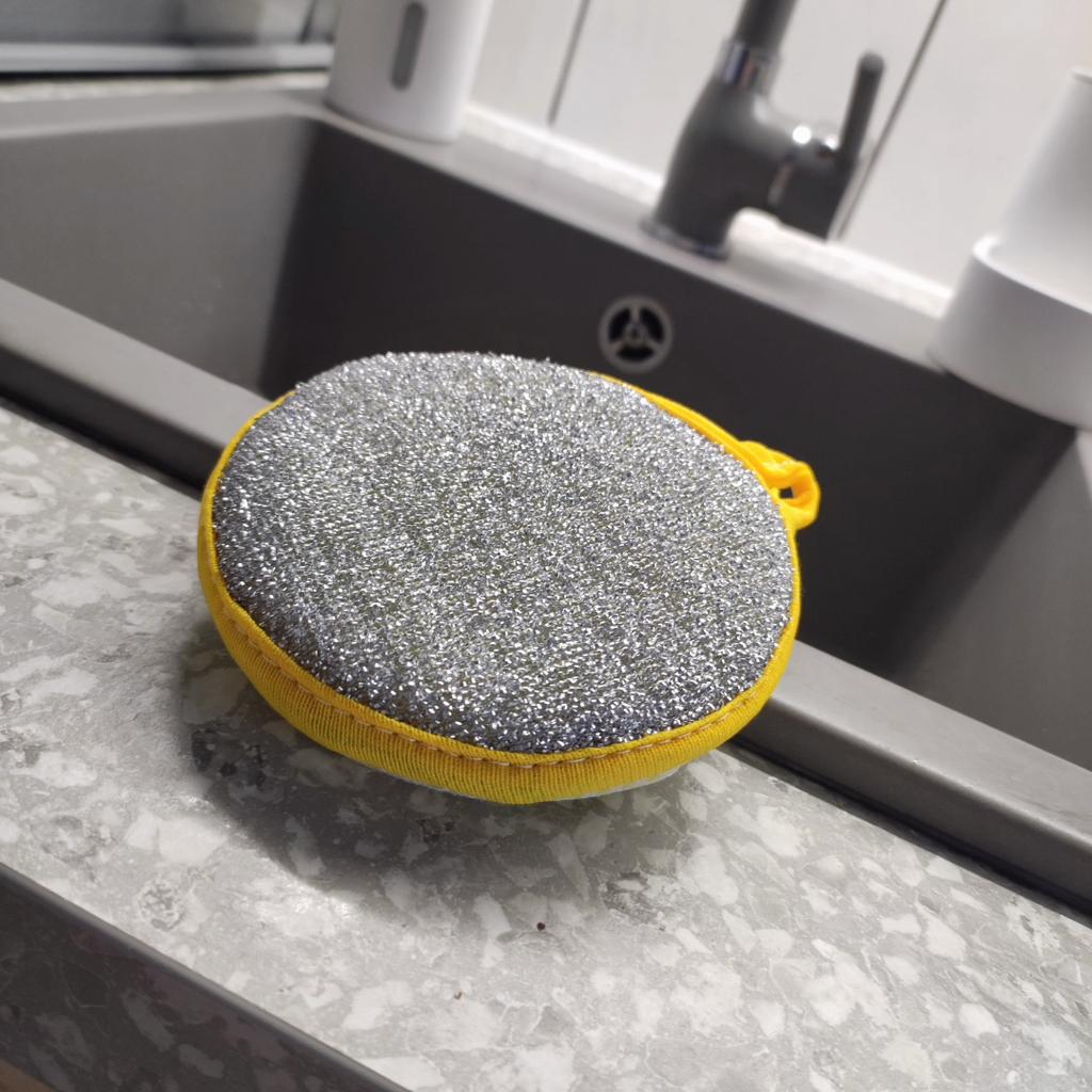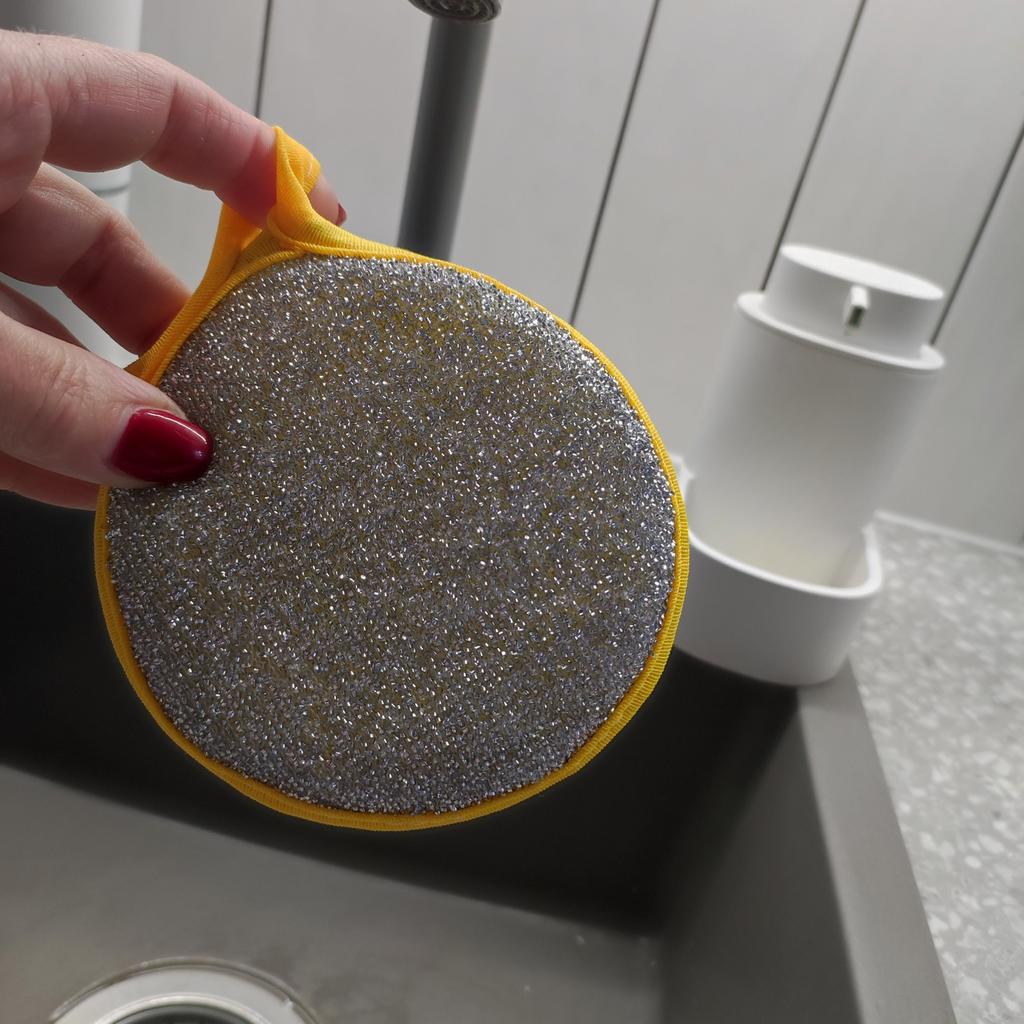 Double-sided sponge for washing dishes 🧽 Big, but comfortable. It foams very well. The mesh side is for washing, and the side with metal spraying is for removing grease. It has a loop that can be hung on a hook, and the inside is foam. Such will last a month or two, if washed well after washing dishes. You can buy both one for a trial (I did it) and a set, which of course is more profitable 👌 Mom is satisfied with the purchase, I appreciated that such a sponge covers a larger surface when washing, so I recommend it ❤️