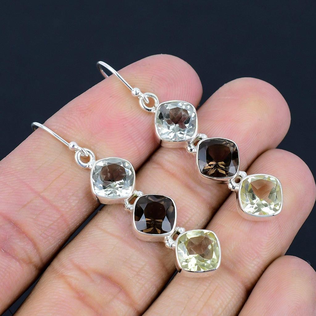Handmade Smoky Quartz & Green Amethyst & White Topaz Gemstone Silver Earrings