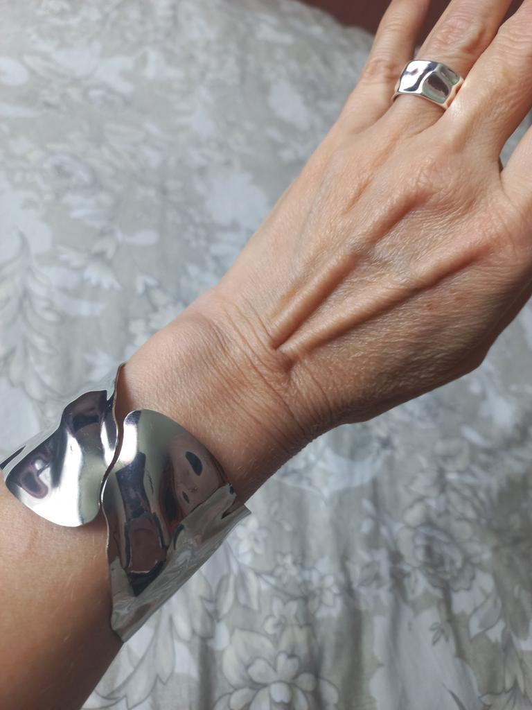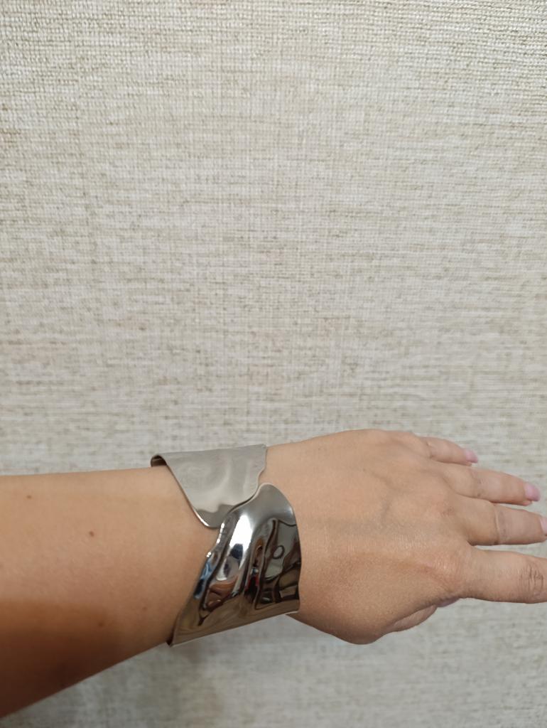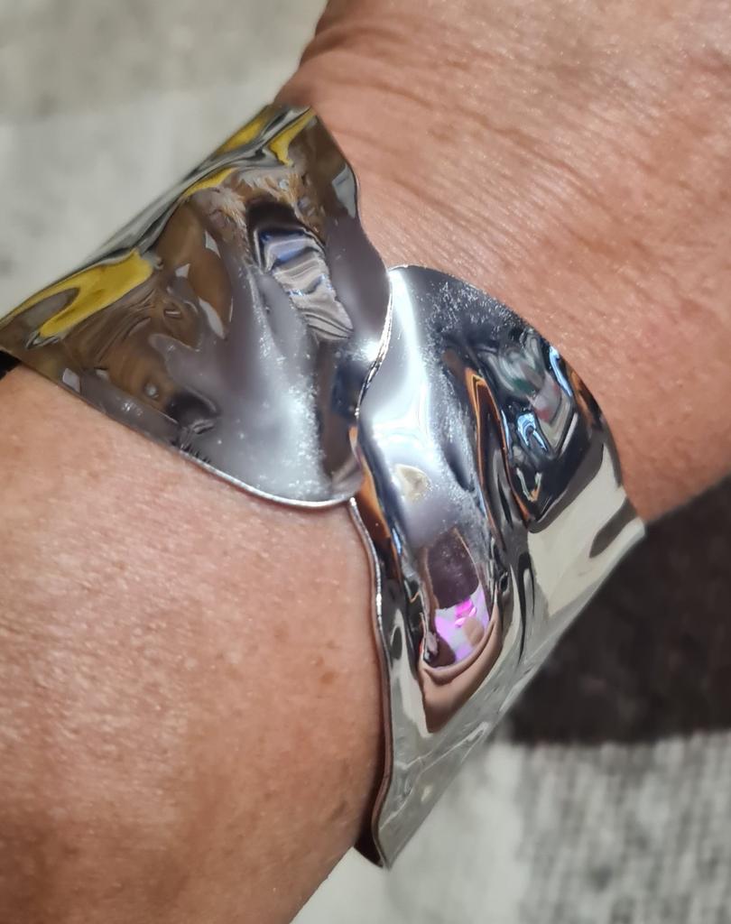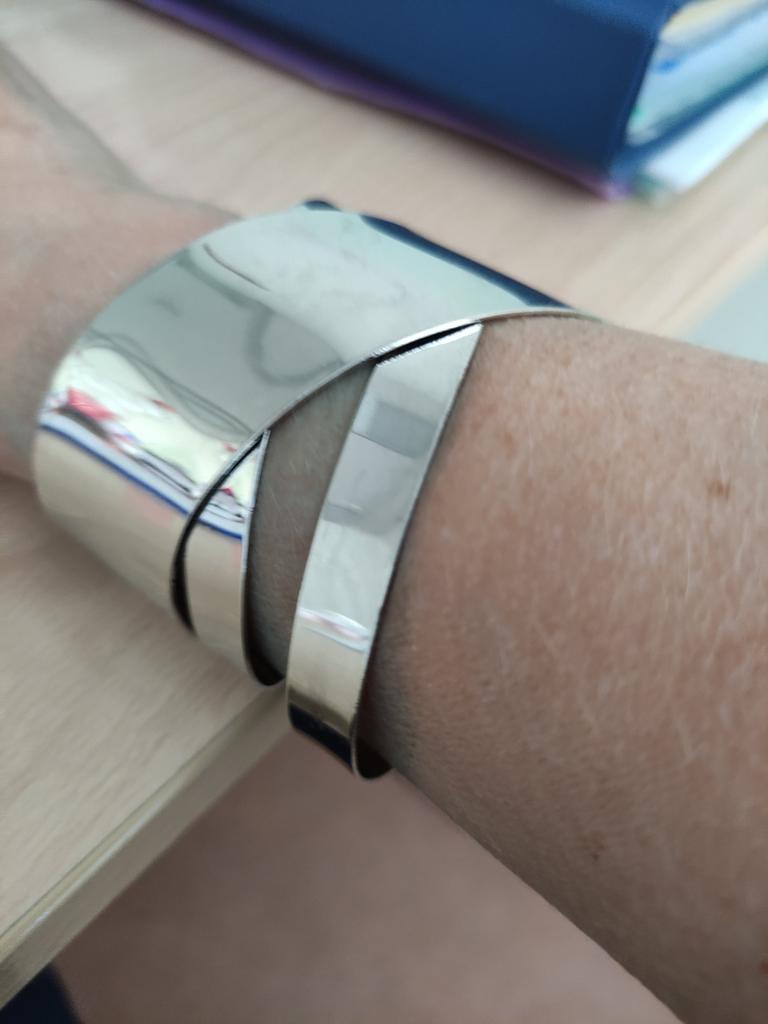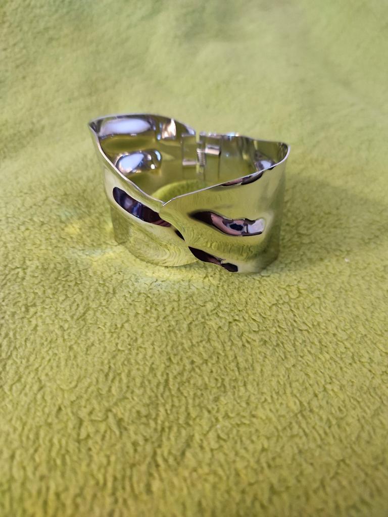 A beautiful silver bracelet with a spring that can be worn on any hand.