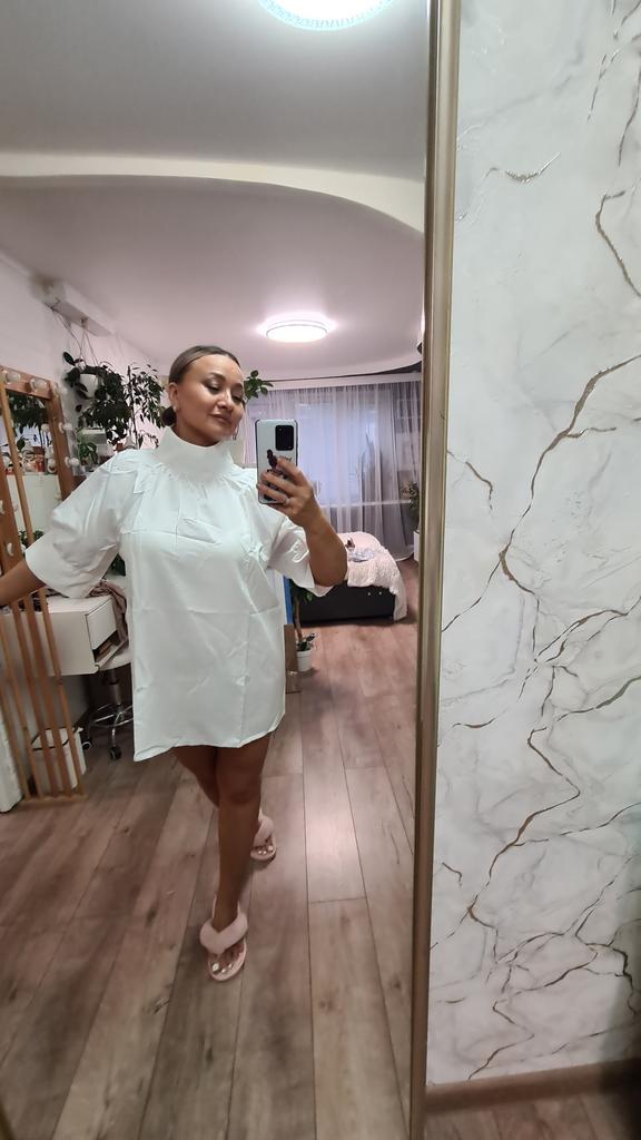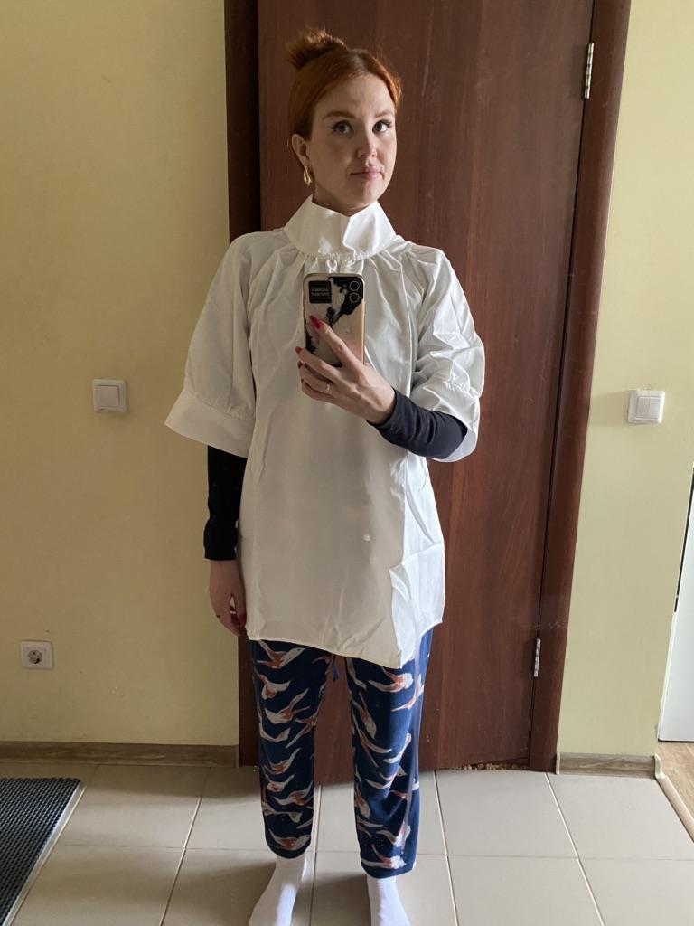 Looks good, but had to alter it, the stand-up collar is very high, had to cut it in half, the cuffs on the sleeves are very wide in volume, had to sew a pleat, in the end it looks excellent.