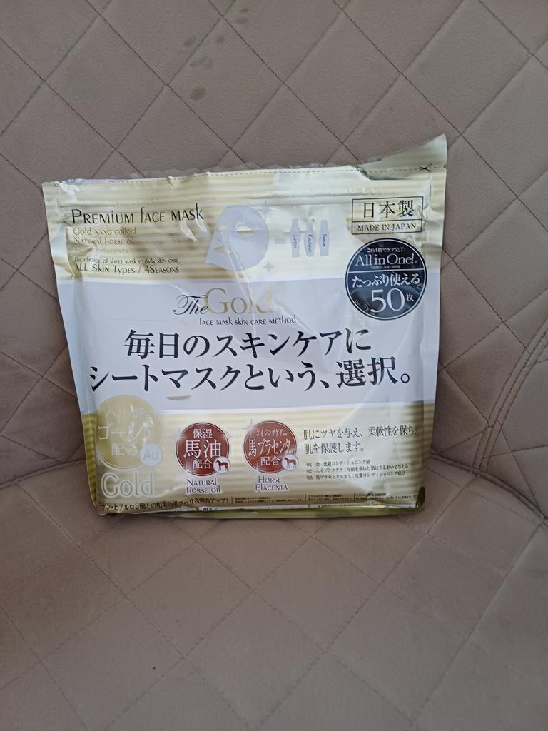 Shinseisakusho Premium Face Mask Gold 50 Sheets serves as a toner, lotion, and essence all in one with just one sheet. This mask combines 'horse oil' and 'horse placenta' for a luxurious all-in-one sheet experience.