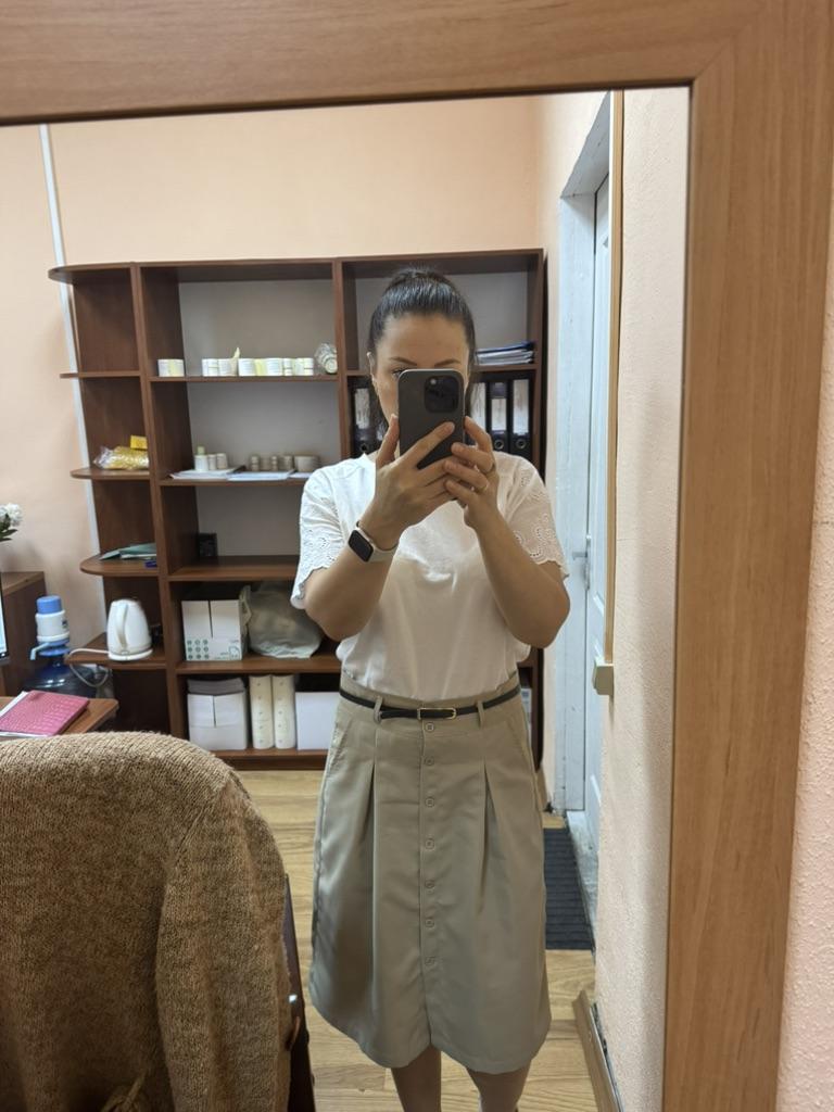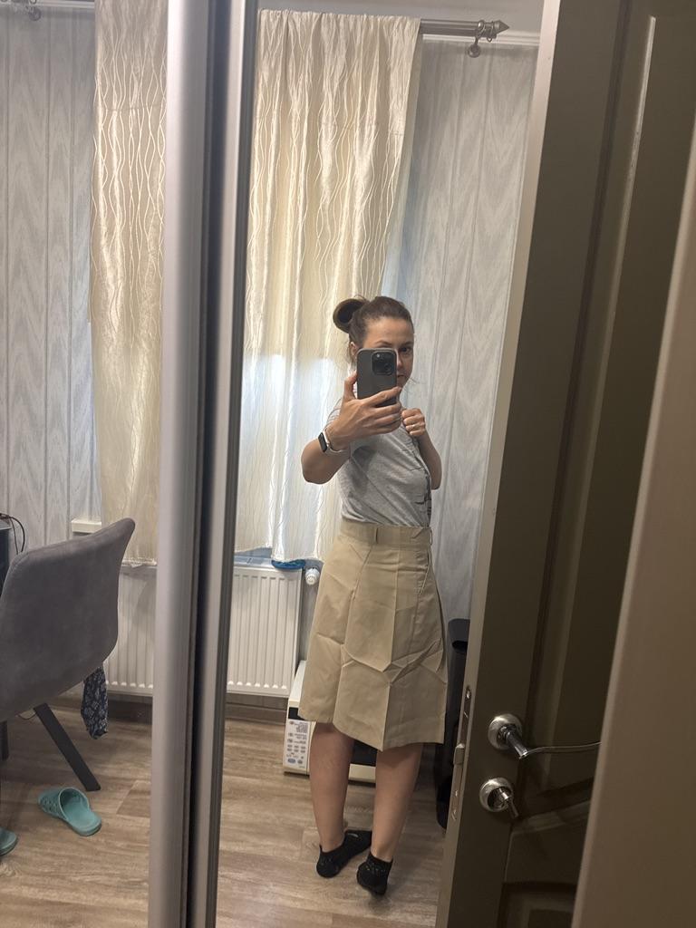 The skirt fits the size, the fabric is pleasant, does not wrinkle very much