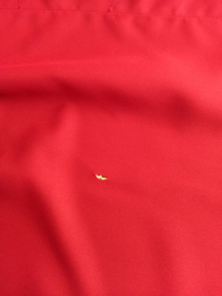 While ironing I found a hole. While the fold was not smoothed out, it was not visible. The skirt was folded