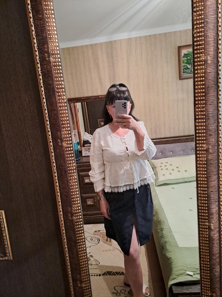 Size L fit my incomplete size 46. The fabric is thin, the model is cute. For summer - good. The disadvantage is that the buttons are very close to the edge and very small. Visually it is not noticeable, but I would like them not to save so much on fabric, especially since it is very thin.
