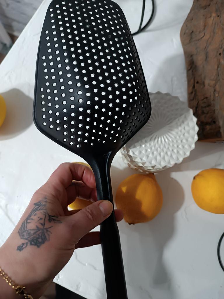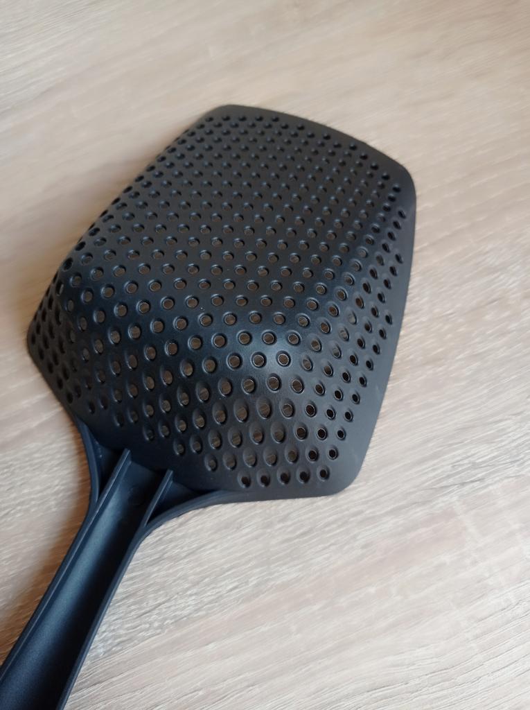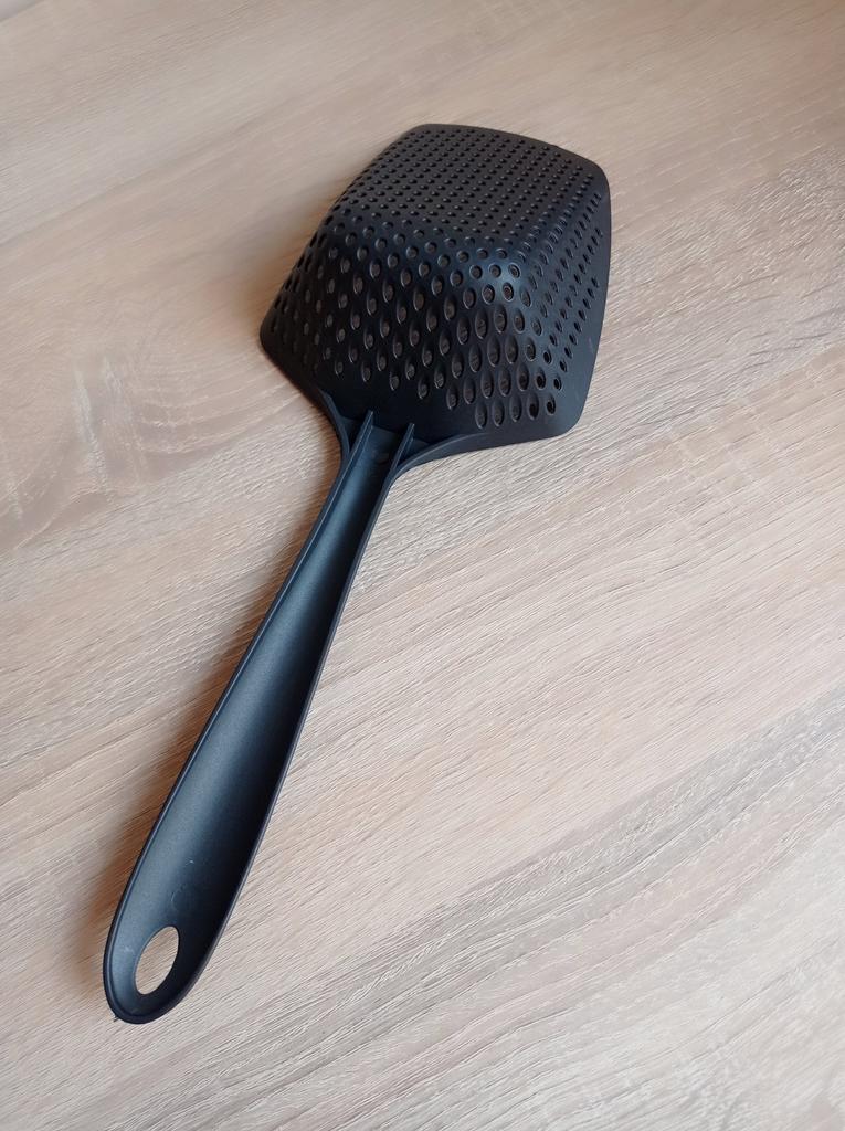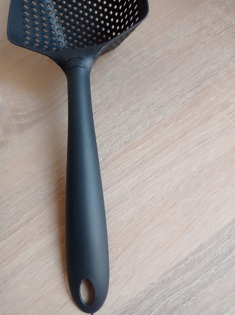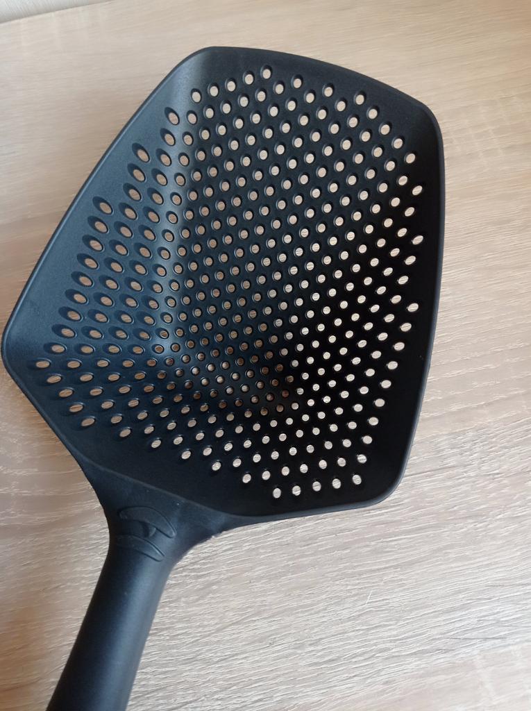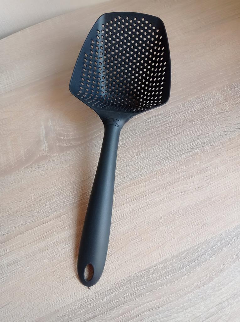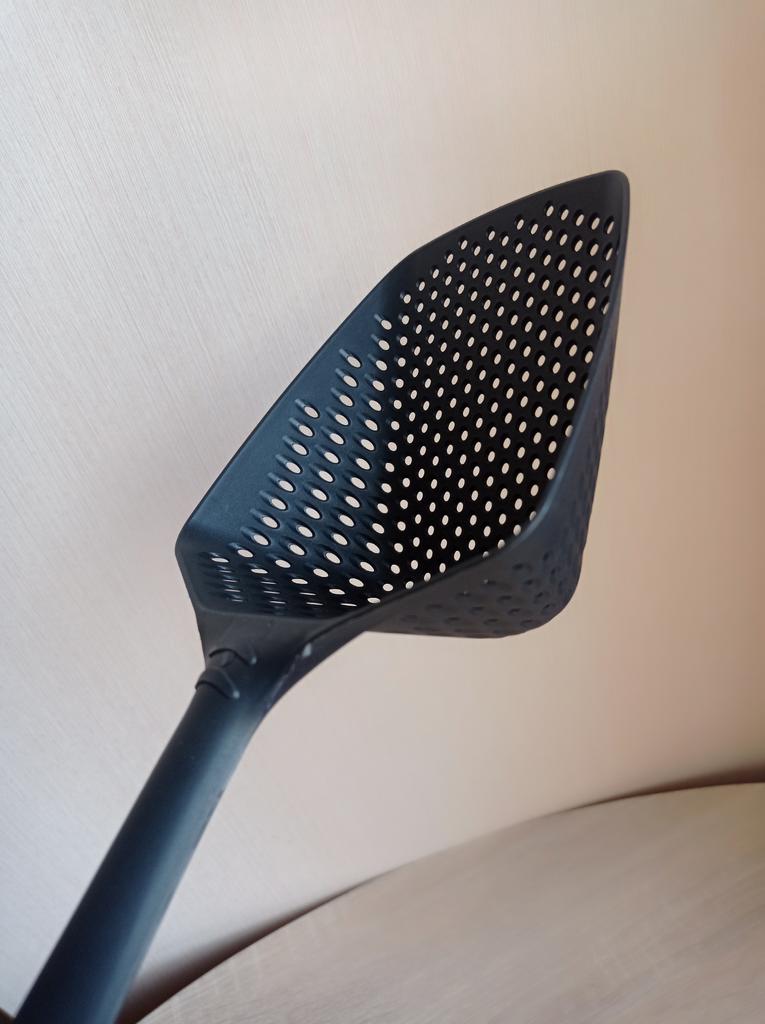 A large spatula, a colander. I have it in black. Does not bend. It is convenient to take dumplings, dumplings, pasta out of the pot. I didn't expect it to be so big))) It did not melt in boiling water, so I can safely say that it corresponds to the seller's description. A great kitchen tool.
