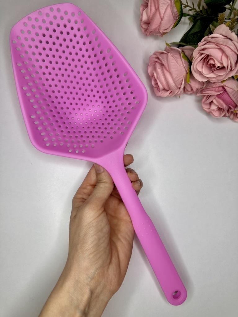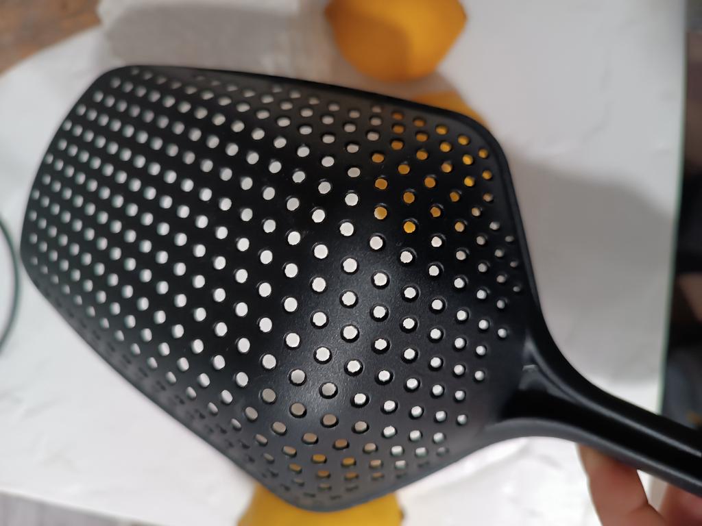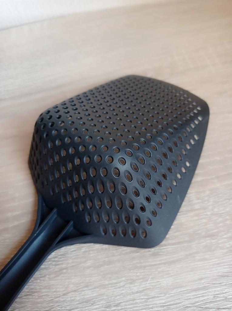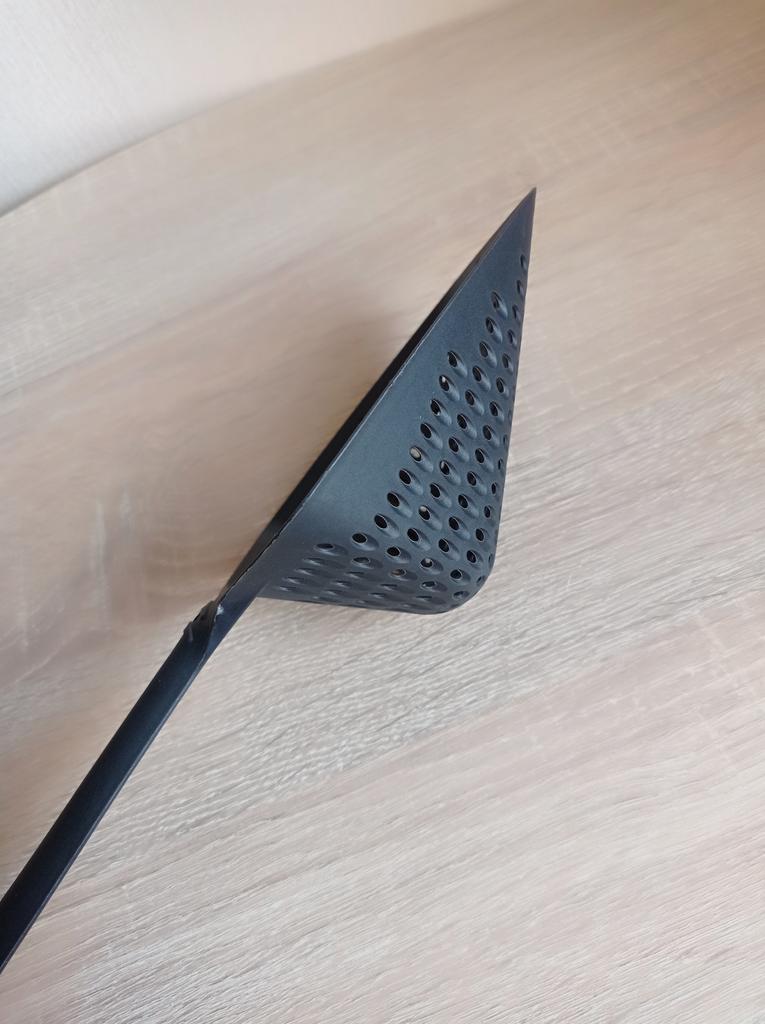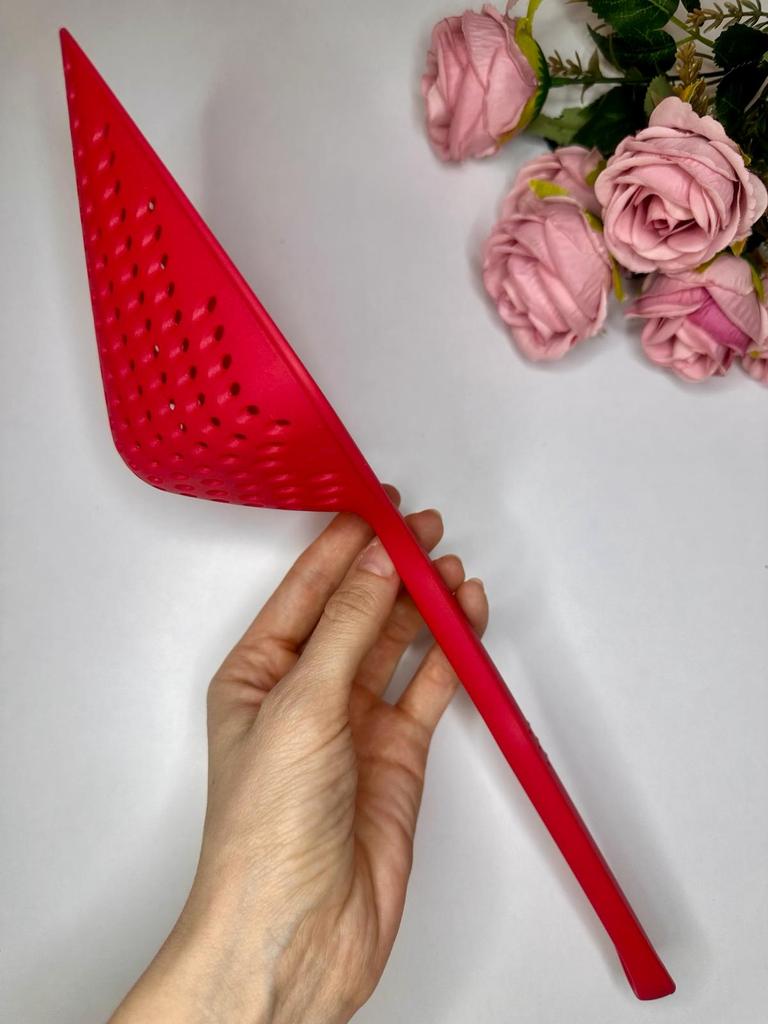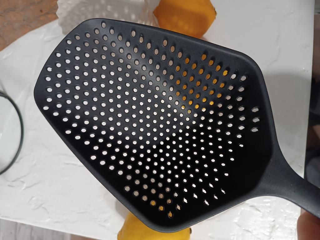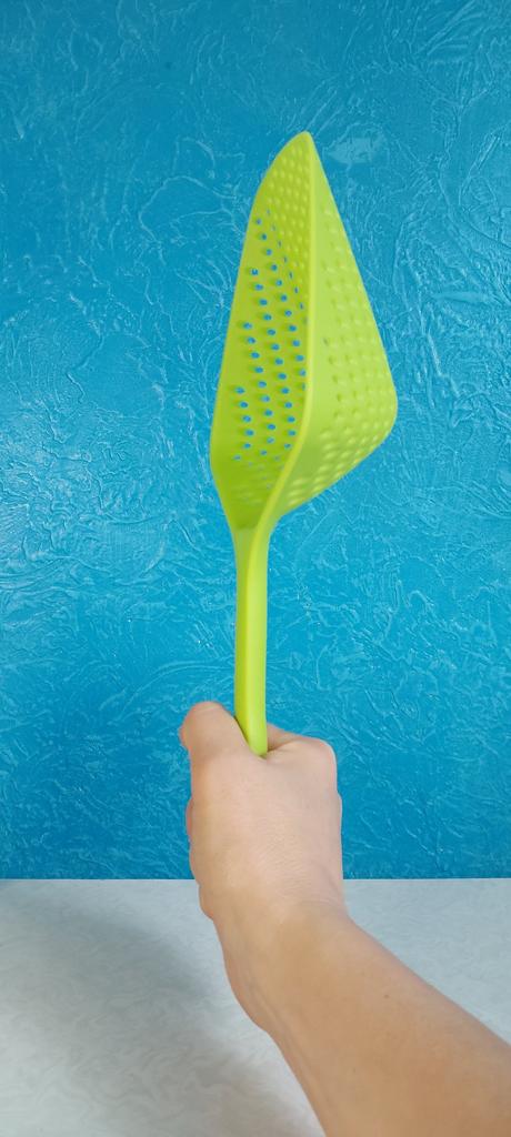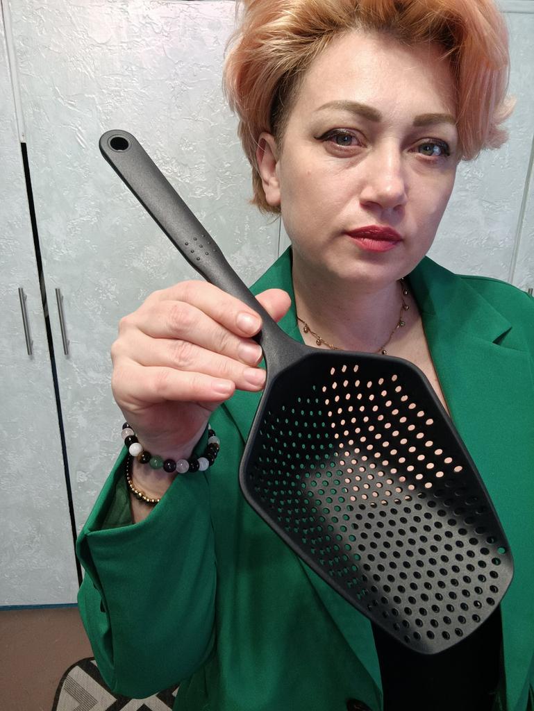 A large spatula, a colander. I have it in black. Does not bend. It is convenient to take dumplings, dumplings, pasta out of the pot. I didn't expect it to be so big))) It did not melt in boiling water, so I can safely say that it corresponds to the seller's description. A great kitchen tool.