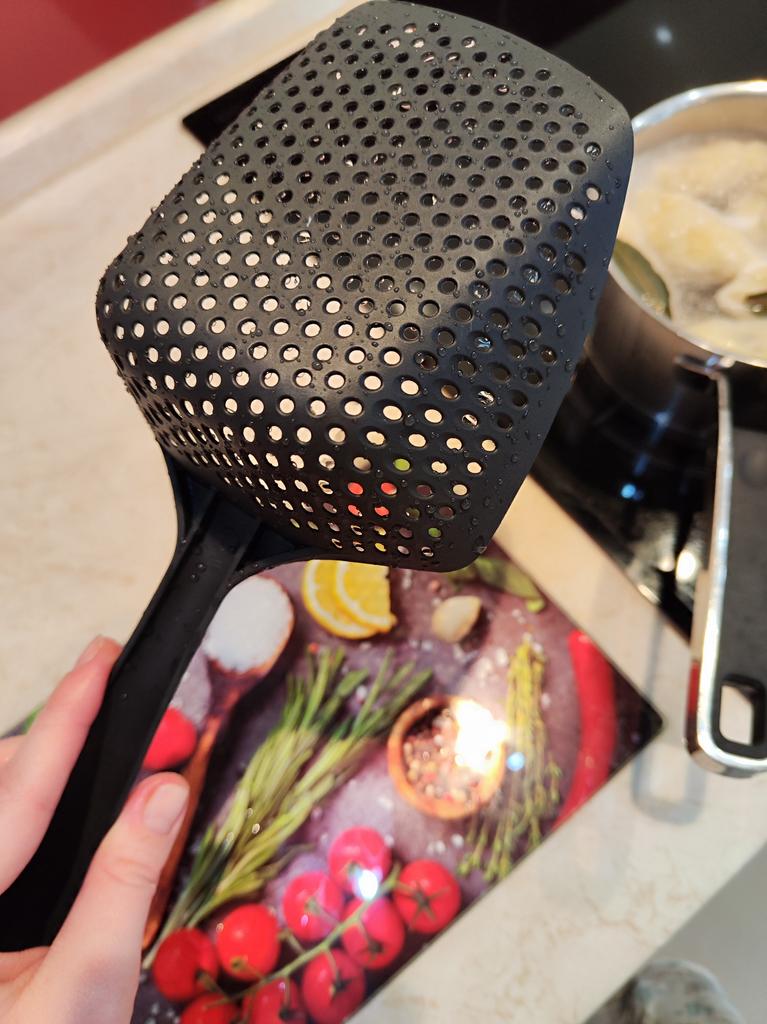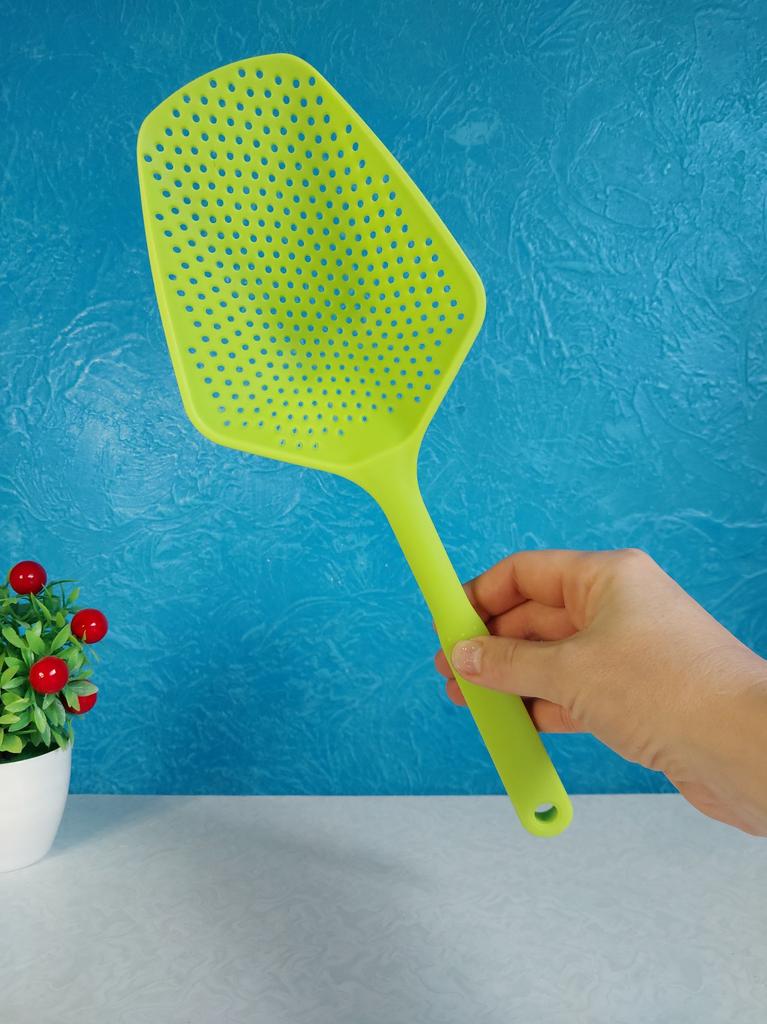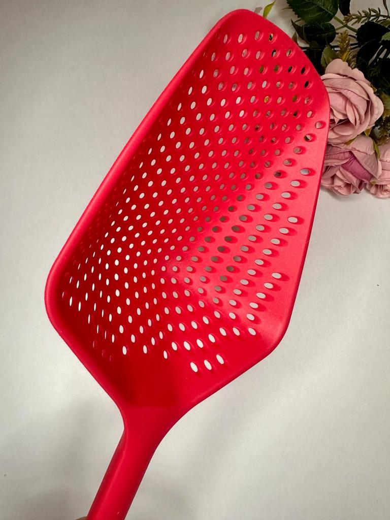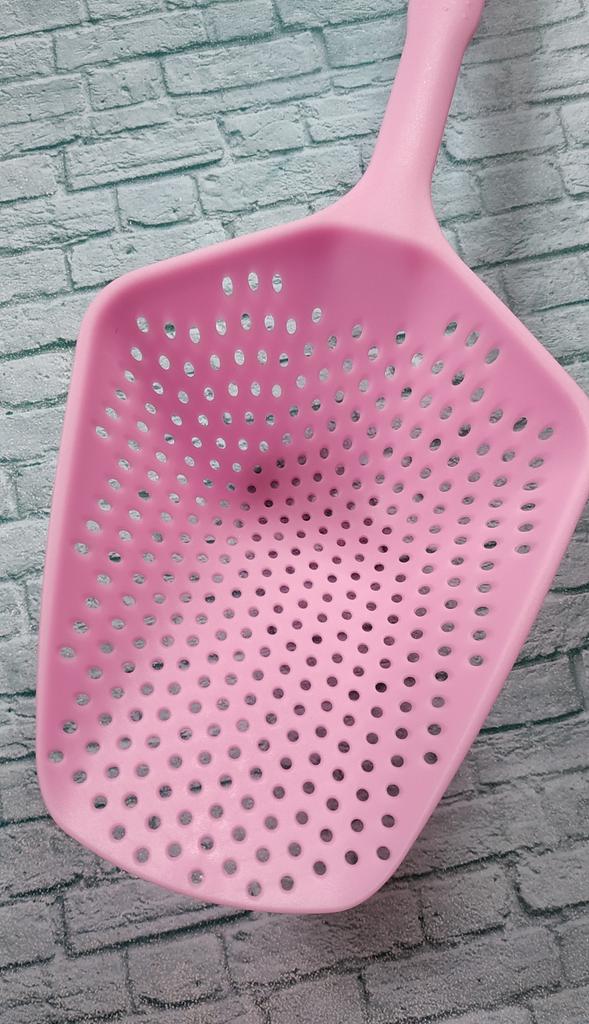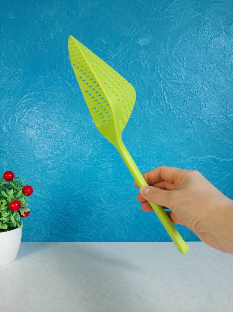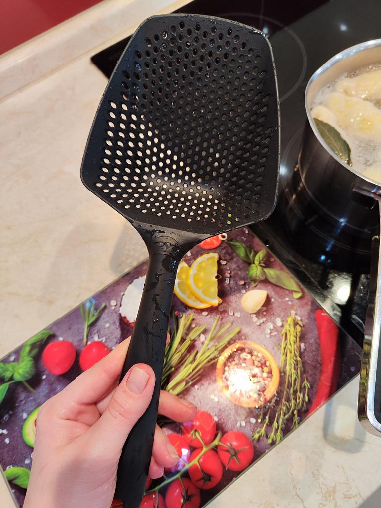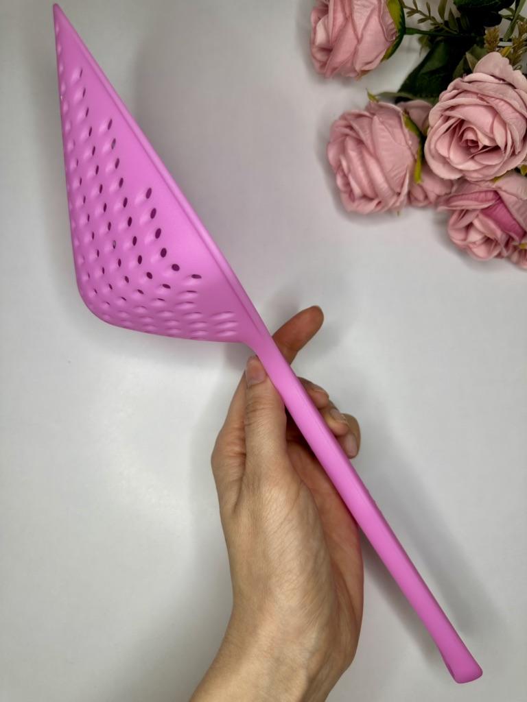 A large spatula, a colander. I have it in black. Does not bend. It is convenient to take dumplings, dumplings, pasta out of the pot. I didn't expect it to be so big))) It did not melt in boiling water, so I can safely say that it corresponds to the seller's description. A great kitchen tool.