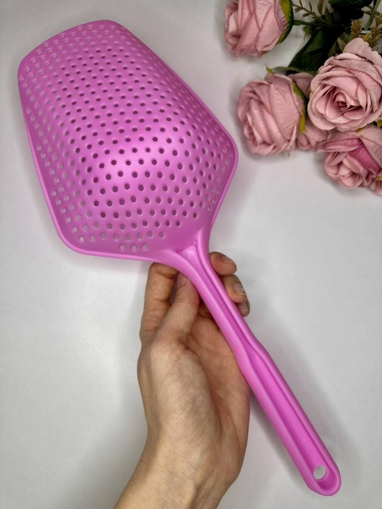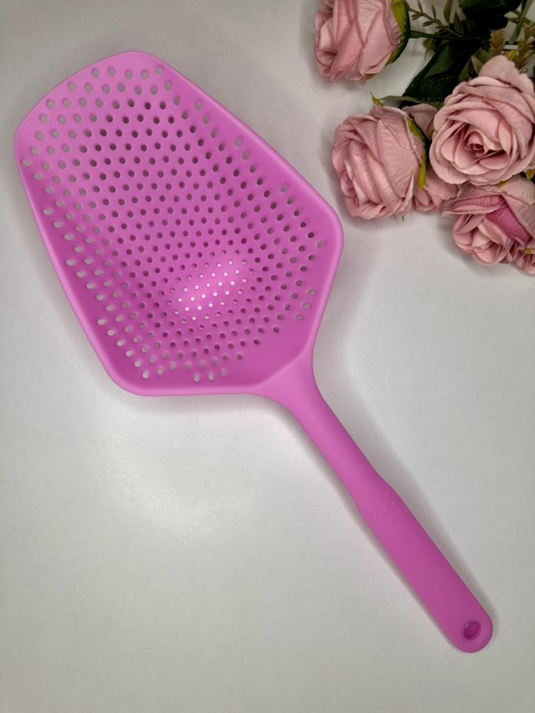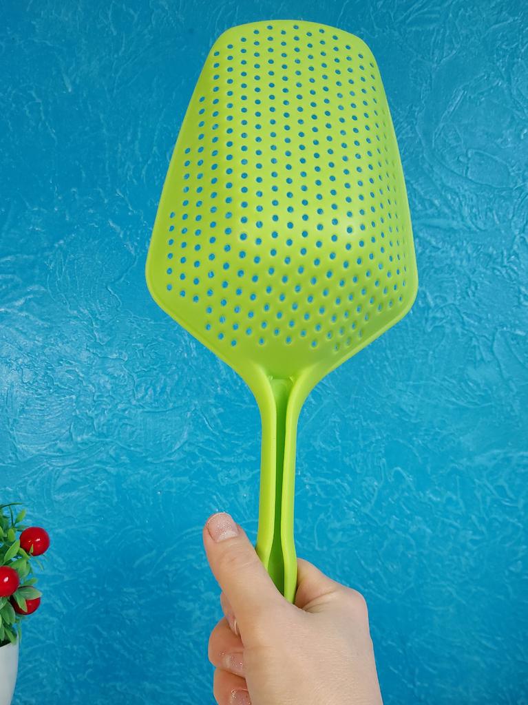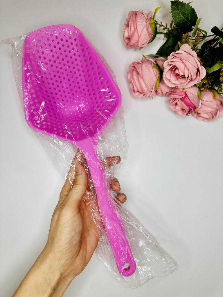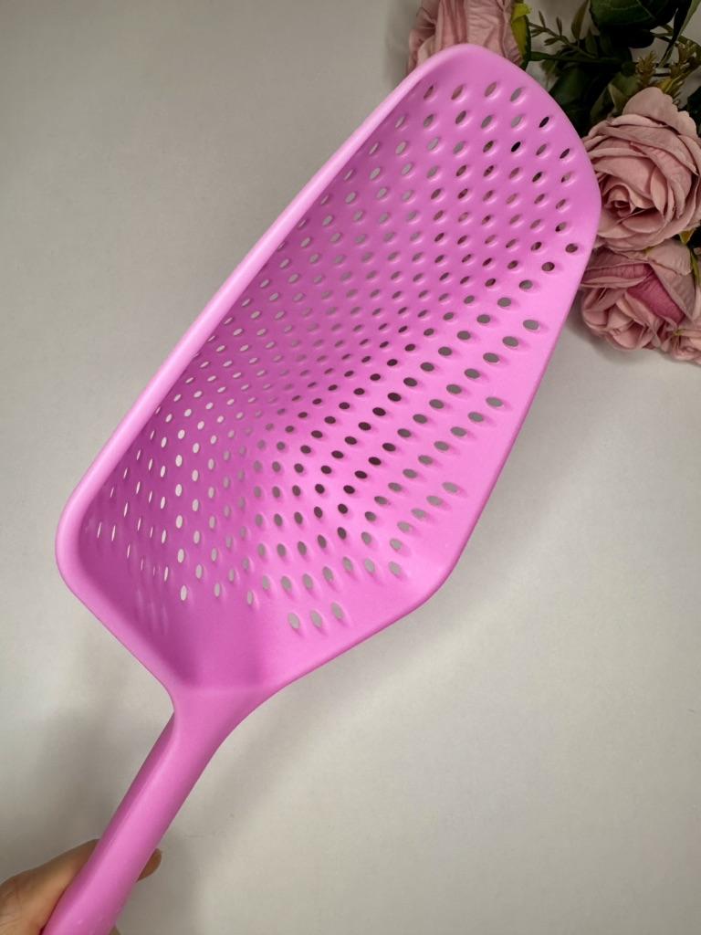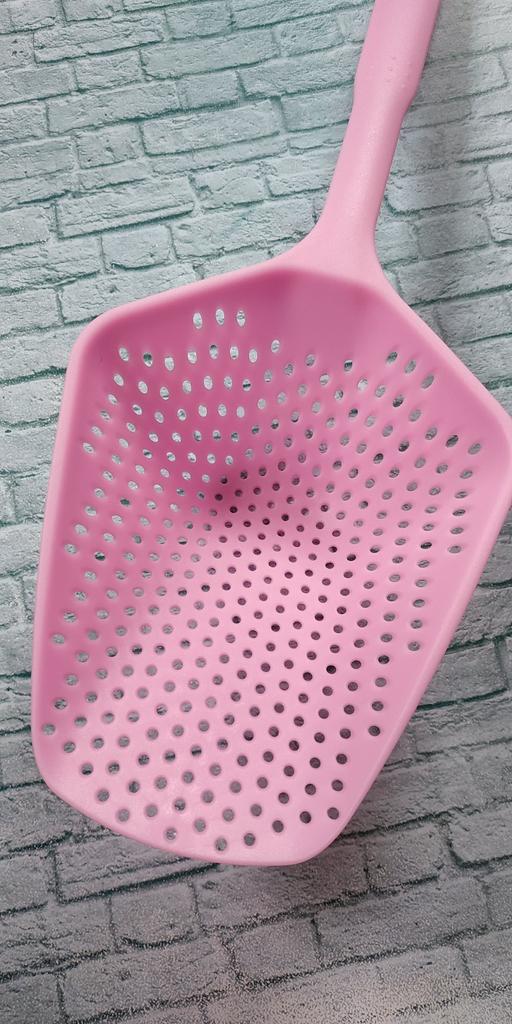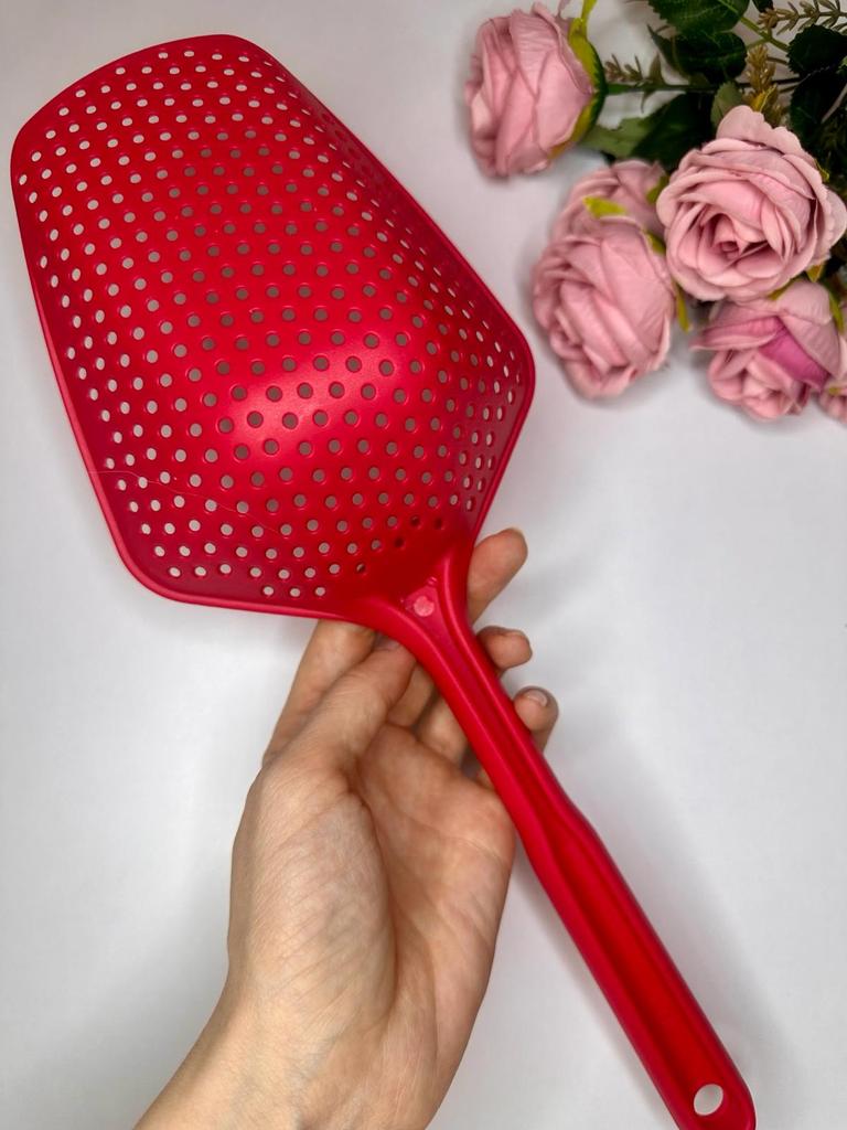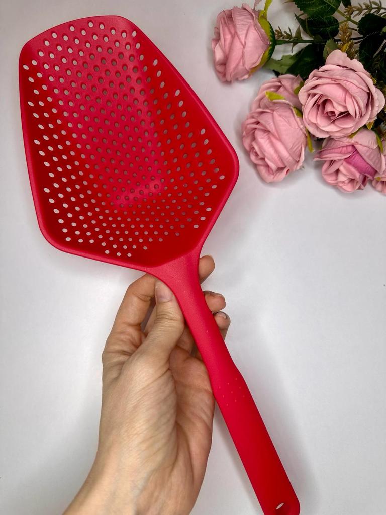 A large spatula, a colander. I have it in black. Does not bend. It is convenient to take dumplings, dumplings, pasta out of the pot. I didn't expect it to be so big))) It did not melt in boiling water, so I can safely say that it corresponds to the seller's description. A great kitchen tool.