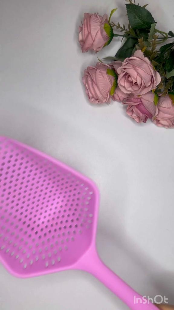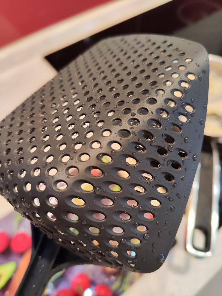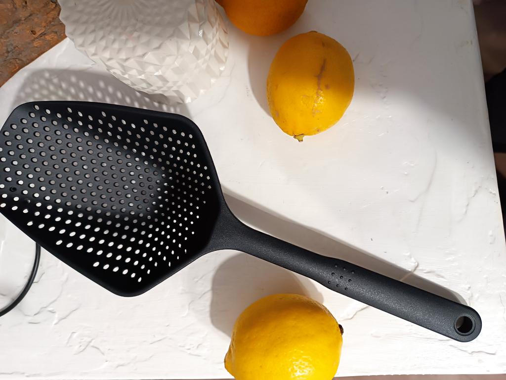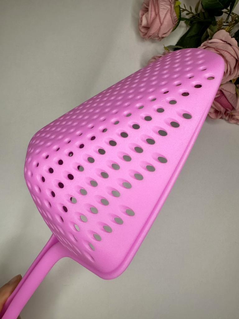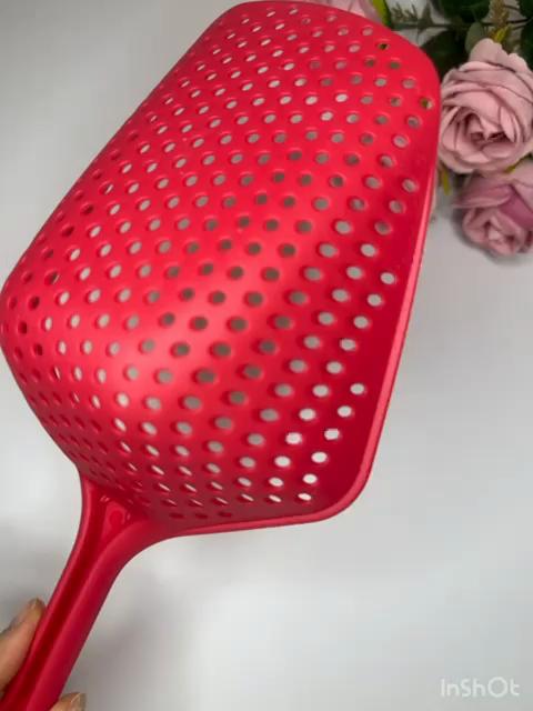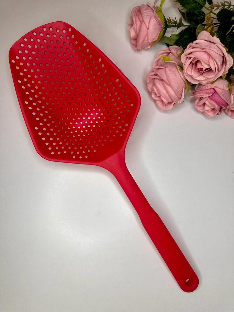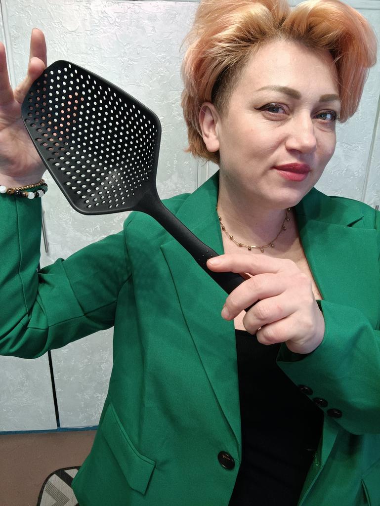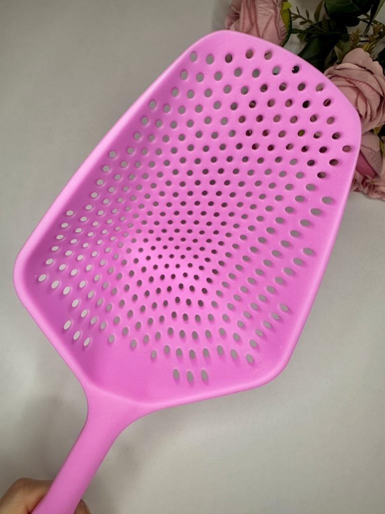 A large spatula, a colander. I have it in black. Does not bend. It is convenient to take dumplings, dumplings, pasta out of the pot. I didn't expect it to be so big))) It did not melt in boiling water, so I can safely say that it corresponds to the seller's description. A great kitchen tool.
