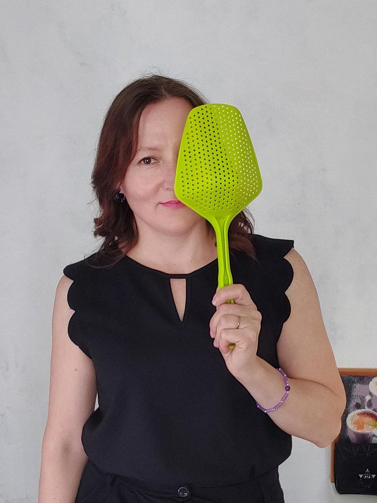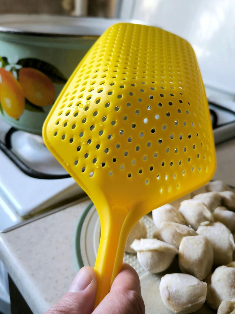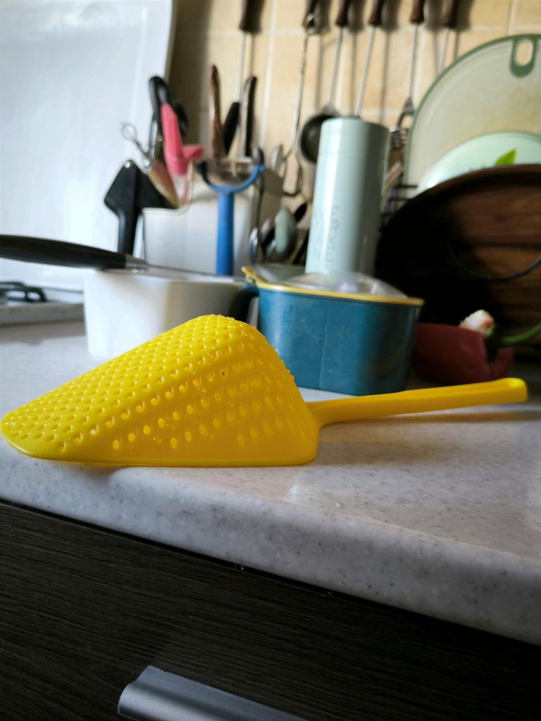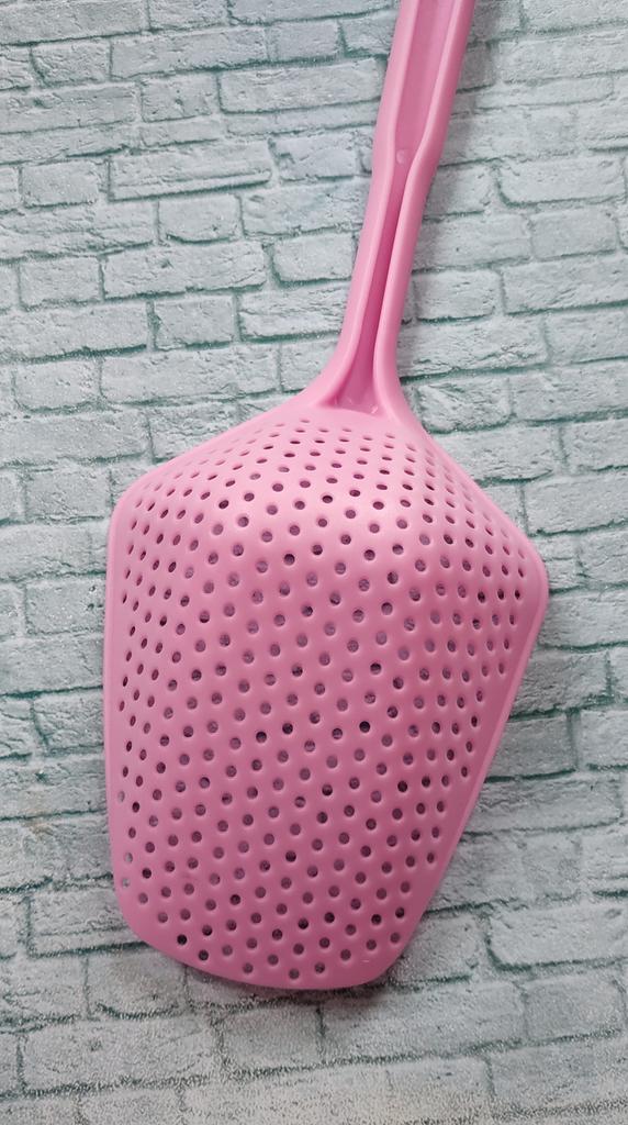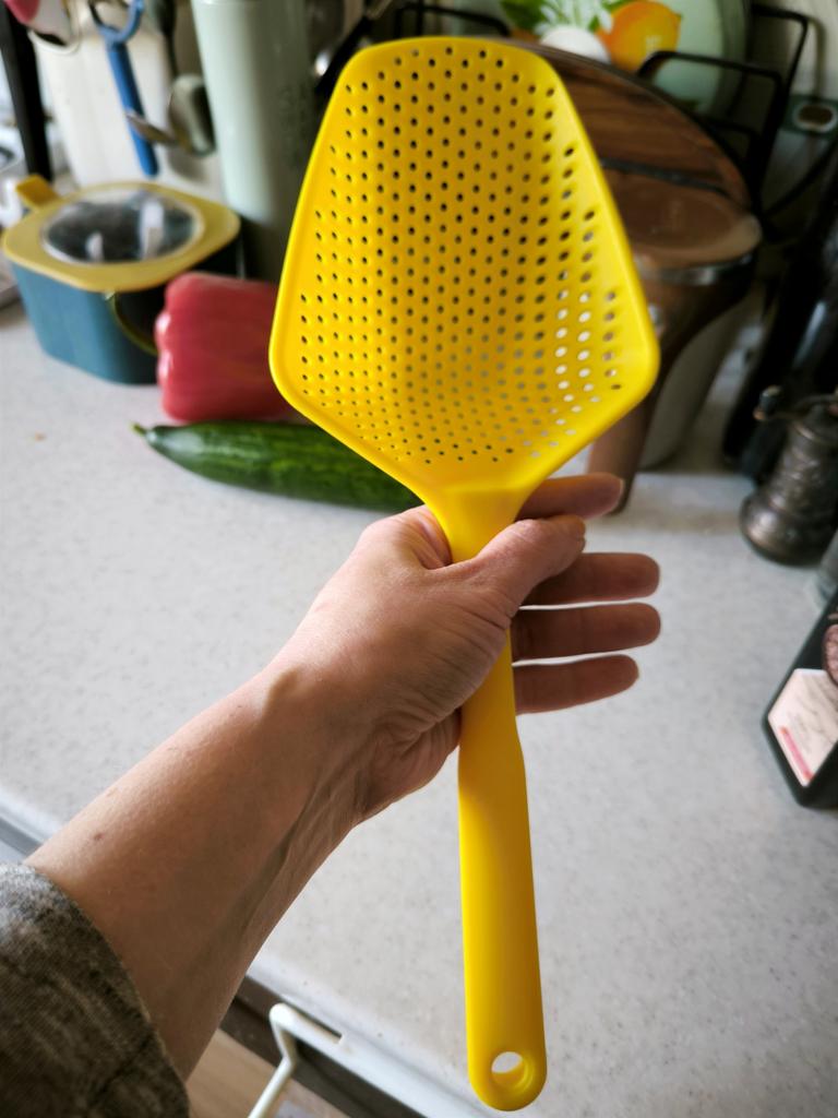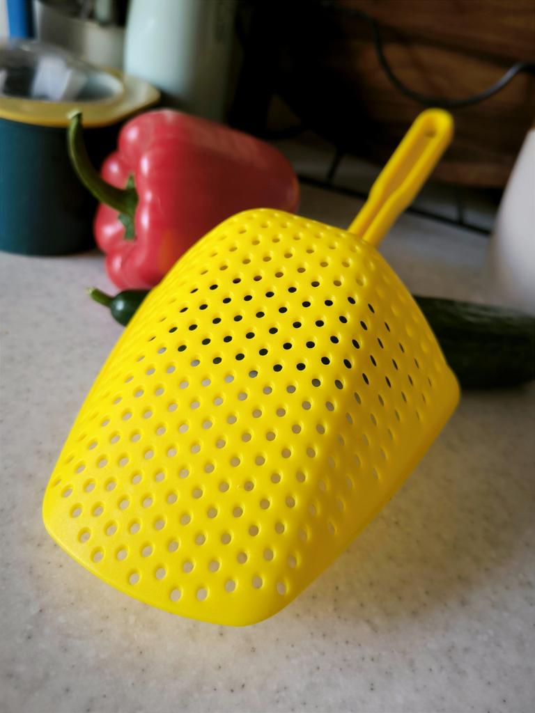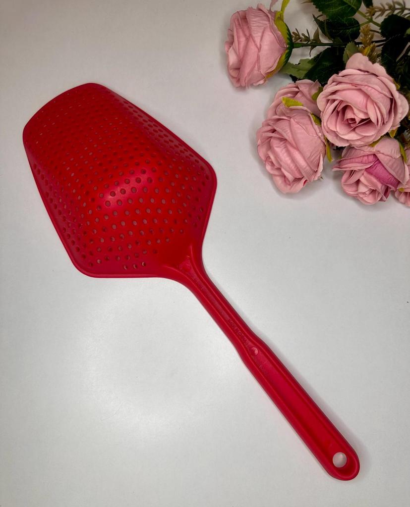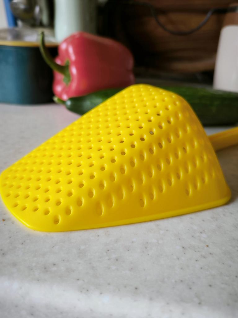 A large spatula, a colander. I have it in black. Does not bend. It is convenient to take dumplings, dumplings, pasta out of the pot. I didn't expect it to be so big))) It did not melt in boiling water, so I can safely say that it corresponds to the seller's description. A great kitchen tool.