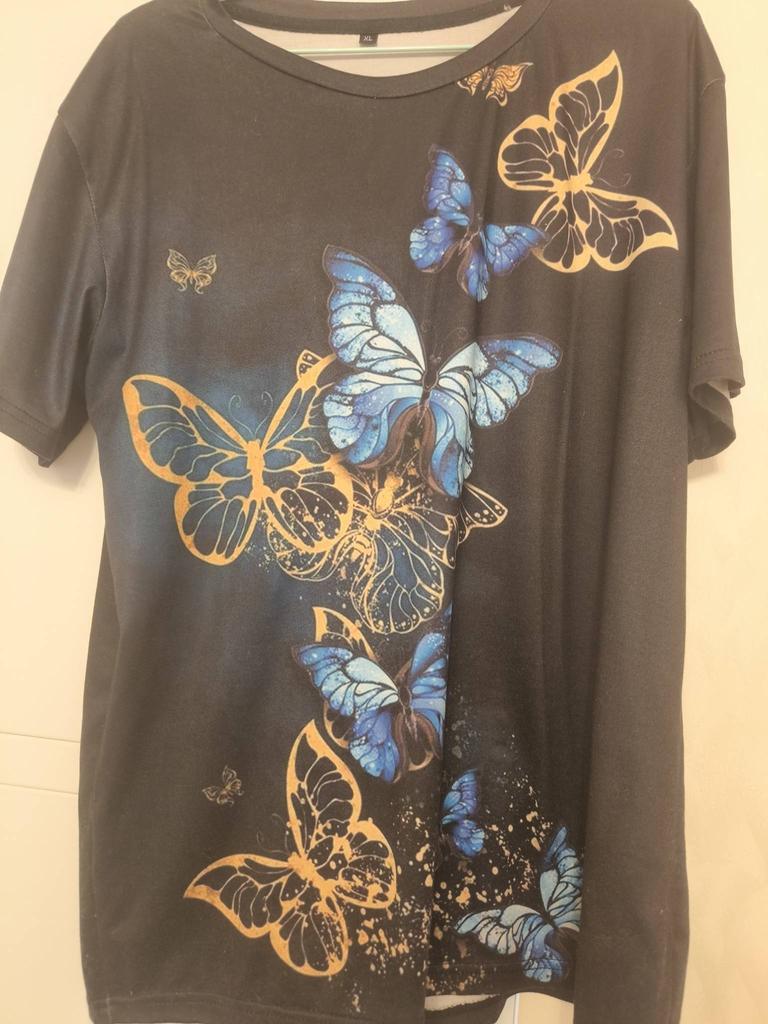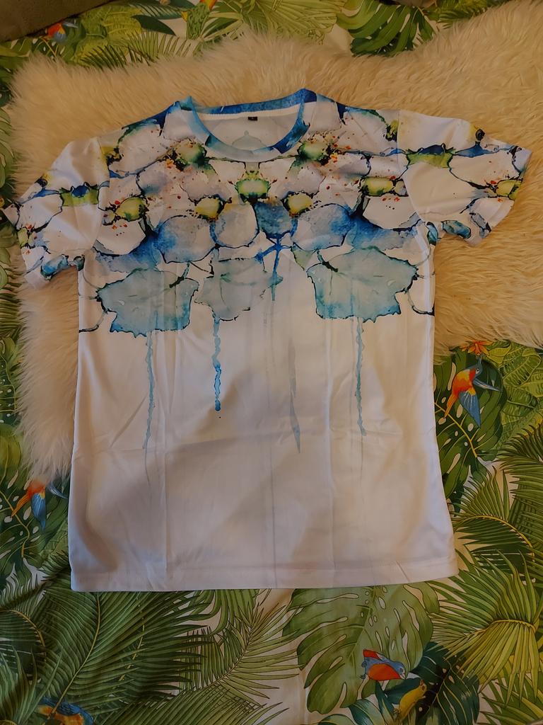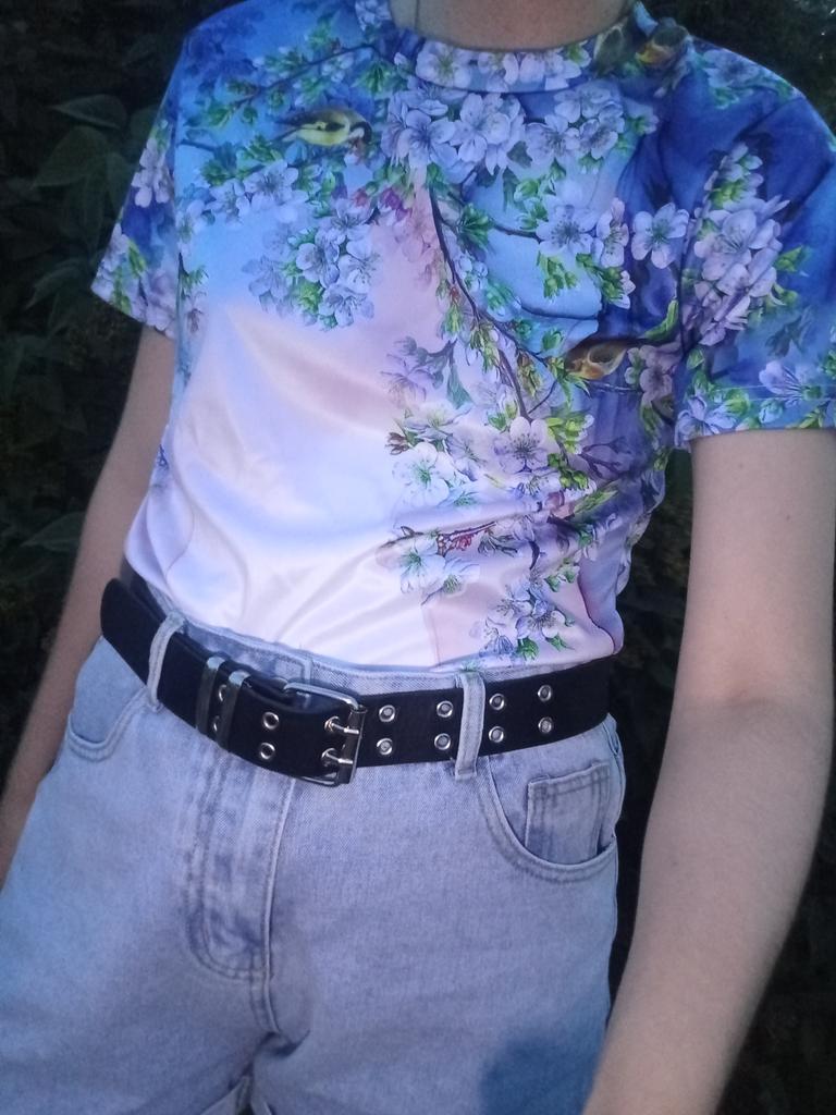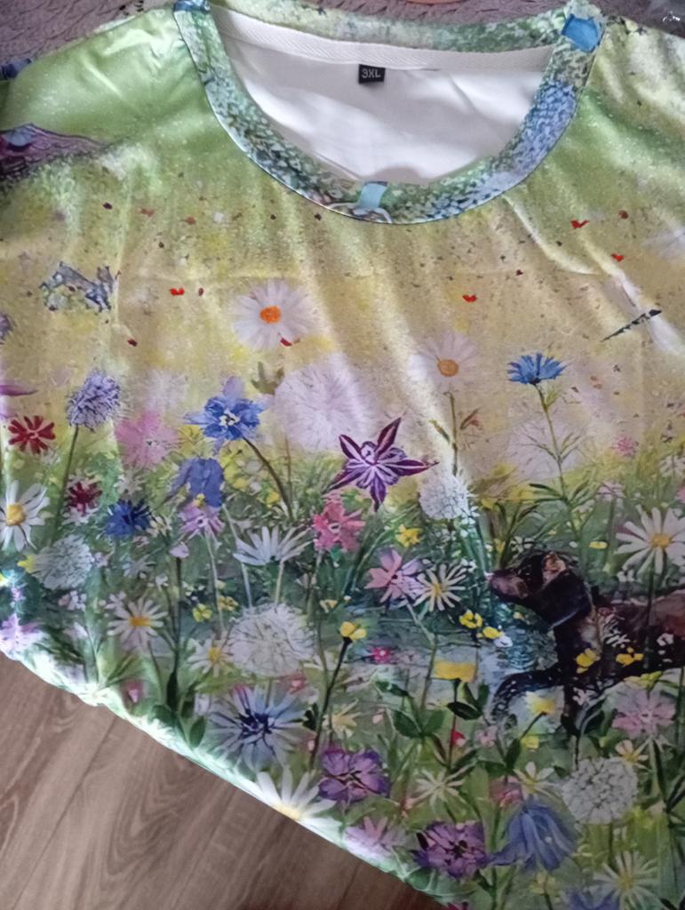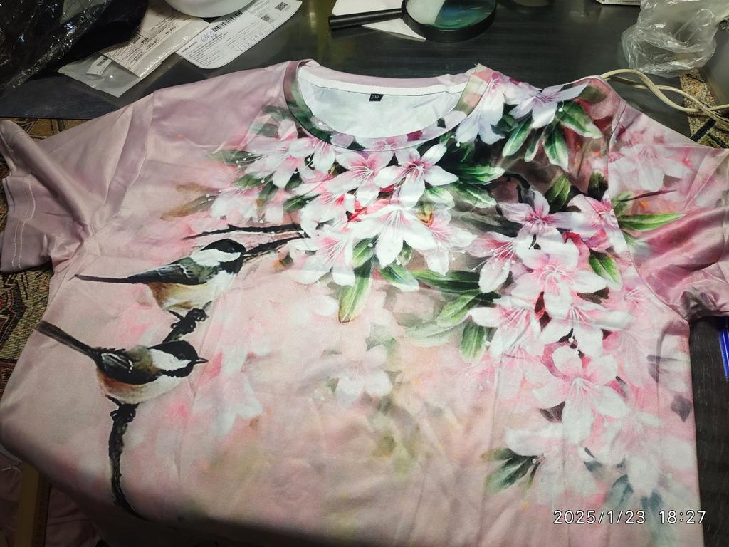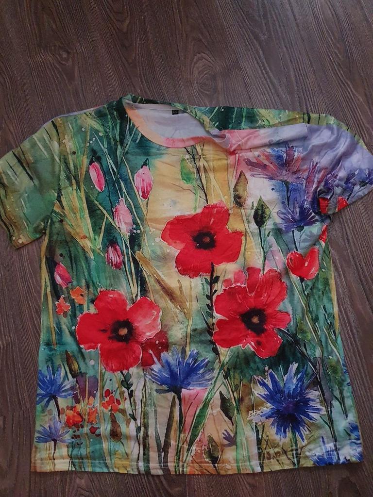 T-shirt with a pattern exactly as in the photo. The material is very light, I would like it to be a little thicker and heavier.