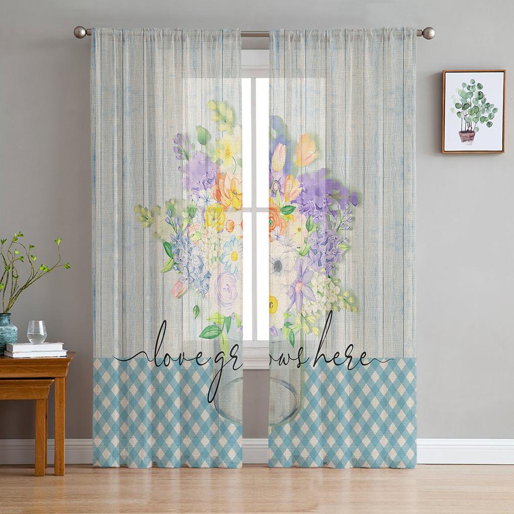 Spring Floral Watercolor Plaid Sheer Curtains For Living Room Bedroom Kids Room Tulle Window Treatment Drapes