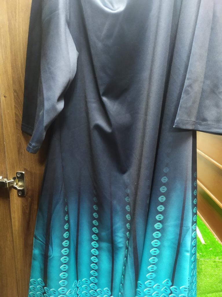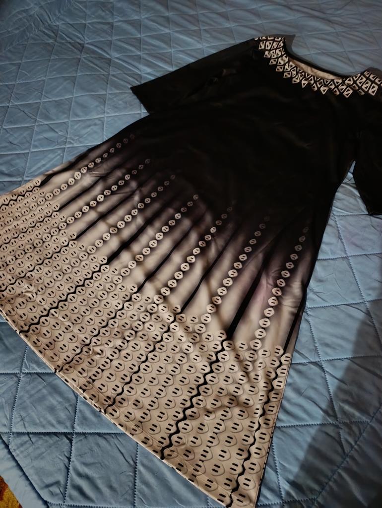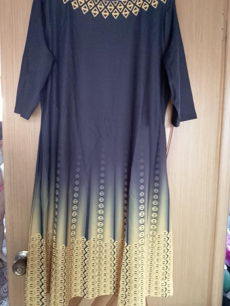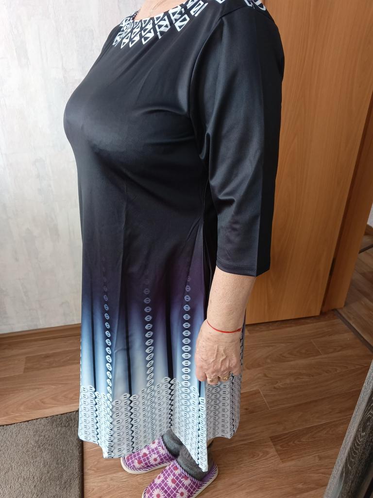 It looks rich in the photo, but in reality it's rather simple, because it doesn't match the advertised dress. A caricature of what is in the photo. In the photo, the pattern is brighter and larger, extending onto the sleeves, but in reality it's one disappointment.
