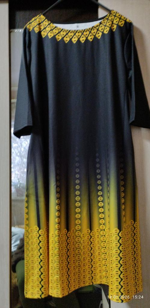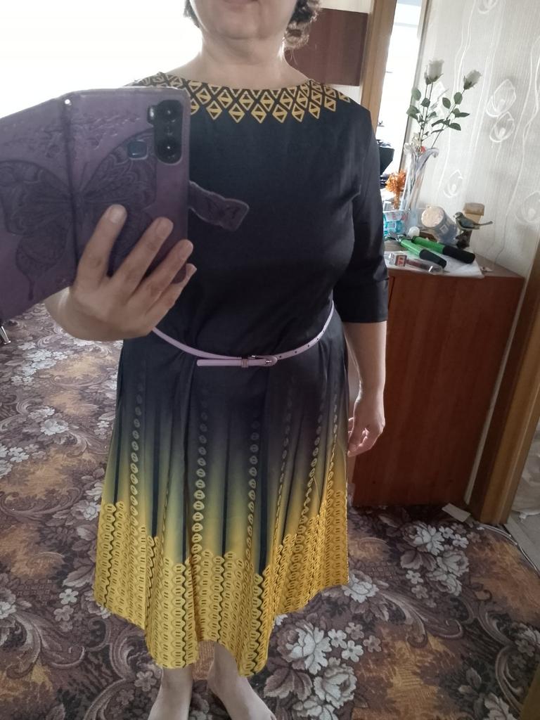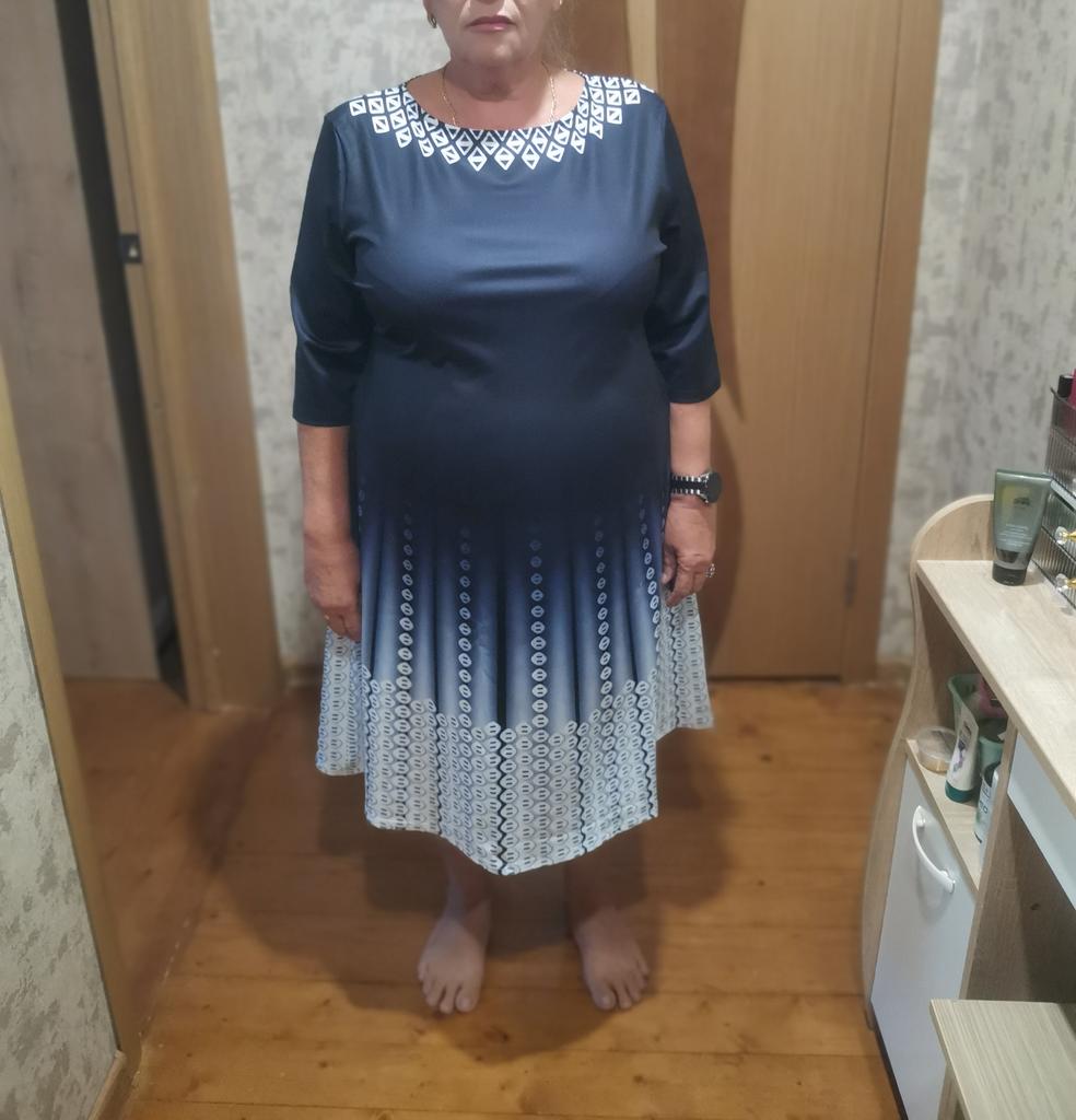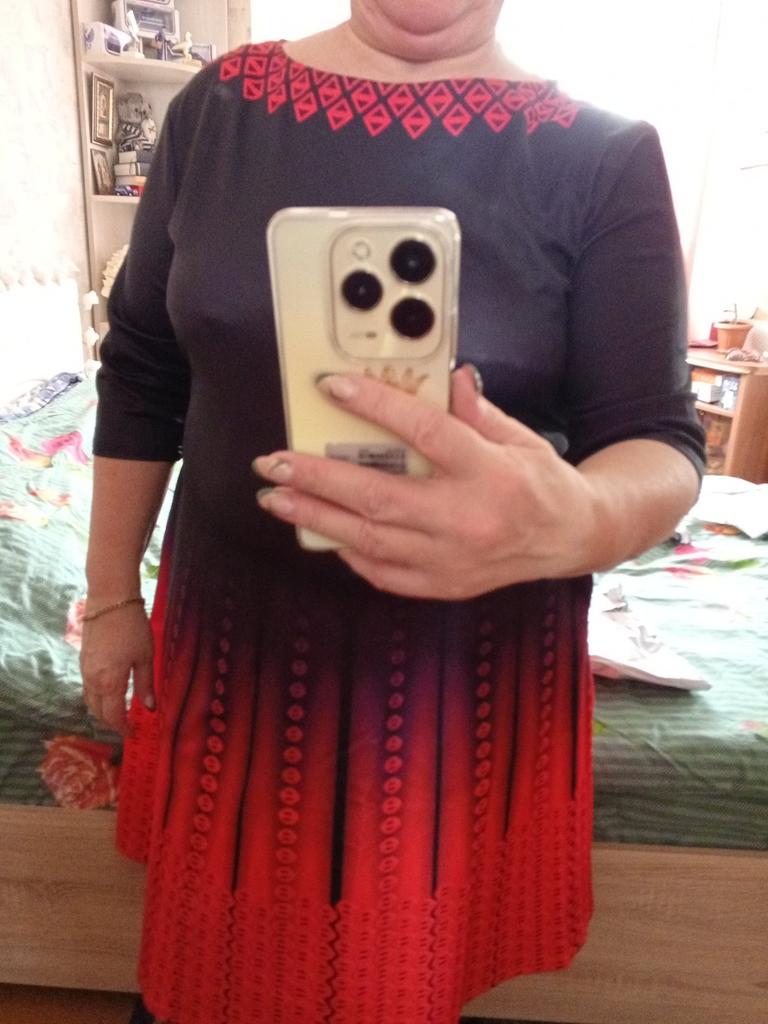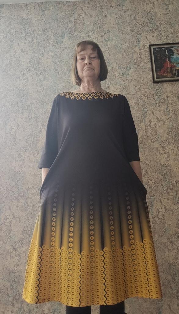 The cut of the dress does not match the picture (it is a straight cut), it's good that I took a size larger so that something similar would turn out. And the dress has two pockets, on both sides of the skirt.