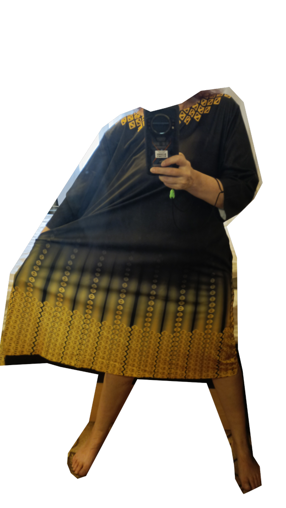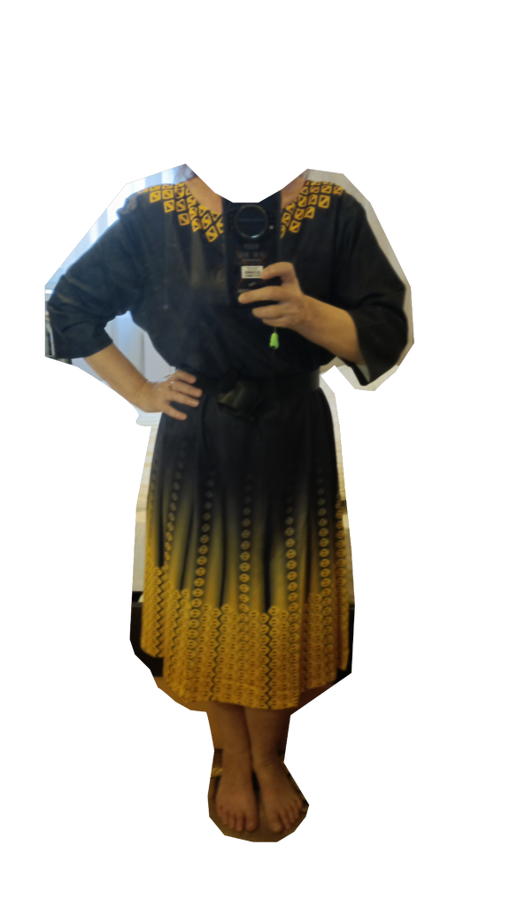 In the photo, the dress looks beautiful, fitted, a pleasure to look at. But in reality, it's just two straight strips of fabric sewn together from the sleeves to the bottom.