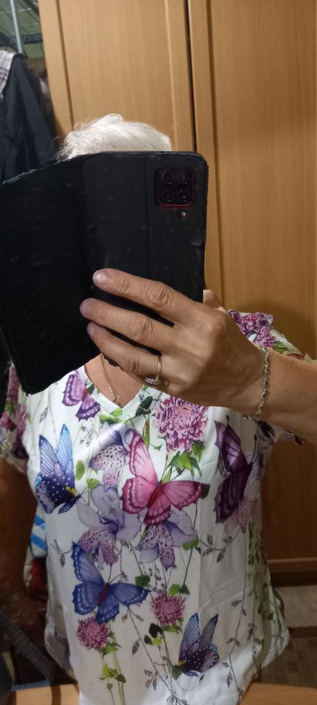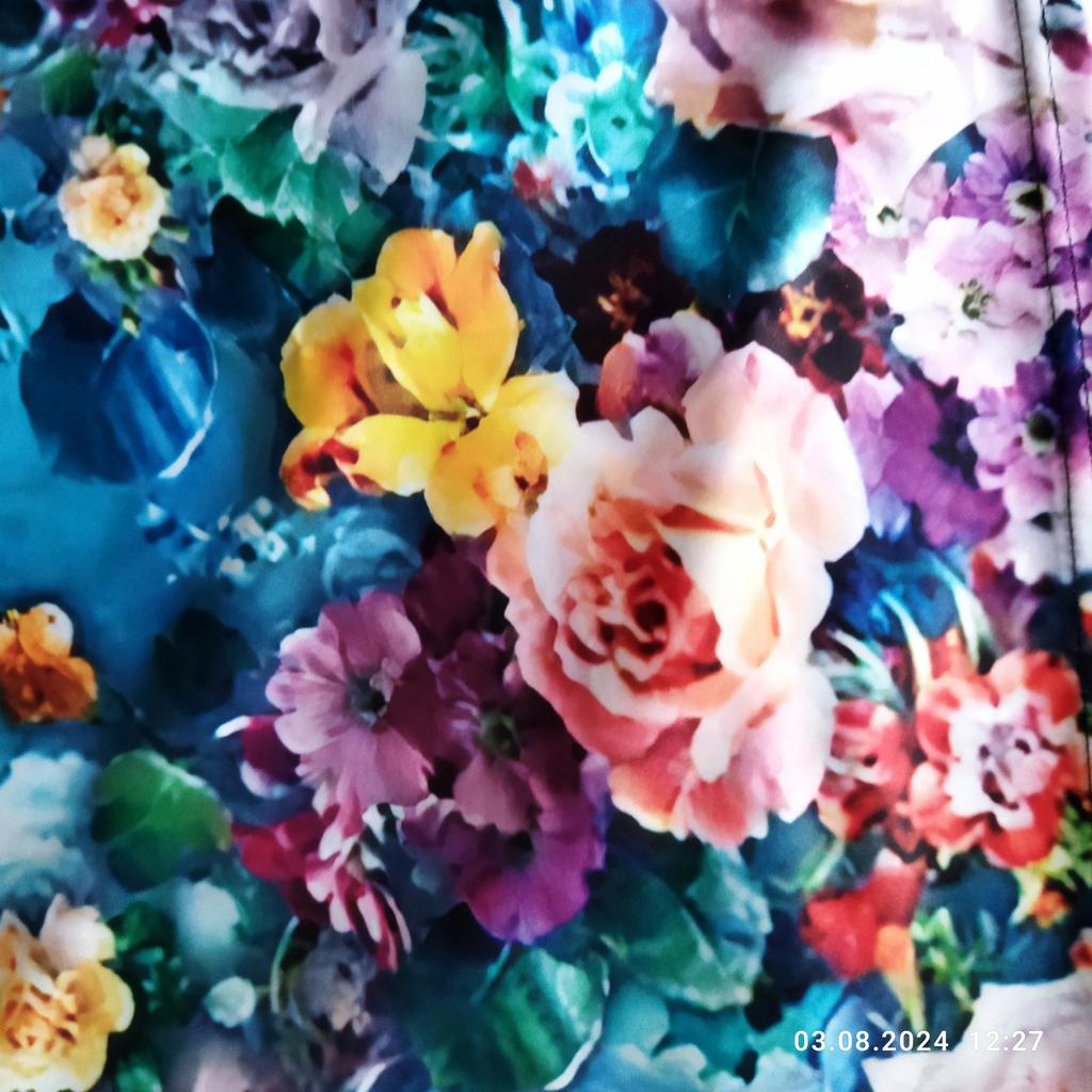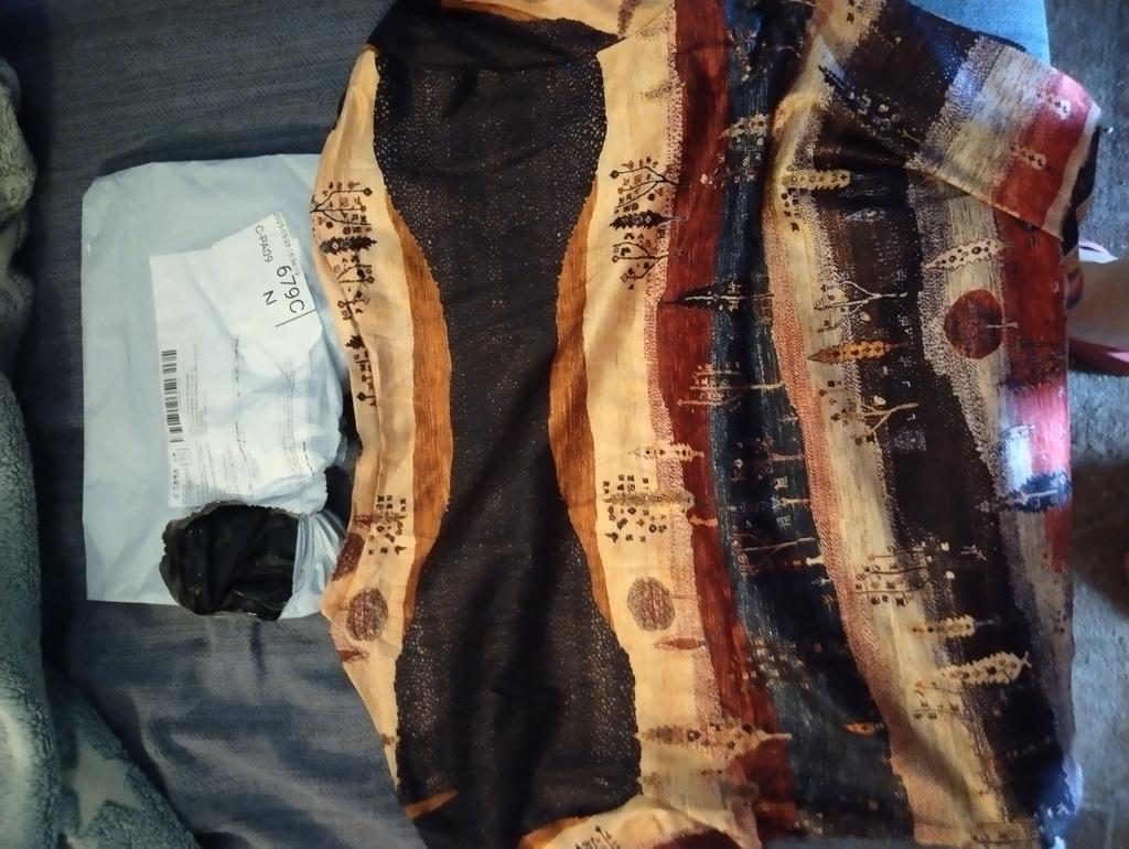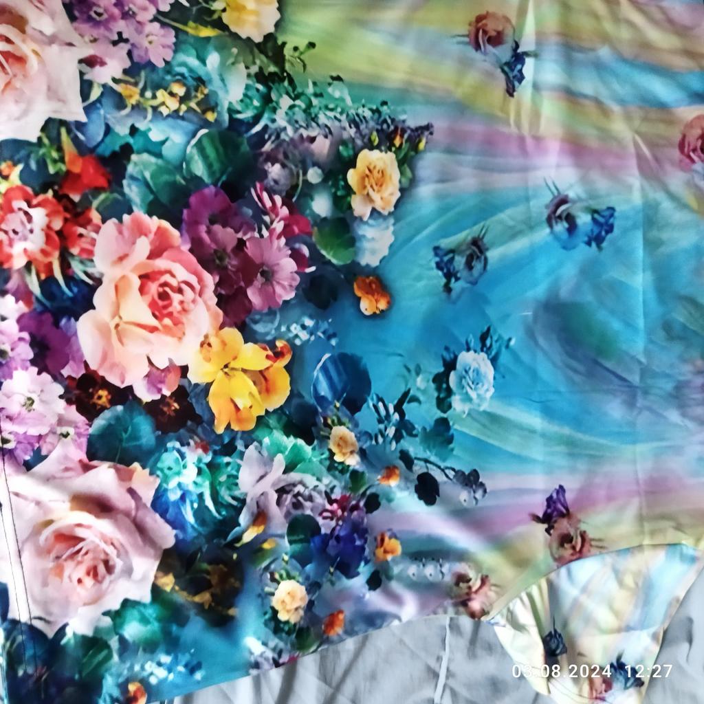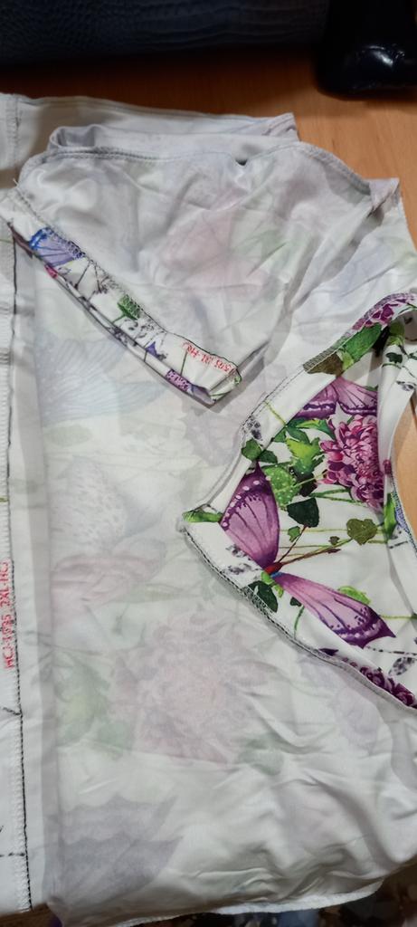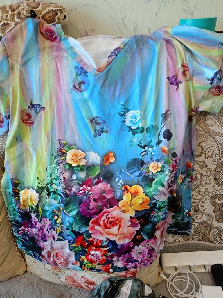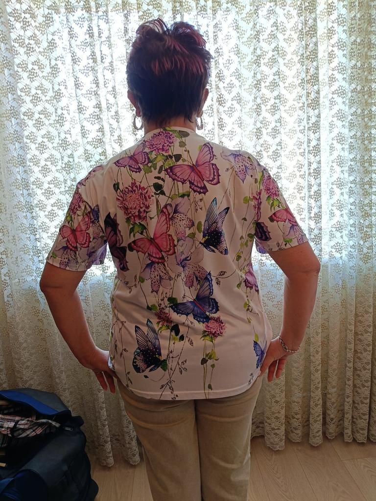 The blouse is bright, but the pattern looks as if it is blurred, it looks different than in the photo. It fits size 52 just right. I haven't worn it yet, I will see how it wears. It is sewn neatly.