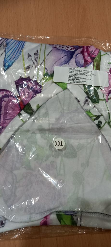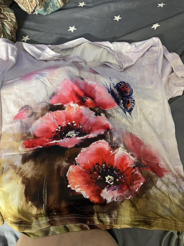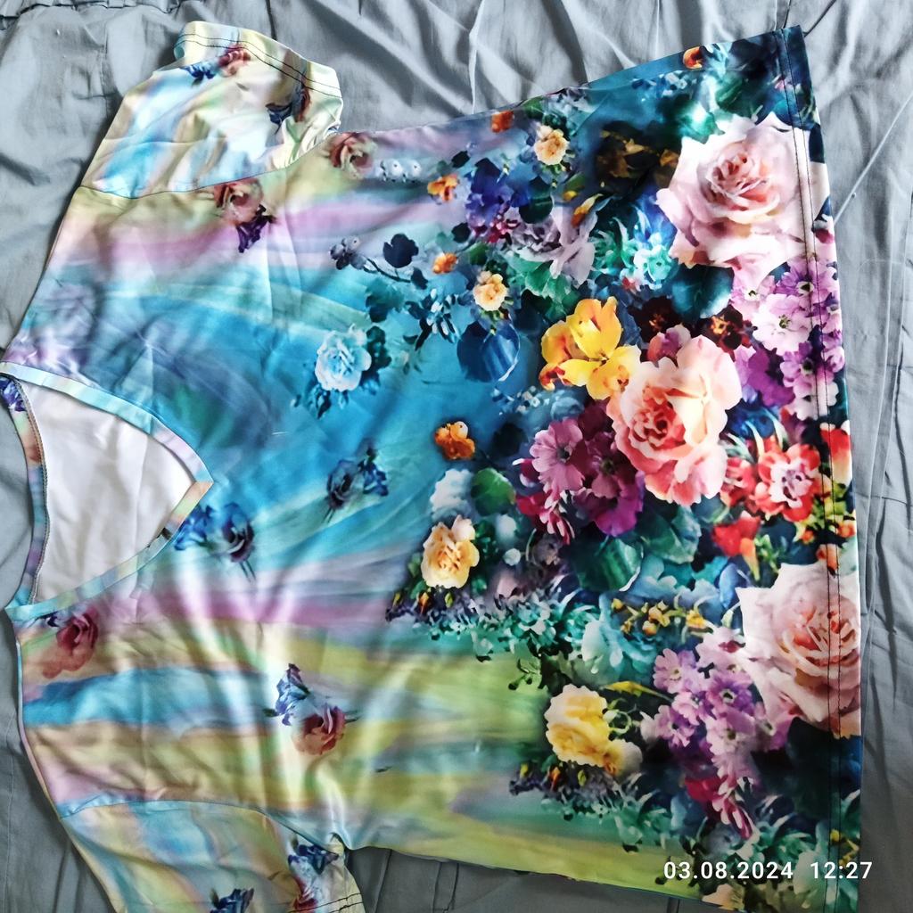 The T-shirt is bright, saturated in color, but looks a bit duller than the specimen in the photo, i.e., it lacks shine. Otherwise, it's a very cheerful summer top for walks. Sewn neatly, seams are even, without snags. Packaged in a regular bag. Recommend.