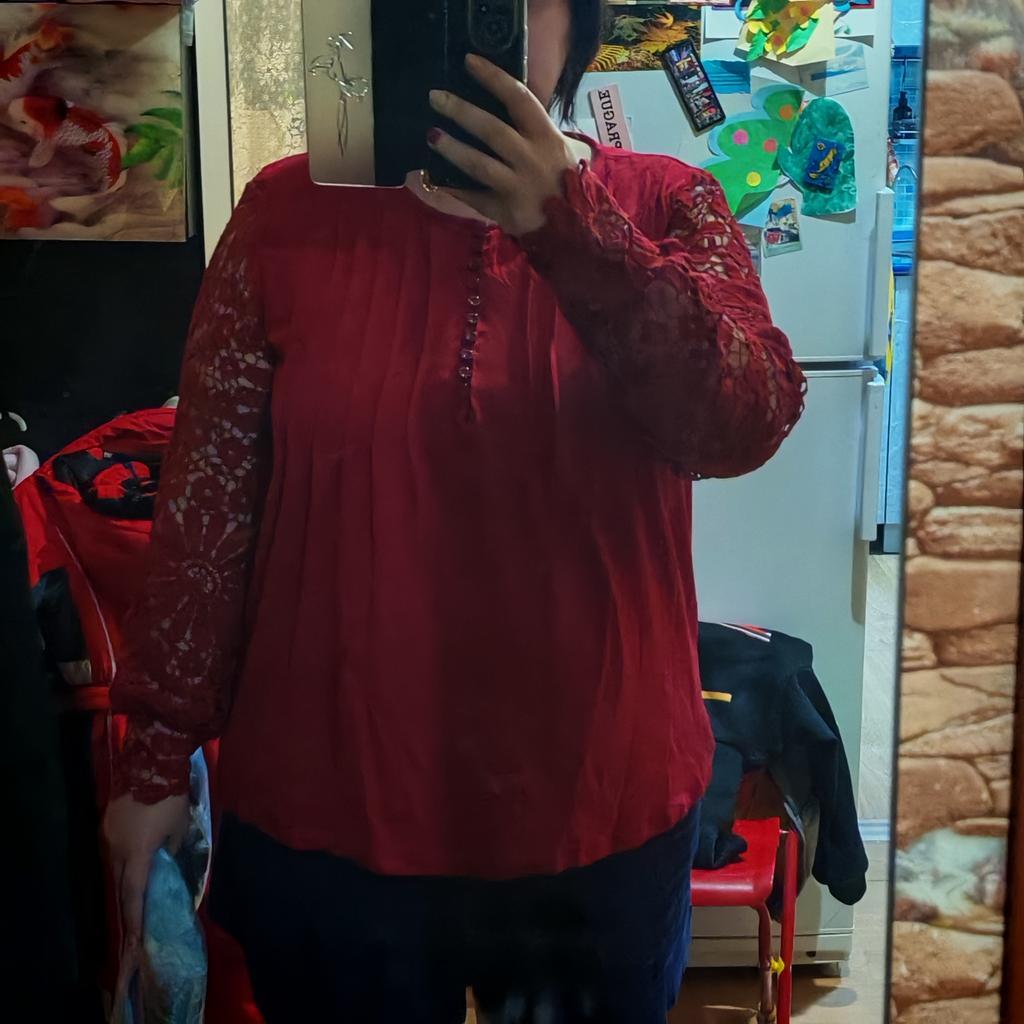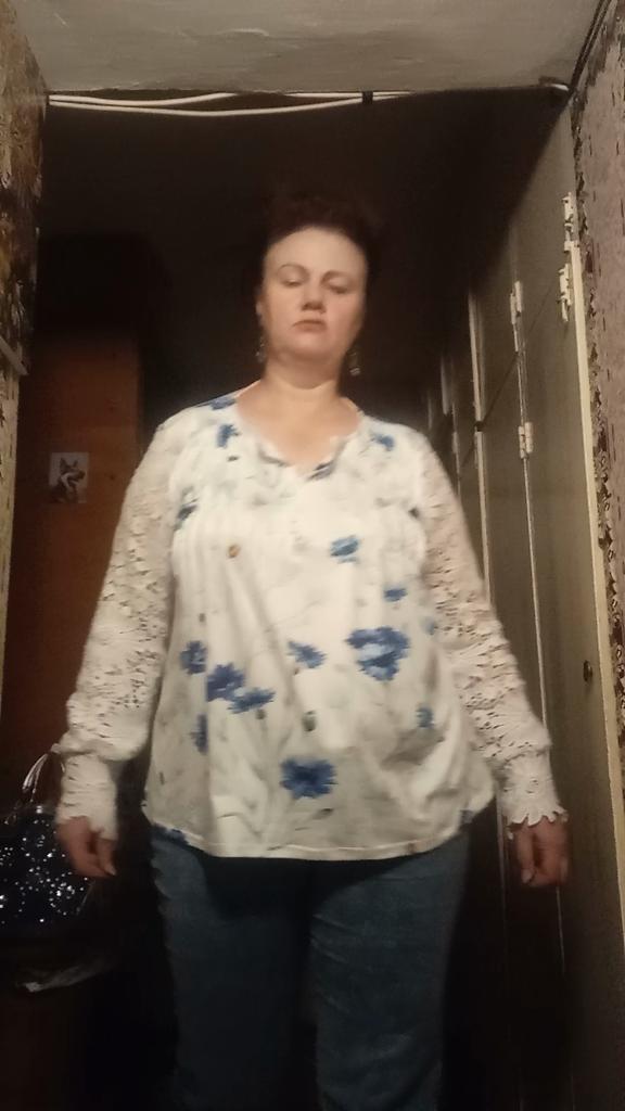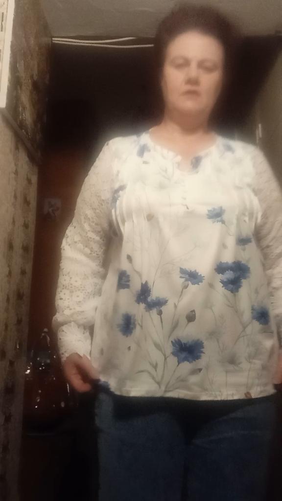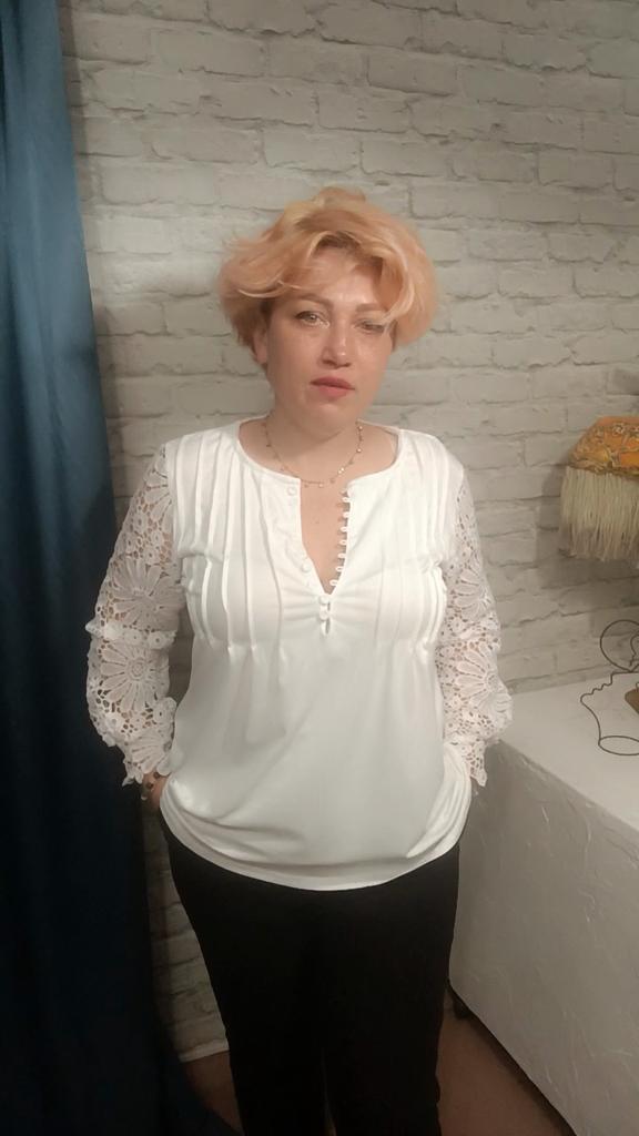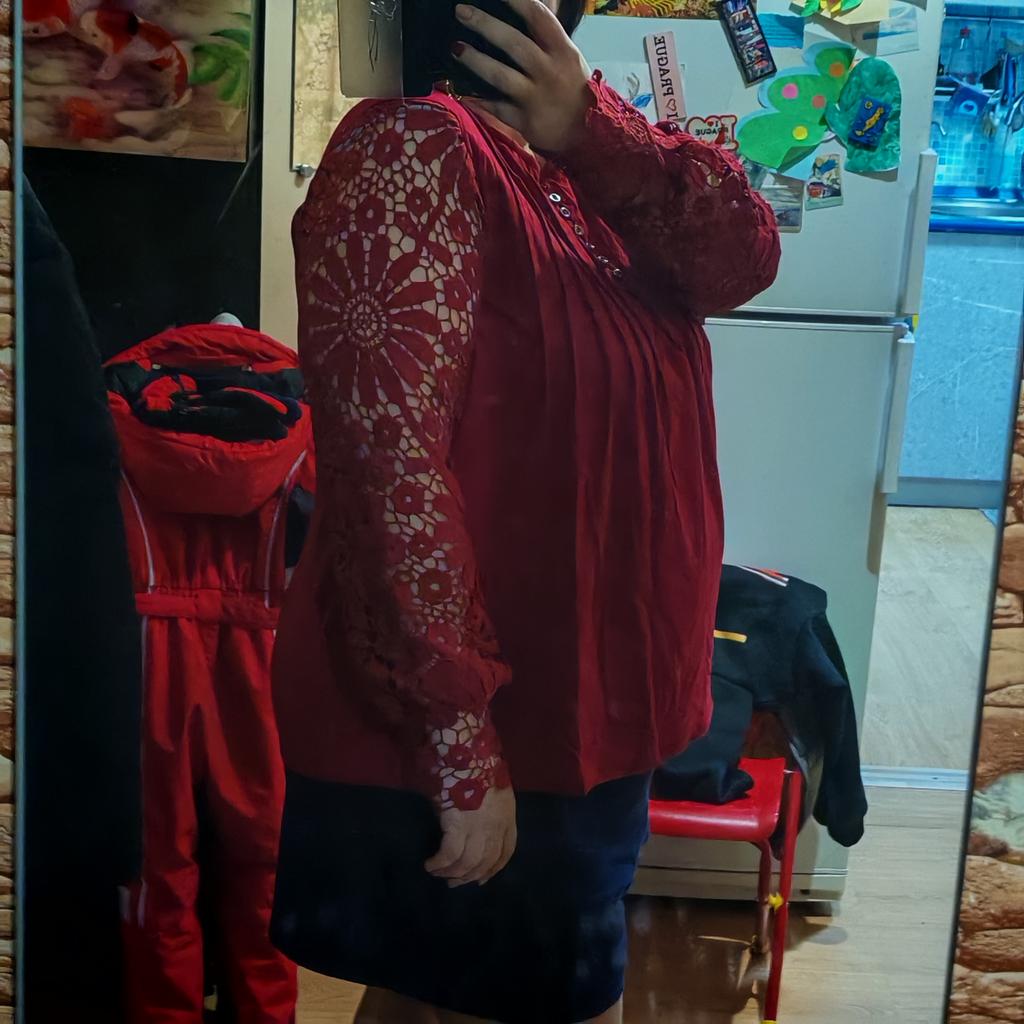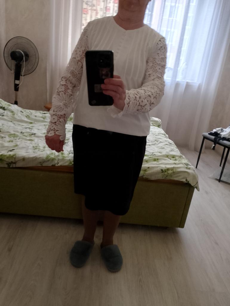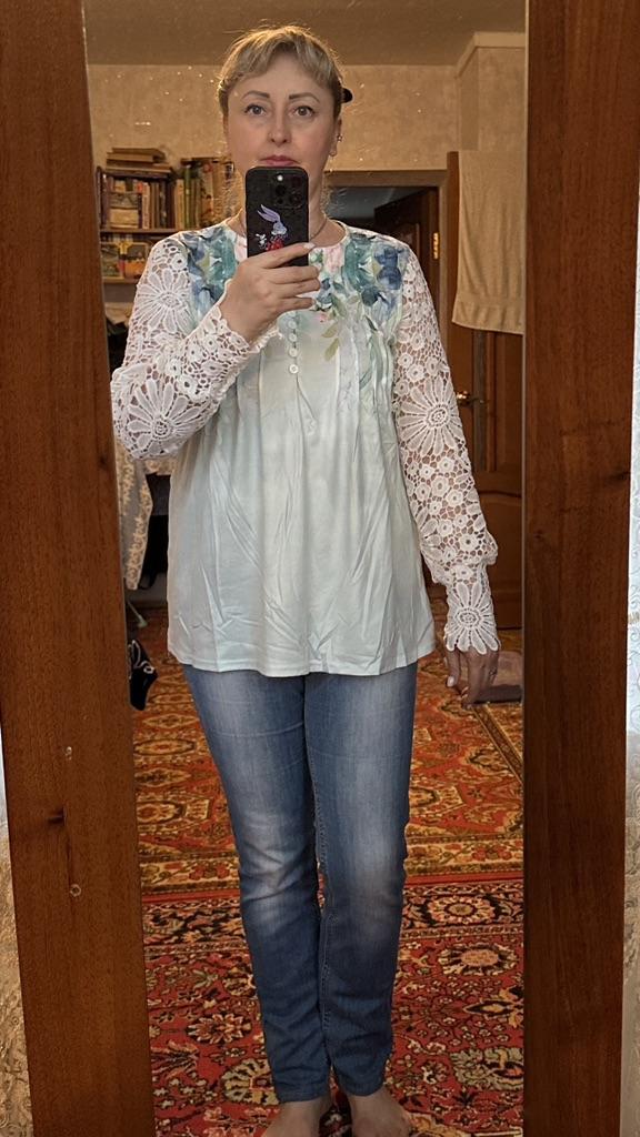 Excellent blouse. Ordered another one in a different color. Was a bit off with the size, now ordered one size smaller. I wear 54-56. The fabric is high-quality, sits beautifully. The coloring is very rich, suitable for both going out and everyday wear. Thank you!