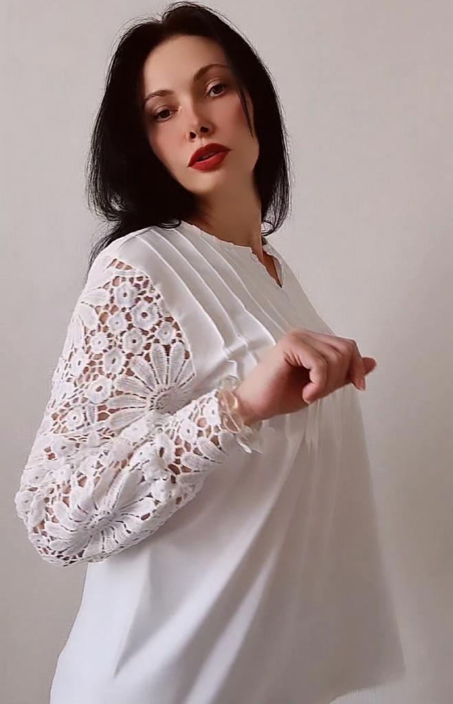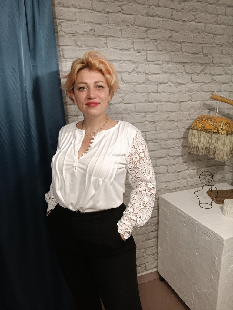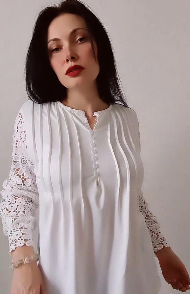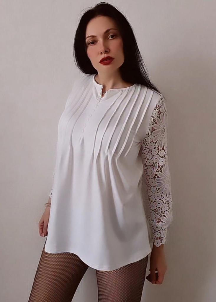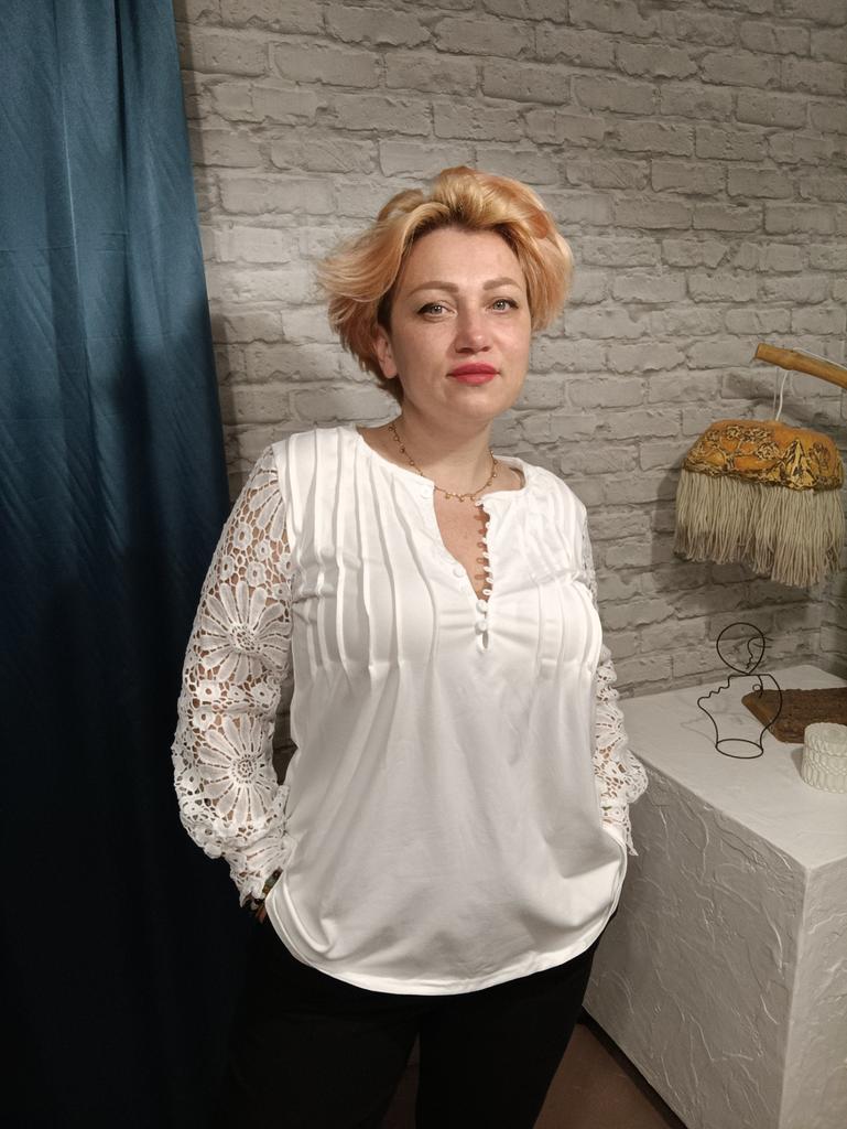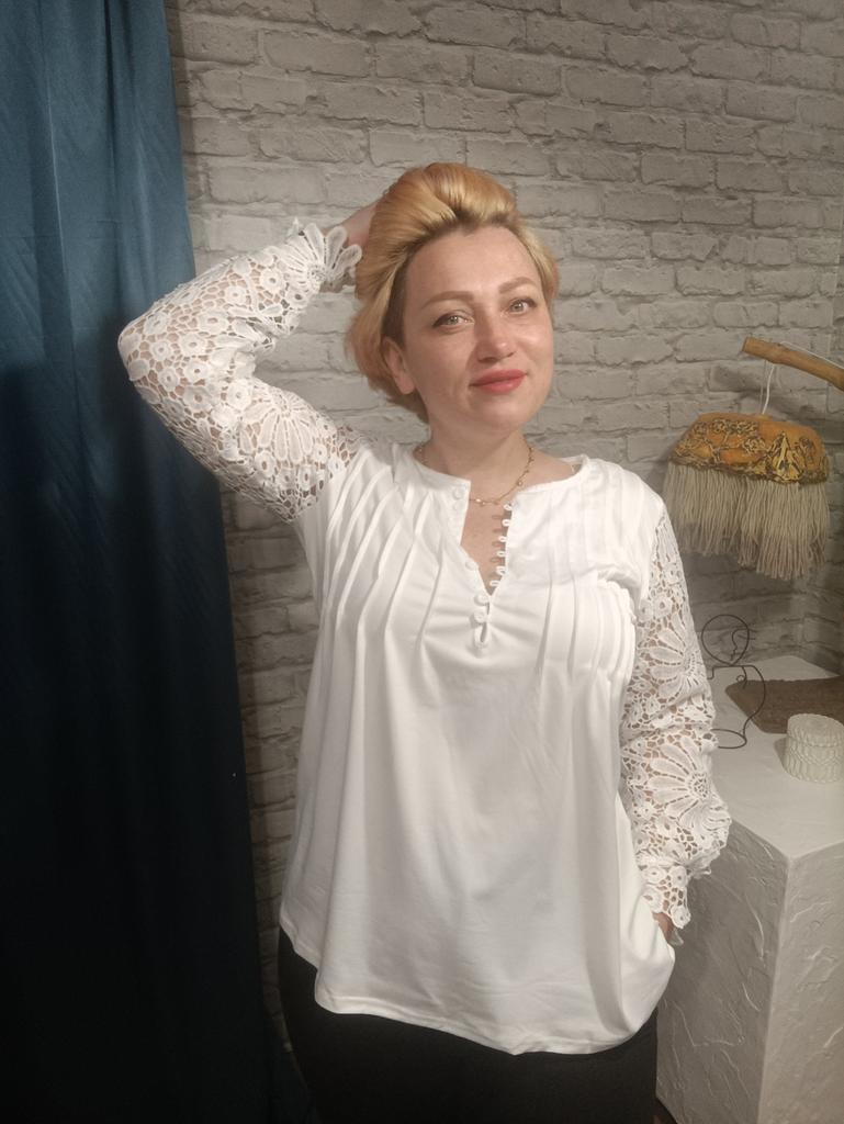 Excellent blouse. Ordered another one in a different color. Was a bit off with the size, now ordered one size smaller. I wear 54-56. The fabric is high-quality, sits beautifully. The coloring is very rich, suitable for both going out and everyday wear. Thank you!