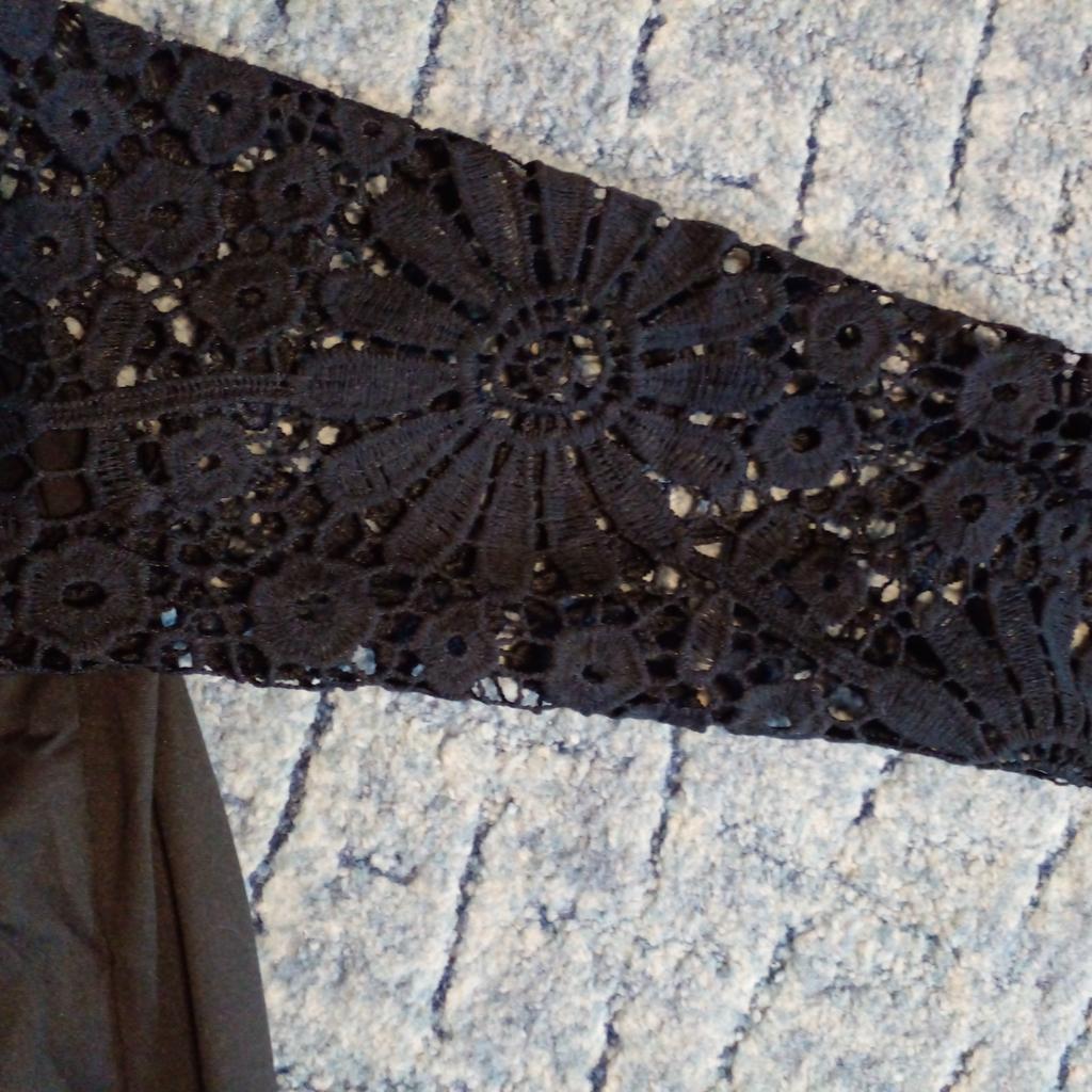 The sleeves are beautiful, but it's short and shapeless. The fabric is synthetic knit.